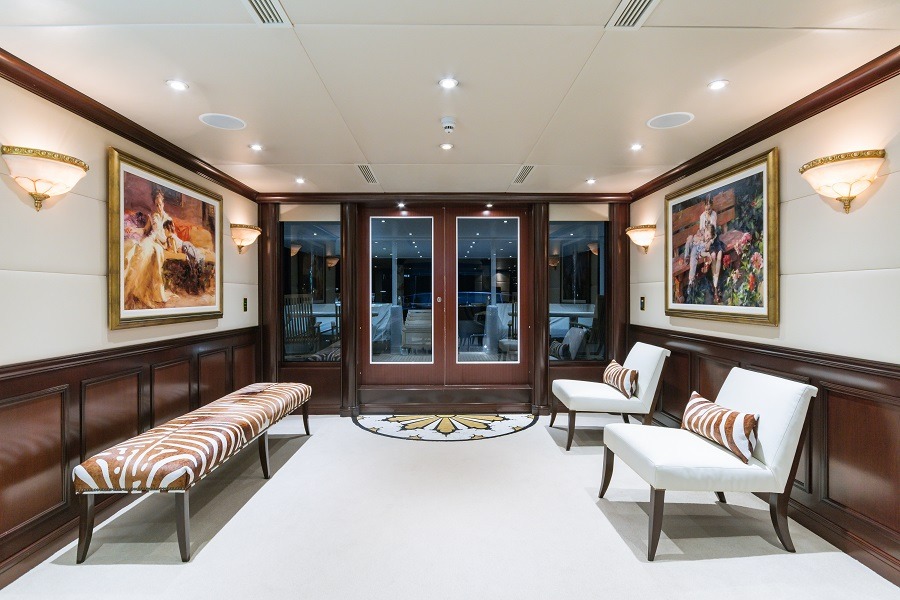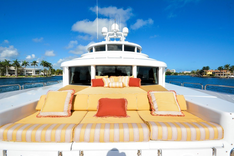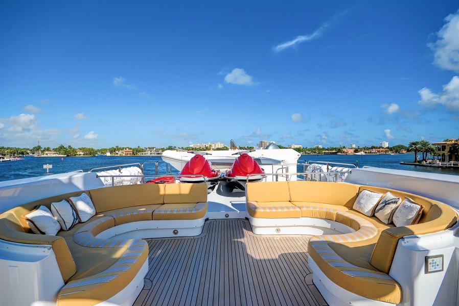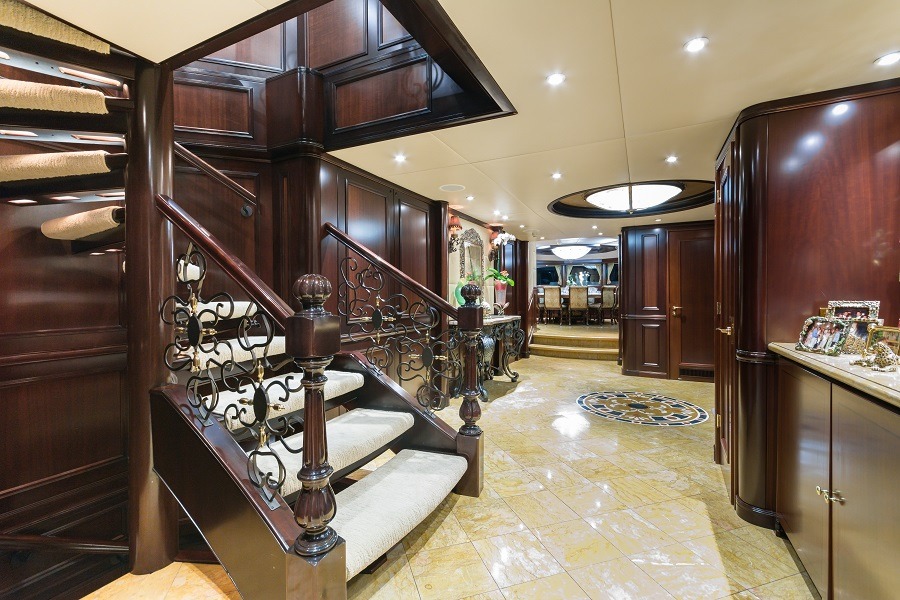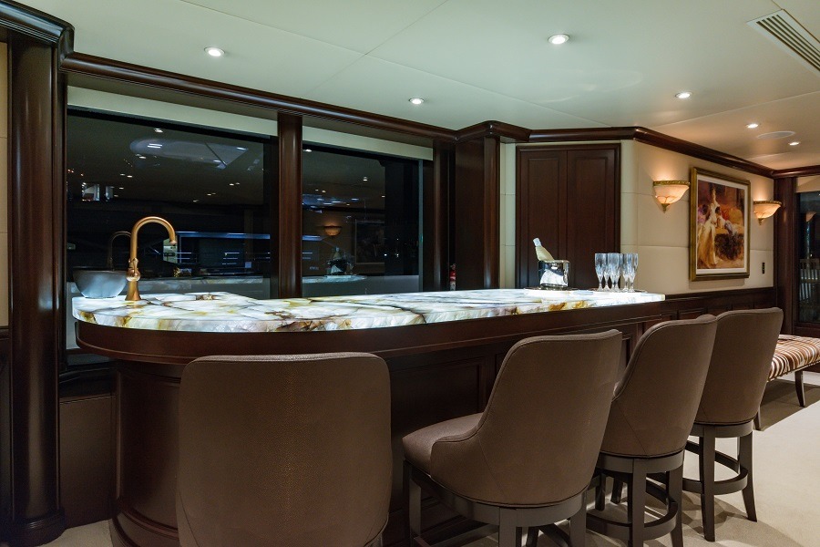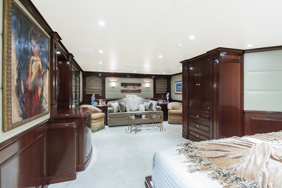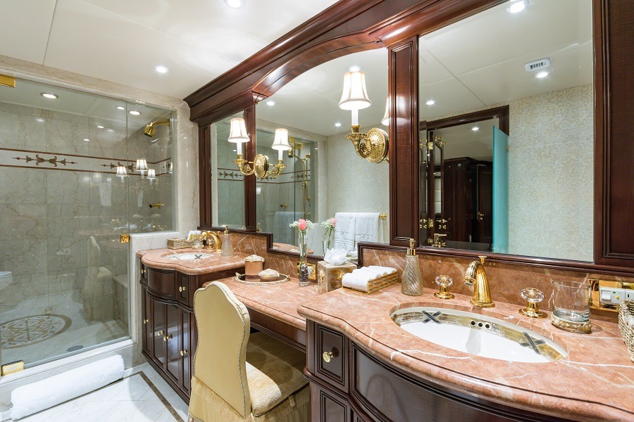 The master suite is located amidship on the lower deck and features a California King bed, full seating area with sofa and chairs, large walk-in closets with dressing area and elegant en-suite marble accented bathroom with steam shower. There are four additional staterooms aft of the Master including a Double Guest Stateroom with pullman and sofa bed, two mirrored guest staterooms set with King sized beds and a twin guest stateroom to starboard. Each stateroom is ensuite with head and shower and fully equipped with flat screen TV (with direct TV in every room), DVD and CD.