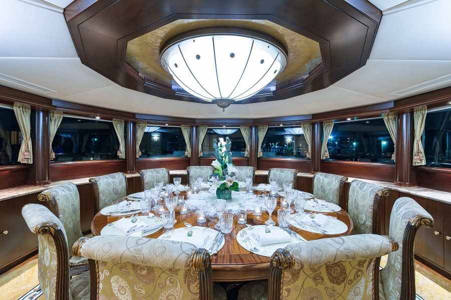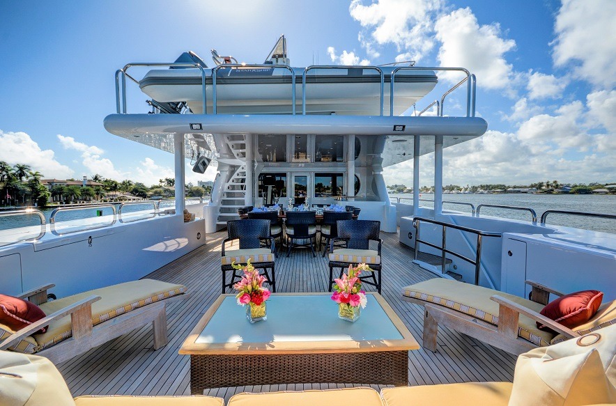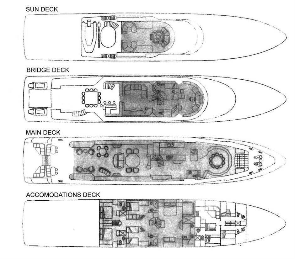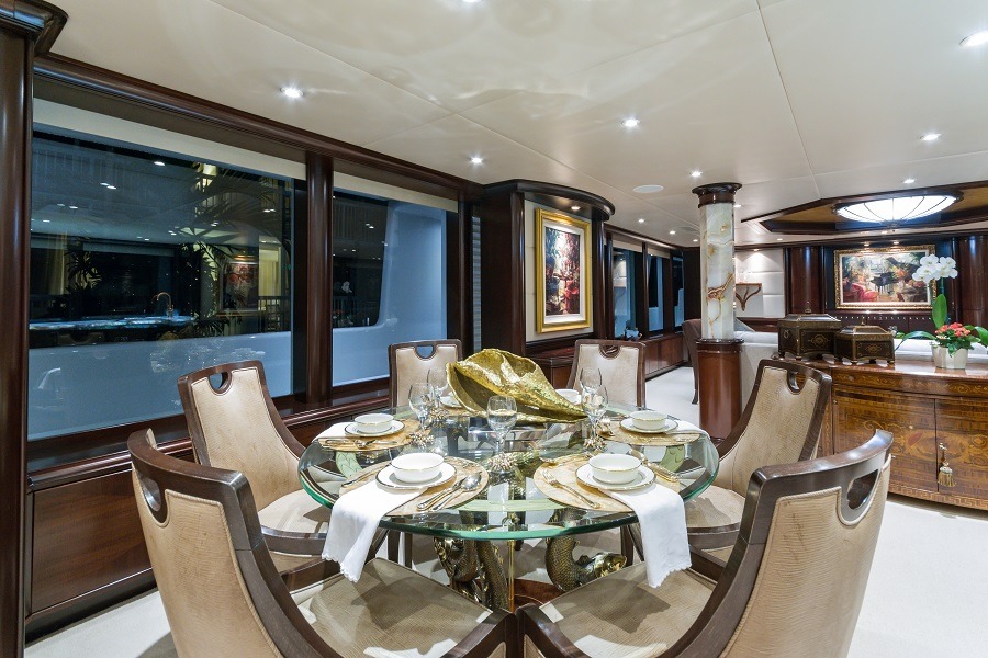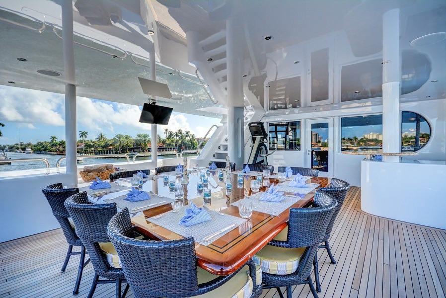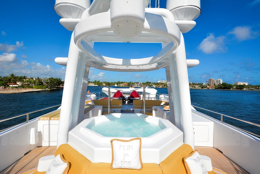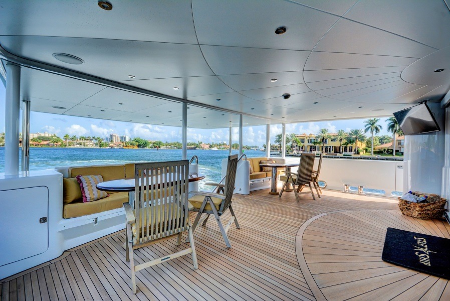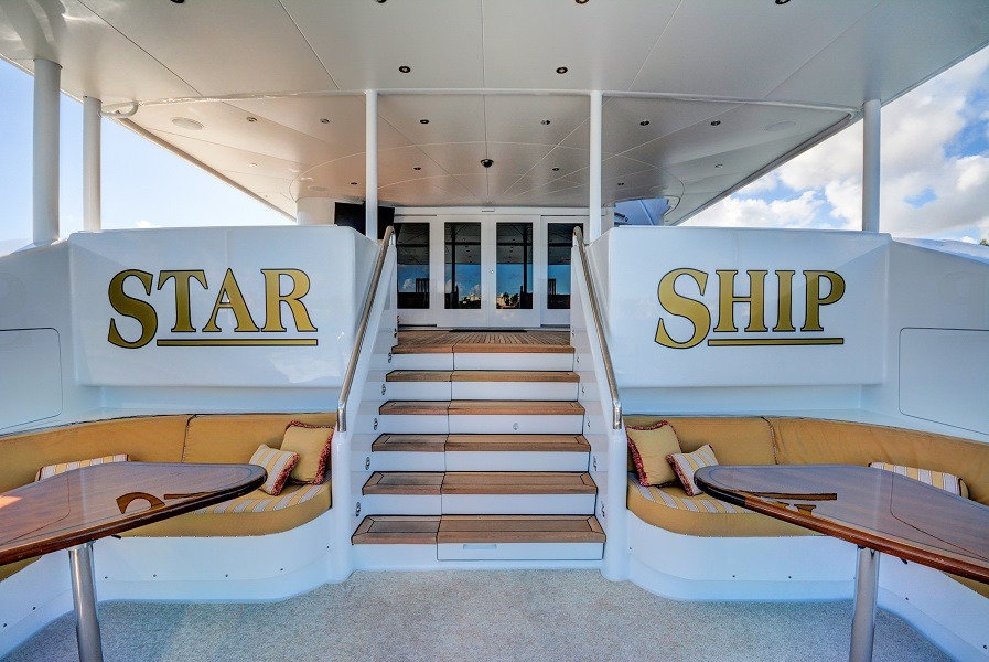 Starship's major refit in 2004 and continued upgrades, have her showing like new. She sleeps up to eleven guests in 5 staterooms each with en-suite bath. There are also an additional 2 day heads for guest use. She is decorated throughout with rich mahogany wood, elegant marble finishes, fine art and elegant soft goods. The side entrance welcomes guests into an impressive main foyer. The main salon is arranged with a full bar, two sitting areas, one area with a semi circular settee facing the 52" flat screen TV and entertainment system, the next area with inviting sofa and oversized chairs, and the most aft to port set with a game table. The private formal dining is forward with a round table which comfortably seats 10. The fine china, detailed cabinetry and superb view forward provide an intimate and memorable dining experience. The skylounge area is a great alternative for intimate cocktails and entertaining, or simply to escape to a quieter place for a bit of work at the desk or relaxation in the cozy sofa or chairs. The Master suite is located amidship on the lower deck and features a California King size bed, full seating area with sofa and chairs, large walk-in closets with dressing area and elegant en-suite marble accented bathroom with steam shower. There are four additional staterooms aft of the Master including a Queen VIP with pullman and sofa bed, two mirrored guest staterooms set with King sized beds and a Twin guest stateroom to starboard. Each stateroom is ensuite with head and shower and fully equipped with flat screen TV, DVD and CD. Aft of the skylounge is a large square al fresco dining table for 12 guests serviced by a full bar to starboard. Up one level to the flybridge deck, guests can enjoy the jacuzzi, plenty of comfortable sunning areas and seating, wet bar and surround sound music.