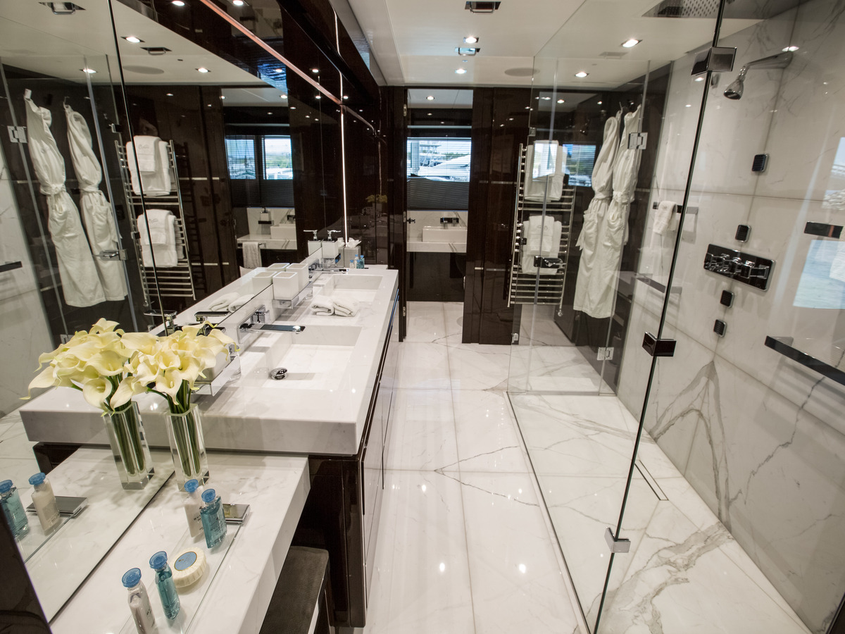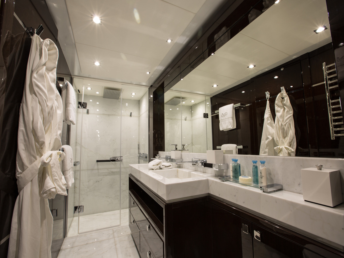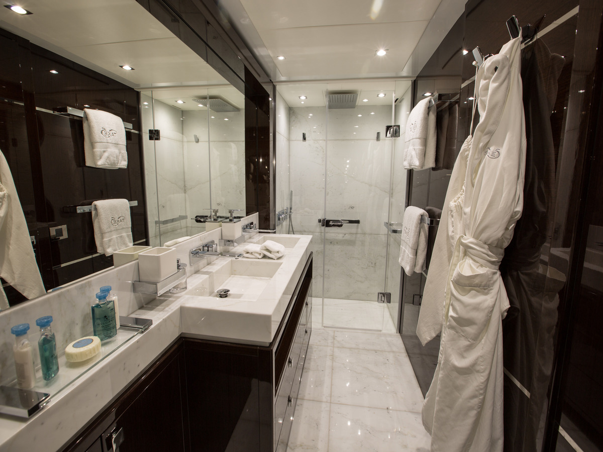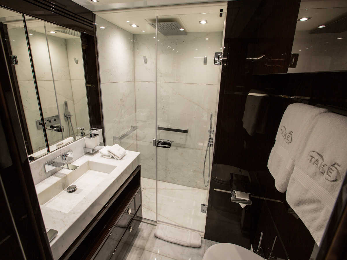 A total of 5 staterooms accommodating up to 12 guests, complimented by a professional crew of 9. All accommodations are equipped with TV & iPads, individual climate control, ORCA entertainment system, individual satellite receivers, complete blackout, iPod docking stations, reading lights, robes, slippers, hair-dryers, telephone, and Wi-Fi access. MASTER STATEROOM SUITE The Master Stateroom is situated forward on the Main Deck measuring approximately 900 sq. ft. The walk-around King bed faces forward and features an 80” flat screen TV, surround sound, cozy lounge chair to Port, desk on Stbd side. Forward access to en-suite bath. Large European rainfall shower in the middle, 2 sinks & toilet on Stbd side. The entire Master suite features large windows offering plenty of natural light with stunning views of the Sea & Sky. Safe. BELOW DECK: Access to the 4 below guest staterooms are lead by a stainless steel spiral stairwell. TAKE 5’s exquisitely decorated staterooms are positioned at water level offering tranquil views. Ample locker/storage space in all staterooms. TAKE 5 proudly offers Bulgari "au the bleu" bath products for each guest. GUEST STATEROOM #1 ~ Port Aft Features a walk around Queen size bed, 42” retractable TV. En-suite bath features a large rainfall shower. 2 sinks, toilet. Safe. GUEST STATEROOM #2 ~ Stbd Aft Features a walk around Queen size bed, 42” retractable TV. En-suite bath features a large rainfall shower. 2 sinks, toilet. Safe. GUEST STATEROOM #3 ~ Stbd Forward Features Twin beds, 42” flat screen TV. En-suite bath features a large rainfall shower, single sink, toilet. Pullman. Safe. GUEST STATEROOM #4 ~ Forward Port Features Twin beds, 42” flat screen TV. En-suite bath features a large rainfall shower, single sink, toilet. Pullman. Safe.