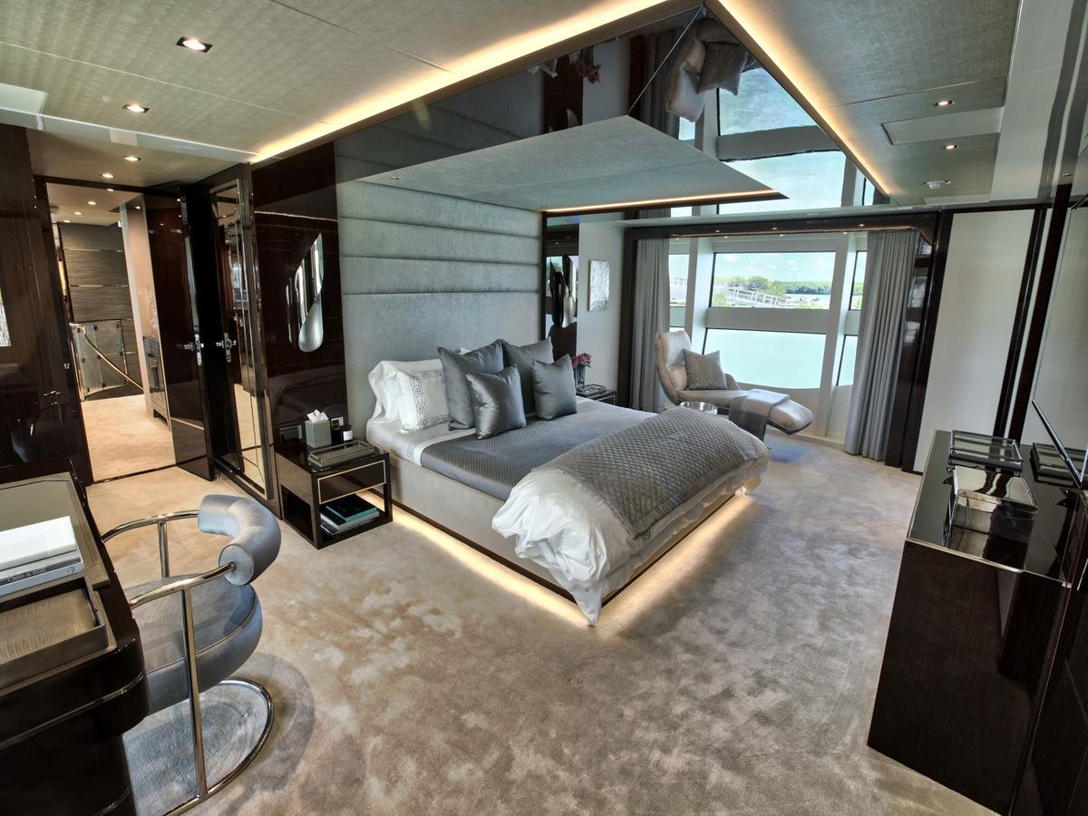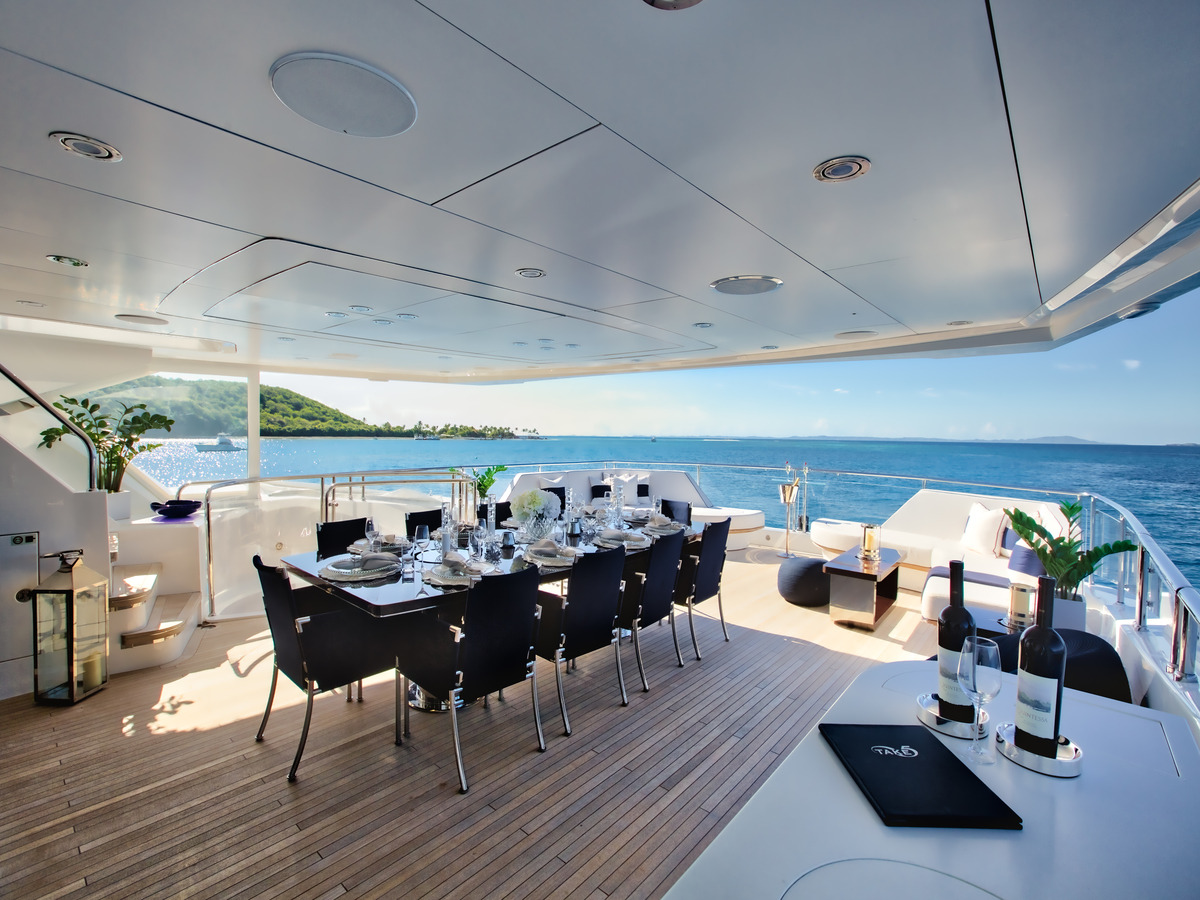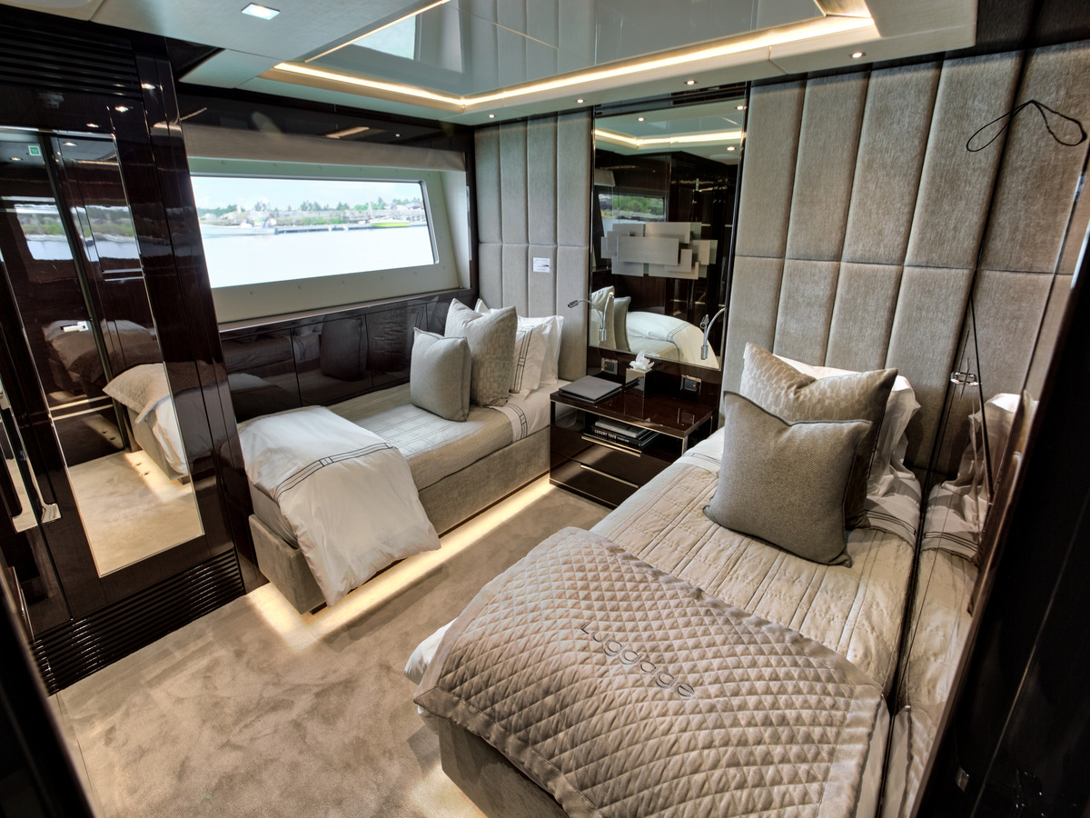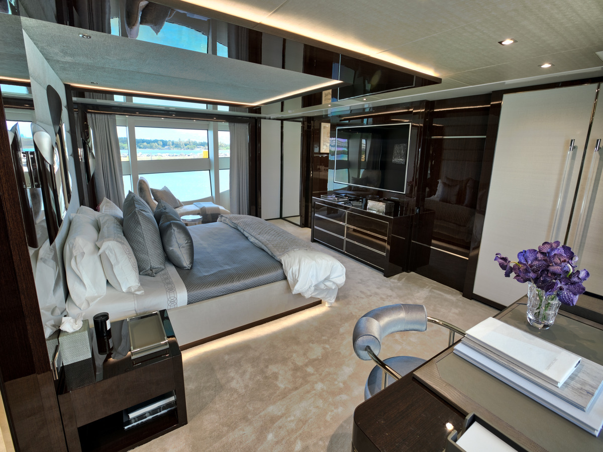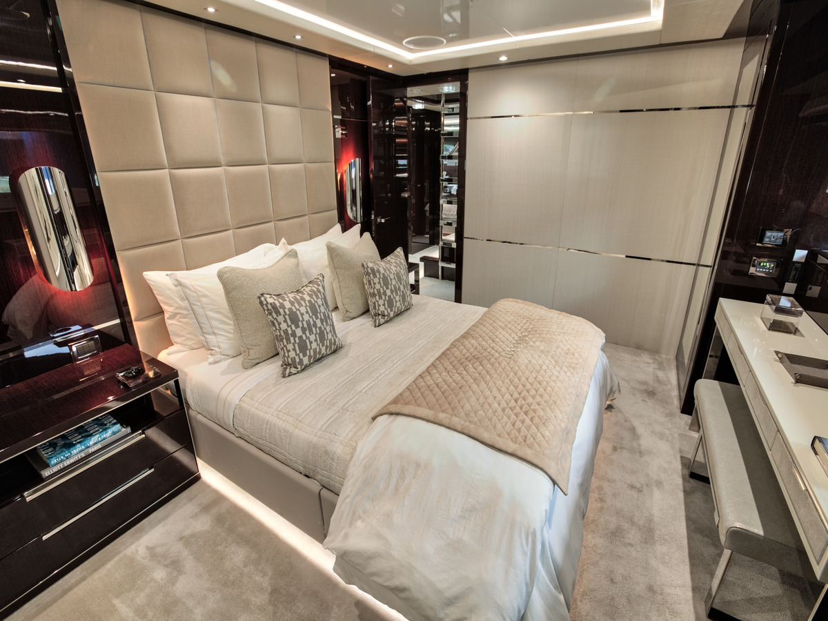 A total of 5 staterooms accommodating up to 12 guests, complimented by a professional crew of 9. All accommodations are equipped with TV & iPads, individual climate control, ORCA entertainment system, individual satellite receivers, complete blackout, iPod docking stations, reading lights, robes, slippers, hair-dryers, telephone, and Wi-Fi access. MASTER STATEROOM SUITE The Master Stateroom is situated forward on the Main Deck measuring approximately 900 sq. ft. The walk-around King bed faces forward and features an 80” flat screen TV, surround sound, cozy lounge chair to Port, desk on Stbd side. Forward access to en-suite bath. Large European rainfall shower in the middle, 2 sinks & toilet on Stbd side. The entire Master suite features large windows offering plenty of natural light with stunning views of the Sea & Sky. Safe. BELOW DECK: Access to the 4 below guest staterooms are lead by a stainless steel spiral stairwell. TAKE 5’s exquisitely decorated staterooms are positioned at water level offering tranquil views. Ample locker/storage space in all staterooms. TAKE 5 proudly offers Bulgari "au the bleu" bath products for each guest. GUEST STATEROOM #1 ~ Port Aft Features a walk around Queen size bed, 42” retractable TV. En-suite bath features a large rainfall shower. 2 sinks, toilet. Safe. GUEST STATEROOM #2 ~ Stbd Aft Features a walk around Queen size bed, 42” retractable TV. En-suite bath features a large rainfall shower. 2 sinks, toilet. Safe. GUEST STATEROOM #3 ~ Stbd Forward Features Twin beds, 42” flat screen TV. En-suite bath features a large rainfall shower, single sink, toilet. Pullman. Safe. GUEST STATEROOM #4 ~ Forward Port Features Twin beds, 42” flat screen TV. En-suite bath features a large rainfall shower, single sink, toilet. Pullman. Safe.