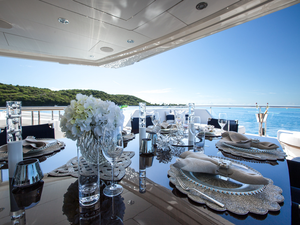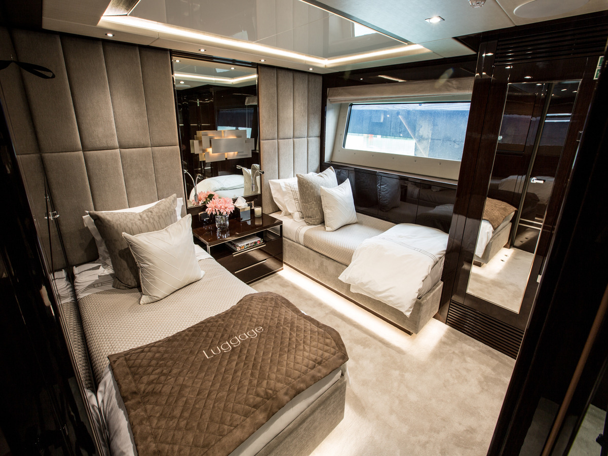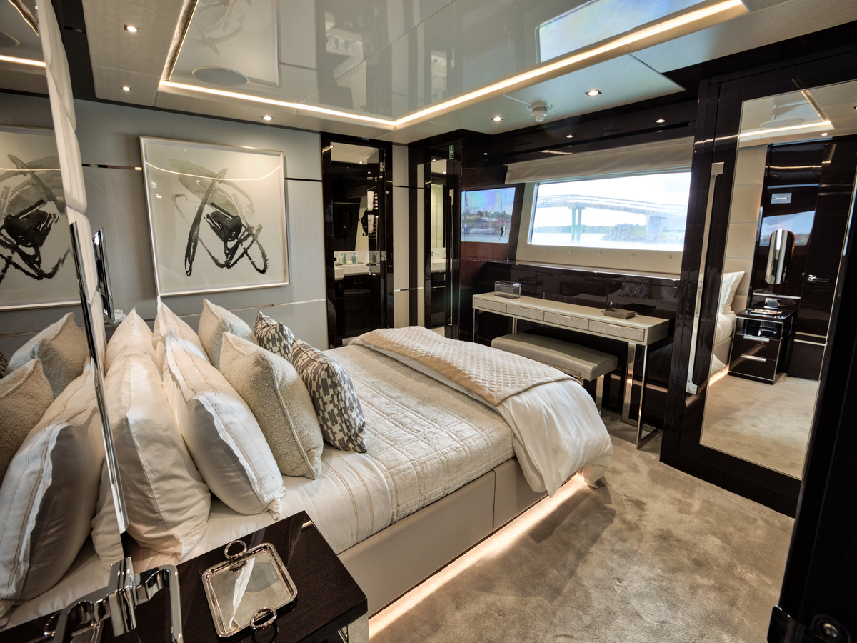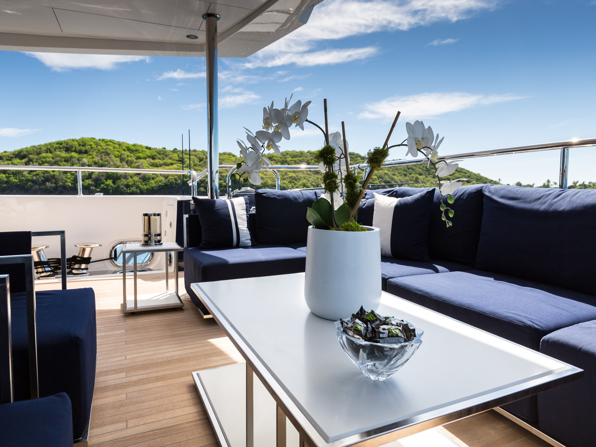 A total of 5 staterooms accommodating up to 12 guests, complimented by a professional crew of 9. All accommodations are equipped with TV & iPads, individual climate control, ORCA entertainment system, individual satellite receivers, complete blackout, iPod docking stations, reading lights, robes, slippers, hair-dryers, telephone, and Wi-Fi access. MASTER STATEROOM SUITE The Master Stateroom is situated forward on the Main Deck measuring approximately 900 sq. ft. The walk-around King bed faces forward and features an 80” flat screen TV, surround sound, cozy lounge chair to Port, desk on Stbd side. Forward access to en-suite bath. Large European rainfall shower in the middle, 2 sinks & toilet on Stbd side. The entire Master suite features large windows offering plenty of natural light with stunning views of the Sea & Sky. Safe. BELOW DECK: Access to the 4 below guest staterooms are lead by a stainless steel spiral stairwell. TAKE 5’s exquisitely decorated staterooms are positioned at water level offering tranquil views. Ample locker/storage space in all staterooms. TAKE 5 proudly offers Bulgari "au the bleu" bath products for each guest. GUEST STATEROOM #1 ~ Port Aft Features a walk around Queen size bed, 42” retractable TV. En-suite bath features a large rainfall shower. 2 sinks, toilet. Safe. GUEST STATEROOM #2 ~ Stbd Aft Features a walk around Queen size bed, 42” retractable TV. En-suite bath features a large rainfall shower. 2 sinks, toilet. Safe. GUEST STATEROOM #3 ~ Stbd Forward Features Twin beds, 42” flat screen TV. En-suite bath features a large rainfall shower, single sink, toilet. Pullman. Safe. GUEST STATEROOM #4 ~ Forward Port Features Twin beds, 42” flat screen TV. En-suite bath features a large rainfall shower, single sink, toilet. Pullman. Safe.