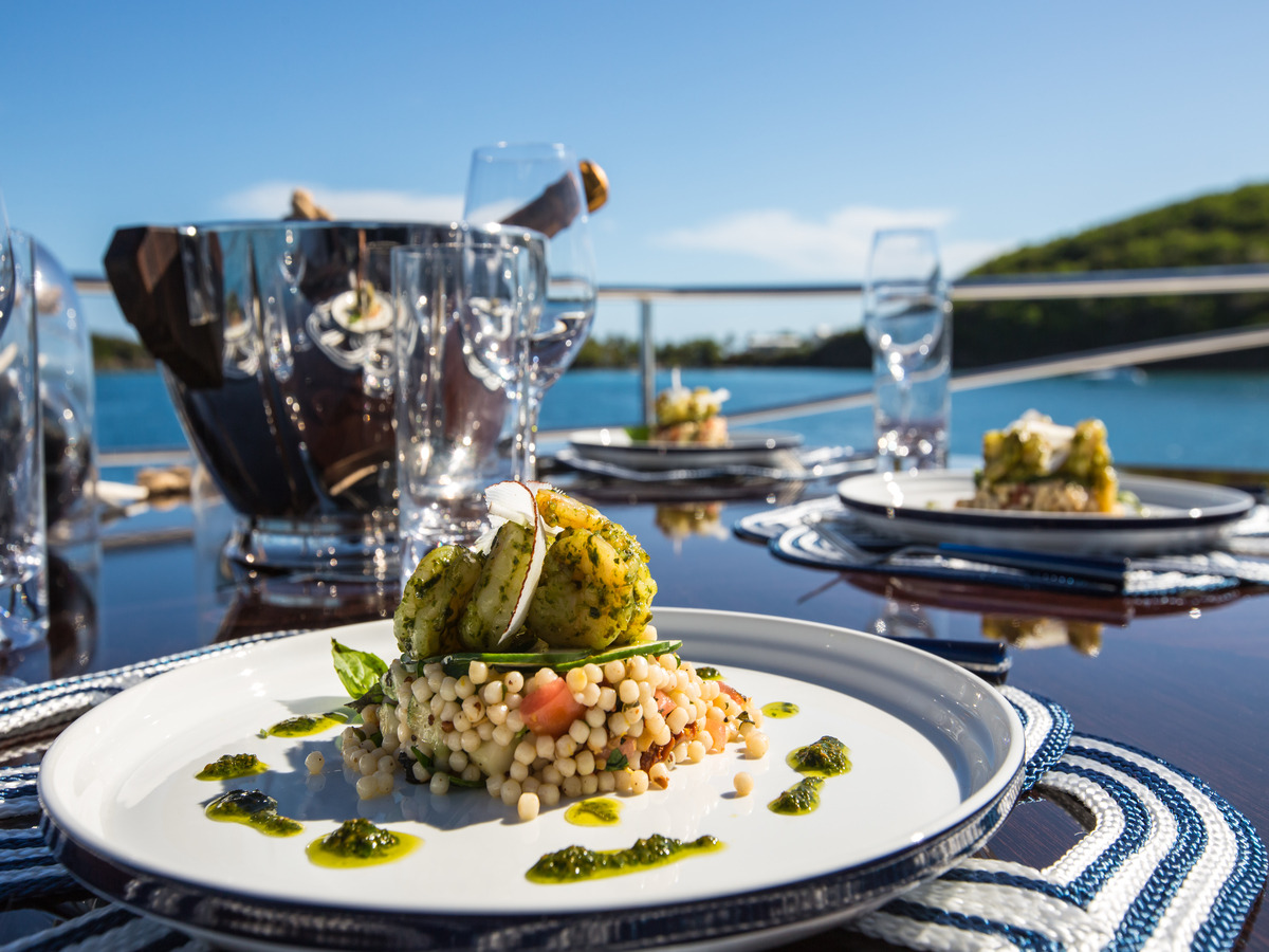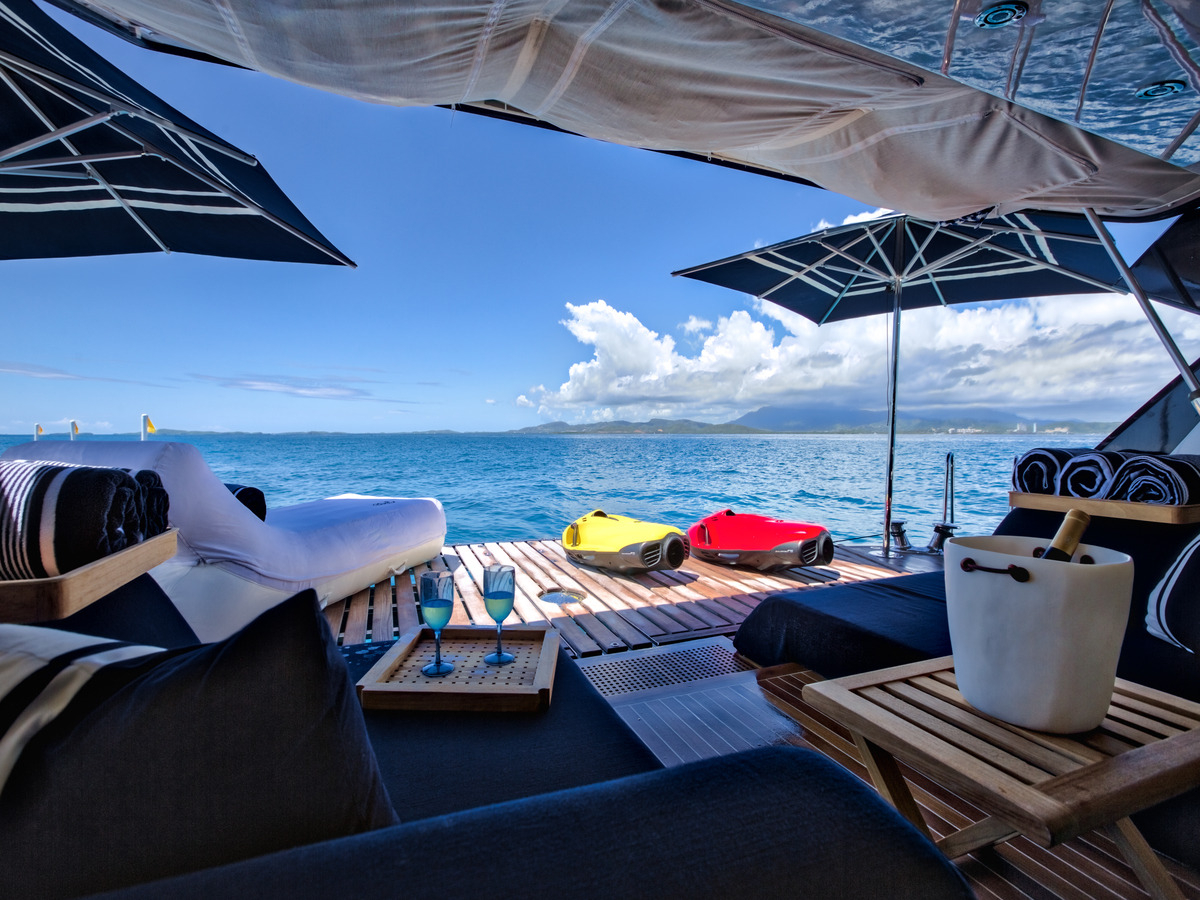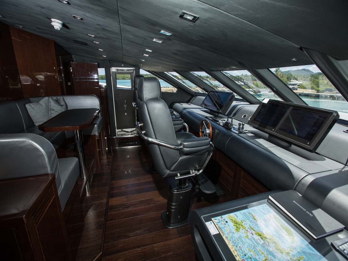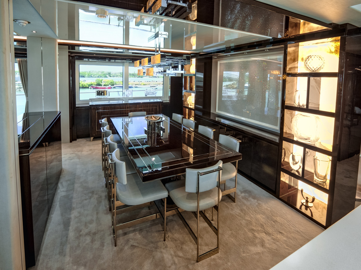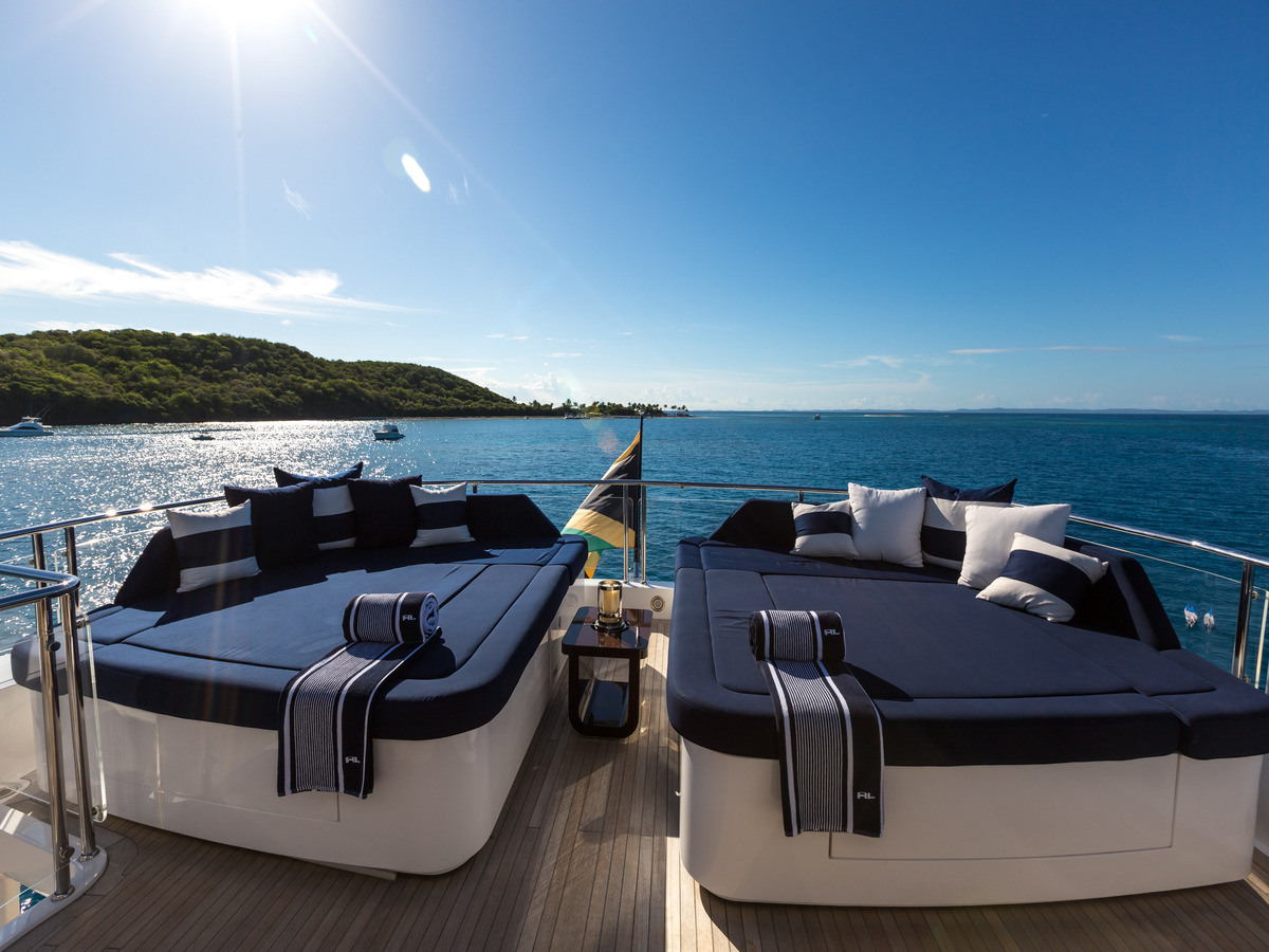 A total of 5 staterooms accommodating up to 12 guests, complimented by a professional crew of 9. All accommodations are equipped with TV & iPads, individual climate control, ORCA entertainment system, individual satellite receivers, complete blackout, iPod docking stations, reading lights, robes, slippers, hair-dryers, telephone, and Wi-Fi access. MASTER STATEROOM SUITE The Master Stateroom is situated forward on the Main Deck measuring approximately 900 sq. ft. The walk-around King bed faces forward and features an 80” flat screen TV, surround sound, cozy lounge chair to Port, desk on Stbd side. Forward access to en-suite bath. Large European rainfall shower in the middle, 2 sinks & toilet on Stbd side. The entire Master suite features large windows offering plenty of natural light with stunning views of the Sea & Sky. Safe. BELOW DECK: Access to the 4 below guest staterooms are lead by a stainless steel spiral stairwell. TAKE 5’s exquisitely decorated staterooms are positioned at water level offering tranquil views. Ample locker/storage space in all staterooms. TAKE 5 proudly offers Bulgari "au the bleu" bath products for each guest. GUEST STATEROOM #1 ~ Port Aft Features a walk around Queen size bed, 42” retractable TV. En-suite bath features a large rainfall shower. 2 sinks, toilet. Safe. GUEST STATEROOM #2 ~ Stbd Aft Features a walk around Queen size bed, 42” retractable TV. En-suite bath features a large rainfall shower. 2 sinks, toilet. Safe. GUEST STATEROOM #3 ~ Stbd Forward Features Twin beds, 42” flat screen TV. En-suite bath features a large rainfall shower, single sink, toilet. Pullman. Safe. GUEST STATEROOM #4 ~ Forward Port Features Twin beds, 42” flat screen TV. En-suite bath features a large rainfall shower, single sink, toilet. Pullman. Safe.