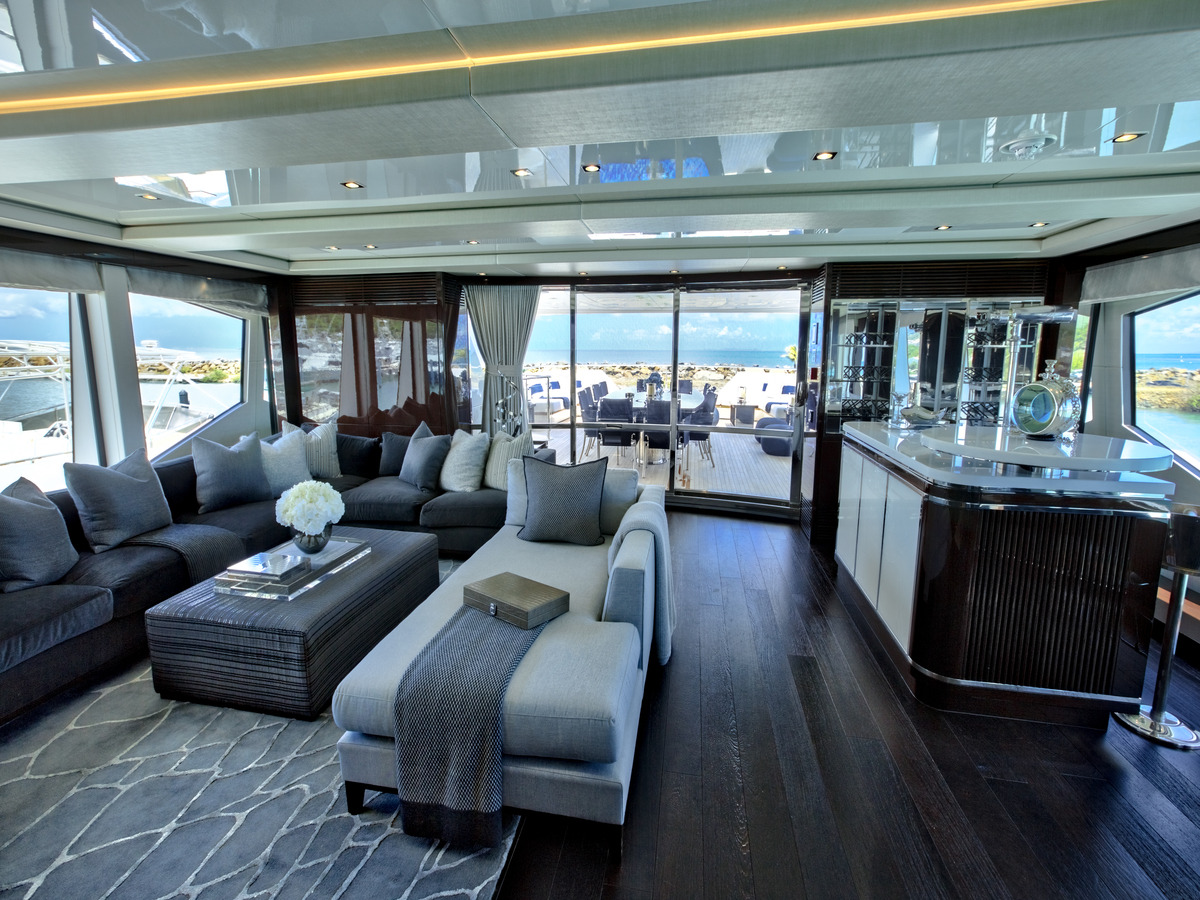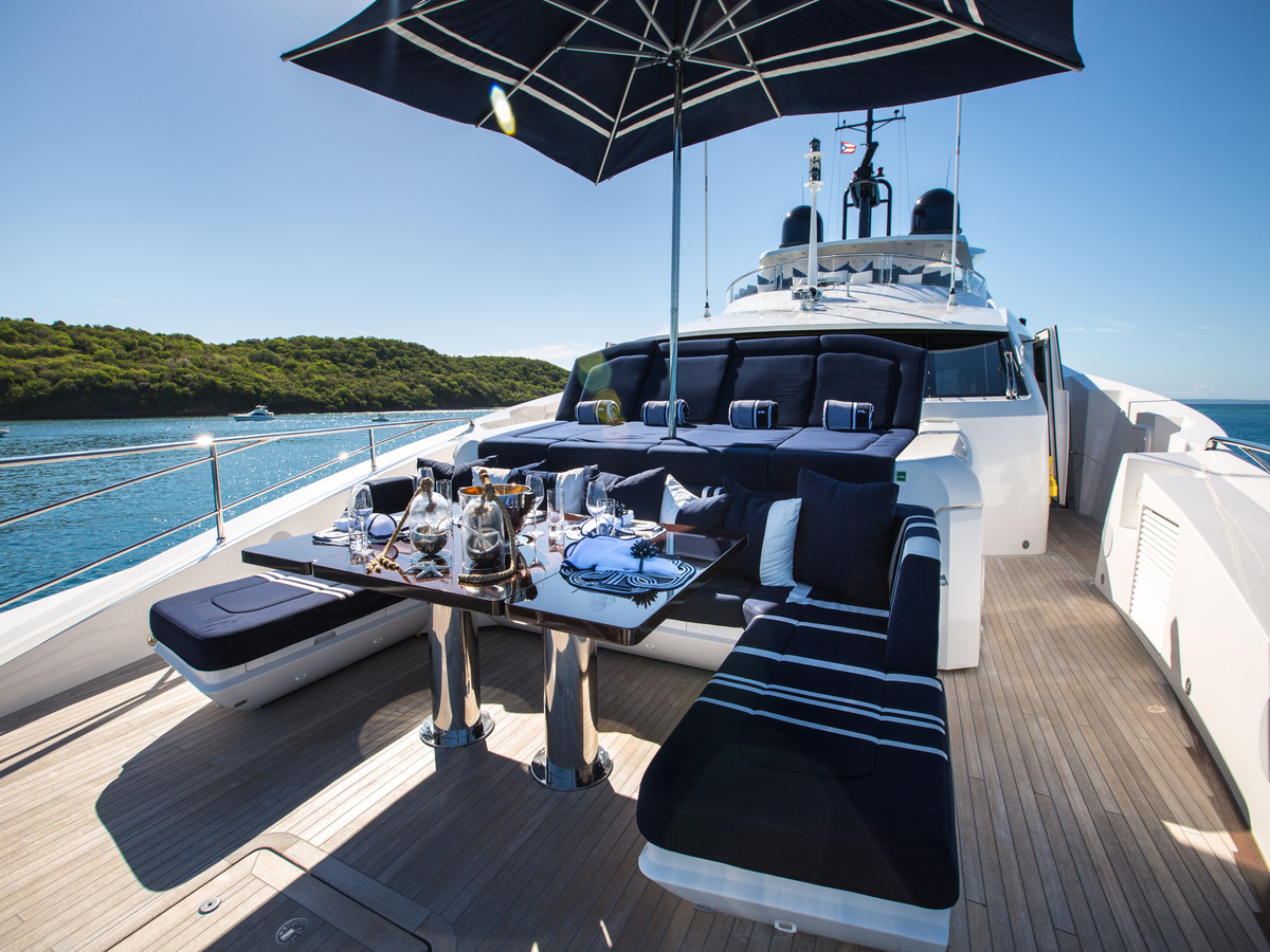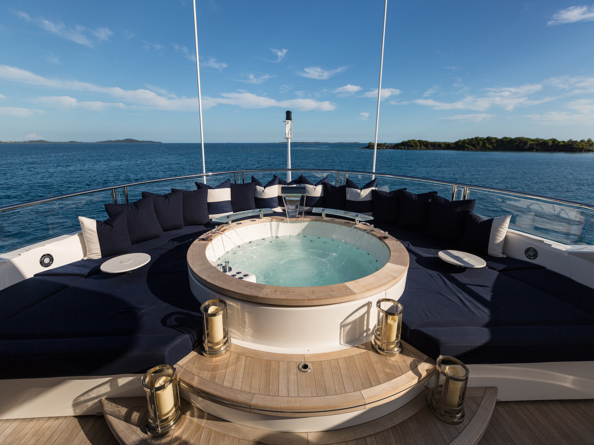 Tenders & Toys: 34’ Nortec towed tender 2 x 400hp engines 18’ Williams Tender 180hp Waterslide 2 two-person Sea-Doo Jet Skis: 1 x 2 seater RXP model, 1 x 3 seater GTIR model *Floating Sea-Doo Jet Ski dock so Sea-Doos are readily available for guests 2 Seabobs 4 x Stand-up inflatable paddle boards & 2 elliptical paddle boards 1 x Inflatable 2 person kayak Wakeboards & Kneeboards Towable toys Fun Floating Oasis Floating Splash Pad “Yacht Golf” PVC with special netting Snorkeling gear (adults & children) Assorted fishing equipment Basketball hoop on Sundeck Bocce Ball Rendezvous diving only Drone Exercise Equipment: Treadmill Yoga mats Free weights Massage table Audio Visual Equipment and Deck Facilities: MAIN SALON Elegant, luxury at its finest, glamorous decor. Ample lounge areas. 80" flat screen retractable TV with surround sound. Dayhead forward on Stbd side. Easy "1 touch button" for access to Aft Deck. Six floor to ceiling windows offering fantastic views. MAIN AFT DECK Aft settee lounge seating with table for cocktails. Access to Beach Club & Skylounge Deck. Below the Aft Deck is TAKE 5's Beach Club which houses all the water toys. This is a multipurpose activity center that can be converted into a recreational area when all the water toys are out at sea. The massive swim platform serves as an extra deck near the water level, and a place for the crew to setup a private beach club. SKYLOUNGE Ample lounge spaces with 3 large couches. Full bar. 103" flat screen TV. Dayhead on Port side, Stew pantry with dumbwaiter. Massive windows offering sweeping views. "Zen-like" custom wall fountain. Game table for 4. Easy "1 touch button" for access to Skylounge Deck & Main Aft Deck. SKYLOUNGE DECK Alfresco dining for 12 on a stunning teak table. Chic lounge area Aft. Optional awning is available for extra shade. SUN DECK DREW’s massive Sun Deck is divided into 2 sections: AFT: 2 GIANT sunpads with optional sun triangle shading. FORWARD: Large bar with bar stool seating for 2. Port settee casual dining & cocktails for 10. 42” flat screen TV. Jacuzzi perfectly positioned all the way forward for sensational views. PORTUGUESE DECK Massive U-shaped settee dining for 8. Large sun pad behind. Communications: VSAT WiFi Satellite phone Satellite TV Cell phone