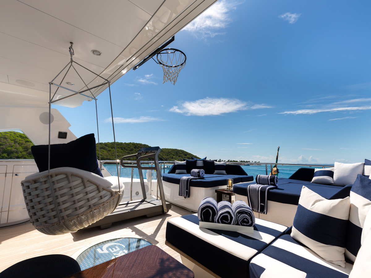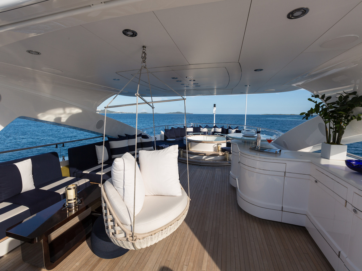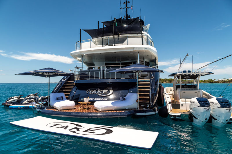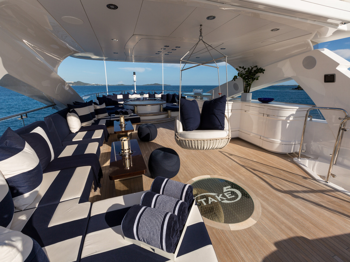 Built in 2016 by Sunseeker, the 131-foot (39.93m) charter yacht TAKE 5 is seductive, elegant and luxury at its finest. TAKE 5 features three spacious decks for guests to enjoy. Outside her aft deck, skylounge deck and sundeck offer guest a variety of dining options, lounge areas and sunpads to soak up the sun. Her main salon and skylounge are elegant luxury at its finest with glamorous décor, ample lounge areas and massive windows that offer charter guests stunning views of their charter destination. Charter yacht TAKE 5 accommodates up to 12 guests in five stylishly seductive staterooms. Her 900-square-foot master stateroom is forward on the main deck and provides a luxurious private oasis featuring a walk-around king bed and en-suite with a large European rainfall shower and dual sinks. TAKE 5 is a wonderful charter yacht for families as below deck she has two queen staterooms and the two twin-bed staterooms each with a Pullman. Guest staterooms are exquisitely decorated and positioned at water level offering charter guests tranquil views. Each stateroom is accompanied with a private en-suite bathroom that offers Bulgari “au the bleu” bath products for all guests. TAKE 5 offers numerous toys for guests to enjoy on board and on the water. Her multi-functional beach club houses the water toys and can be converted into a recreational area when all the water toys are out at sea. TAKE 5 has been meticulously maintained to the highest of standards since being built in 2016 and will continue to be kept in pristine condition for years to come with the current owner and crew of nine.