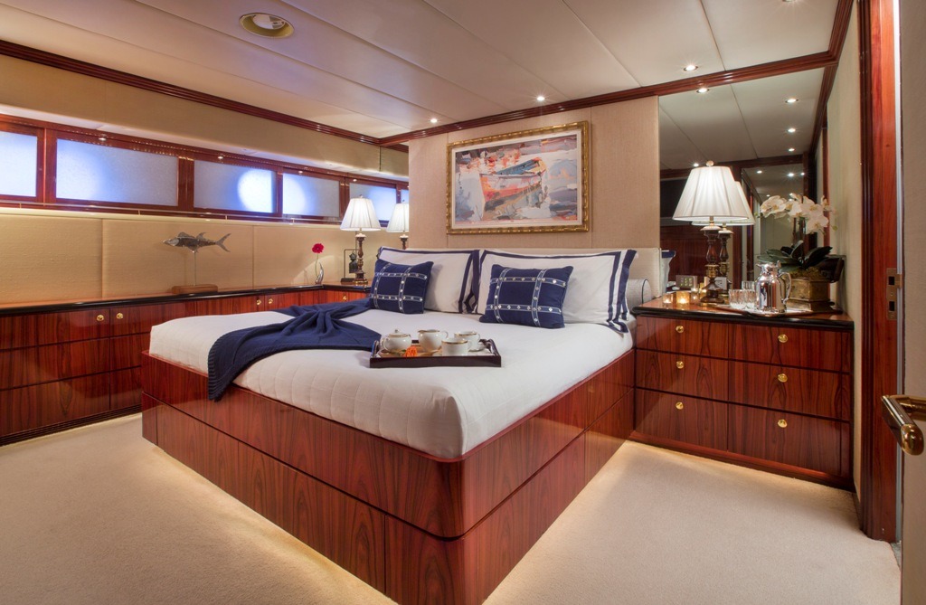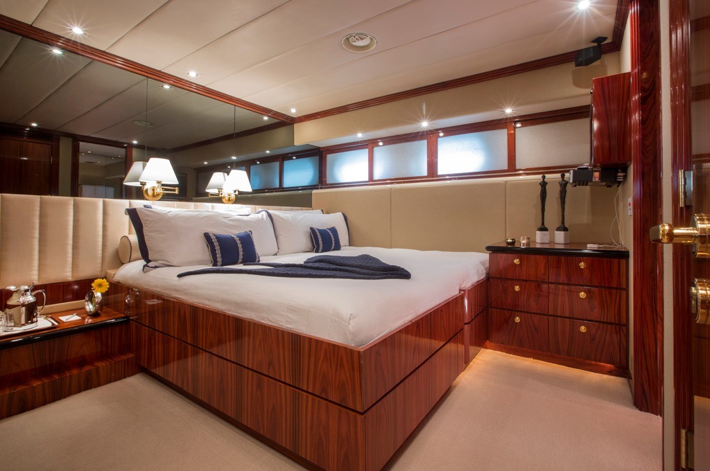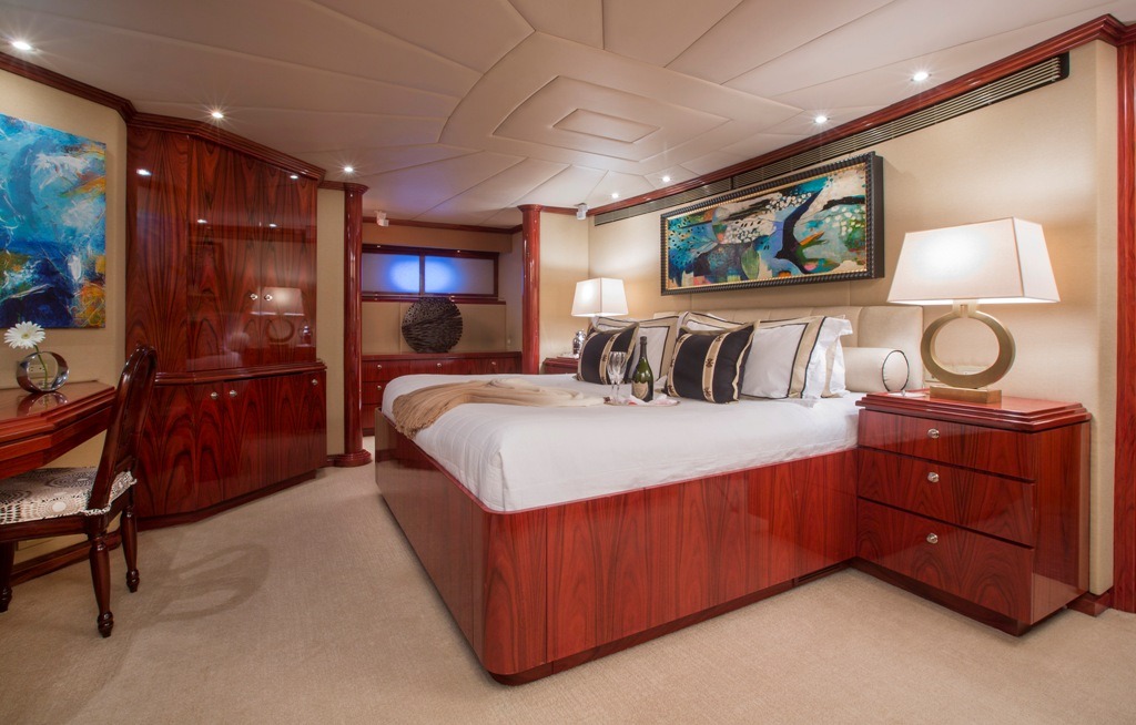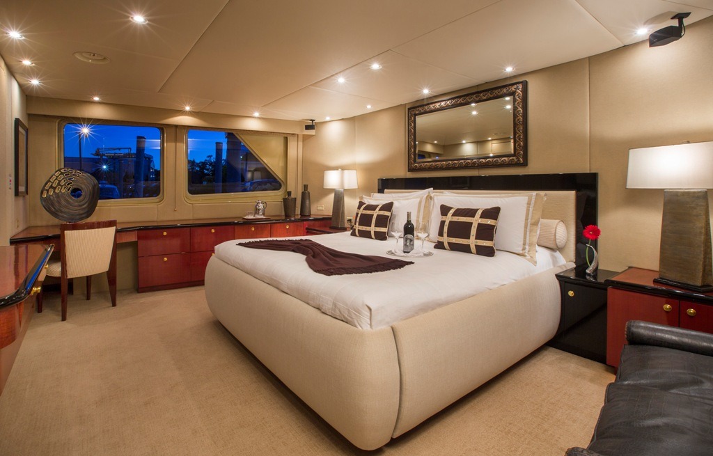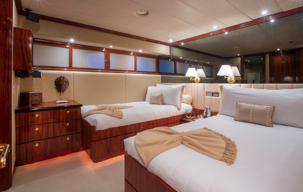 SWEET ESCAPE can accommodate 12 guests in 6 staterooms (3 King, 2 Convertible Twin/King, 1 Single plus one bunk), with 5 ensuite bathrooms. Crew: 8 MASTER STATEROOM: Lower Deck, amidship. Full beam Stateroom with walk-around Sleep Number® King bed, mini-refrigerator, desk, and settee. Separate His-and Hers en-suite amenities featuring: Jacuzzi tub with overhead shower, sink, head, walk-in closet, and vanity dresser for Her; Steam shower with bench seat, head, sink, and walk-in closet for Him. Entertainment system featuring Bose surround sound, 60”HDTV with individual satellite receiver, and iPod docking station. Port holes in the master stateroom as well as his-and-her en-suite create abundant natural light if desired. Complete blackout option also available. Combination safe located in Master Stateroom. ON-DECK VIP KING STATEROOM: On-Deck, forward: Sleep Number® King bed with exquisite views; en-suite with stall shower. Entertainment system featuring Bose surround sound, 55”HDTV with individual satellite receiver, and iPod docking station. LOWER DECK VIP KING STATEROOM: Situated mid-ships to aft. Full beam Stateroom with walk-around Sleep Number® King bed. En-suite features oversized shower with bench seat, head, and sink. Entertainment system featuring Bose surround sound, 50” HDTV with individual satellite receiver, and iPod docking station. CONVERTIBLE TWIN/KING STATEROOM TO STARBOARD: Lower deck amidships: Two twin-sized beds (extra-long) convertible to 1 King bed; en-suite with shower. Entertainment system with Bose surround sound, 36”HDTV and iPod docking station. CONVERTIBLE TWIN/KING STATEROOM TO PORT: Lower deck amidships: Two twin-sized beds (extra-long) convertible to 1 King bed; en-suite with shower. Entertainment system with Bose surround sound, 36” HDTV and iPod docking station. This stateroom shares the en-suite bathroom with the 6th guest stateroom. 6th Guest Stateroom: One Single bed with adjacent bunk bed to accommodate children or staff. Hanging locker and drawers, 36” HDTV with individual satellite receiver. This stateroom shares the en-suite bathroom with the Port side King/Twin Convertible Guest Stateroom. All staterooms include individual satellite receivers, individual climate control, robes, hairdryers, and luxury bath products.