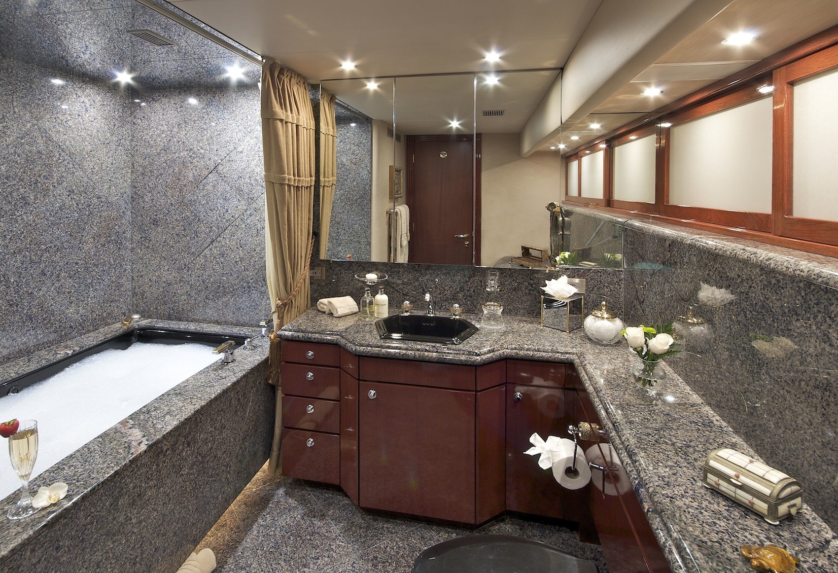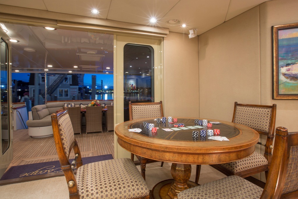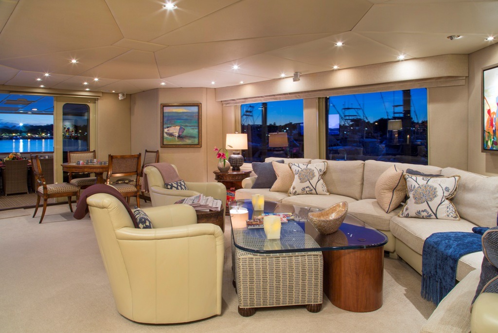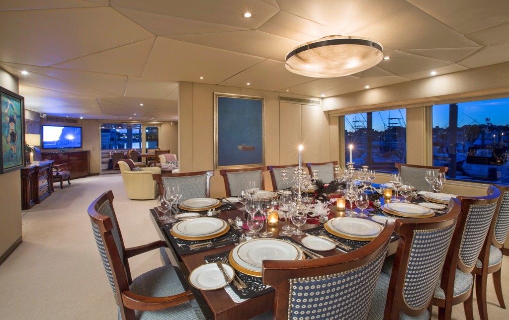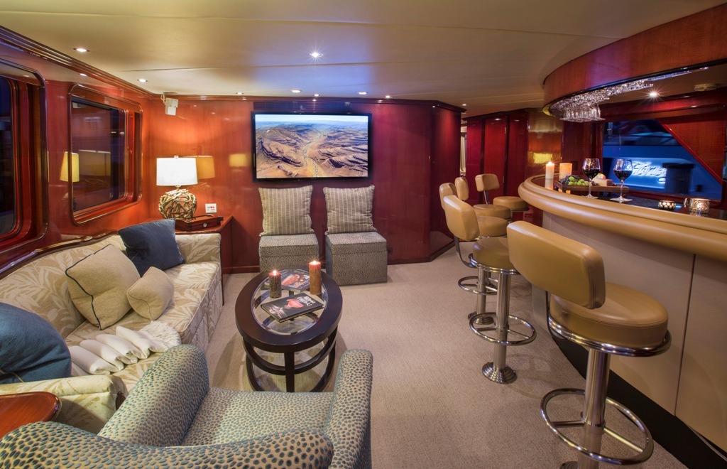 SWEET ESCAPE can accommodate 12 guests in 6 staterooms (3 King, 2 Convertible Twin/King, 1 Single plus one bunk), with 5 ensuite bathrooms. Crew: 8 MASTER STATEROOM: Lower Deck, amidship. Full beam Stateroom with walk-around Sleep Number® King bed, mini-refrigerator, desk, and settee. Separate His-and Hers en-suite amenities featuring: Jacuzzi tub with overhead shower, sink, head, walk-in closet, and vanity dresser for Her; Steam shower with bench seat, head, sink, and walk-in closet for Him. Entertainment system featuring Bose surround sound, 60”HDTV with individual satellite receiver, and iPod docking station. Port holes in the master stateroom as well as his-and-her en-suite create abundant natural light if desired. Complete blackout option also available. Combination safe located in Master Stateroom. ON-DECK VIP KING STATEROOM: On-Deck, forward: Sleep Number® King bed with exquisite views; en-suite with stall shower. Entertainment system featuring Bose surround sound, 55”HDTV with individual satellite receiver, and iPod docking station. LOWER DECK VIP KING STATEROOM: Situated mid-ships to aft. Full beam Stateroom with walk-around Sleep Number® King bed. En-suite features oversized shower with bench seat, head, and sink. Entertainment system featuring Bose surround sound, 50” HDTV with individual satellite receiver, and iPod docking station. CONVERTIBLE TWIN/KING STATEROOM TO STARBOARD: Lower deck amidships: Two twin-sized beds (extra-long) convertible to 1 King bed; en-suite with shower. Entertainment system with Bose surround sound, 36”HDTV and iPod docking station. CONVERTIBLE TWIN/KING STATEROOM TO PORT: Lower deck amidships: Two twin-sized beds (extra-long) convertible to 1 King bed; en-suite with shower. Entertainment system with Bose surround sound, 36” HDTV and iPod docking station. This stateroom shares the en-suite bathroom with the 6th guest stateroom. 6th Guest Stateroom: One Single bed with adjacent bunk bed to accommodate children or staff. Hanging locker and drawers, 36” HDTV with individual satellite receiver. This stateroom shares the en-suite bathroom with the Port side King/Twin Convertible Guest Stateroom. All staterooms include individual satellite receivers, individual climate control, robes, hairdryers, and luxury bath products.