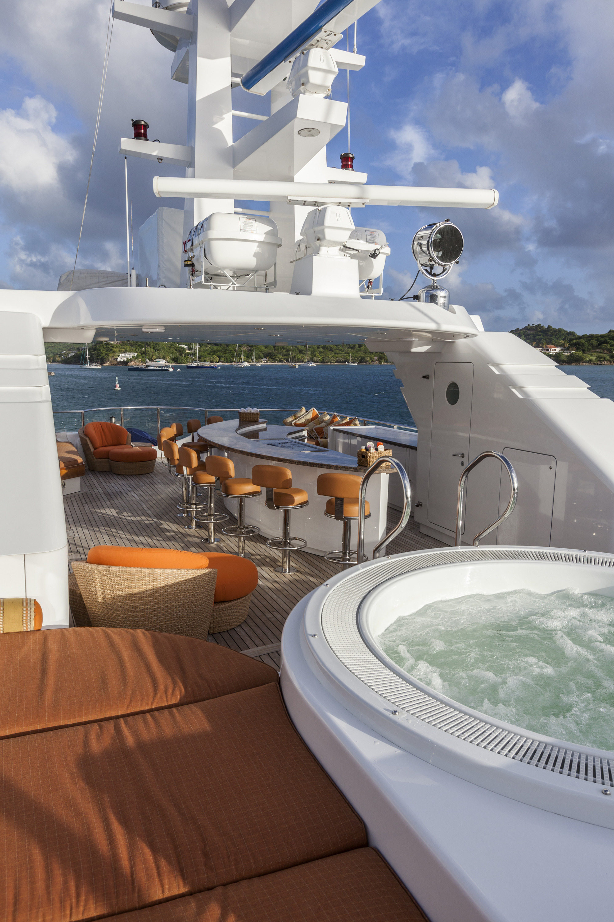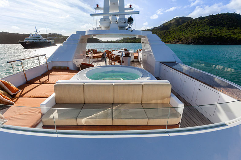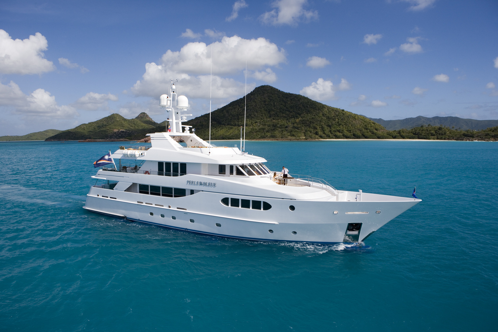 A fine, classically elegant motor yacht, designed with meticulous attention to detail, PERLE BLEUE offers ideal deck areas for outdoor living. Her sumptuous sun deck with a jacuzzi and huge lounging areas, including sunpads and sofas, also boasts a large curved bar with fixed seating for 10 guests and a Teppanyaki bar. The upper deck is also a great venue for relaxing with lose sofas and a dining table for less formal occasions. PERLE BLEUE's sky lounge is inviting and comfortable. Designed in a New England beach house style, the warm blend of colours combined with neutral soft furnishings make this an ideal retreat after a day in the sun. Later on, retire to the elegant lounge on her main deck, which is the most formal of her guest spaces. Unique pieces of art are complemented by a rich colour palette and the entire area is bathed in natural light which pours in through the panoramic windows. Along with the sumptuous seating area there are two card tables, which when combined and extended can be transformed into a large formal dining table with seating for up to 12 guests. PERLE BLEUE has one of the largest volume interiors possible in a yacht of her size, allowing for a full width master cabin on the main deck, two double cabins and two further convertible double or twin cabins with three additional pullman berths. With all the very latest communications and entertainment systems, and a wide range of watersports equipment, PERLE BLEUE is a proven successful charter yacht and is perfect for any type of charter, be it with family, friends or colleagues.