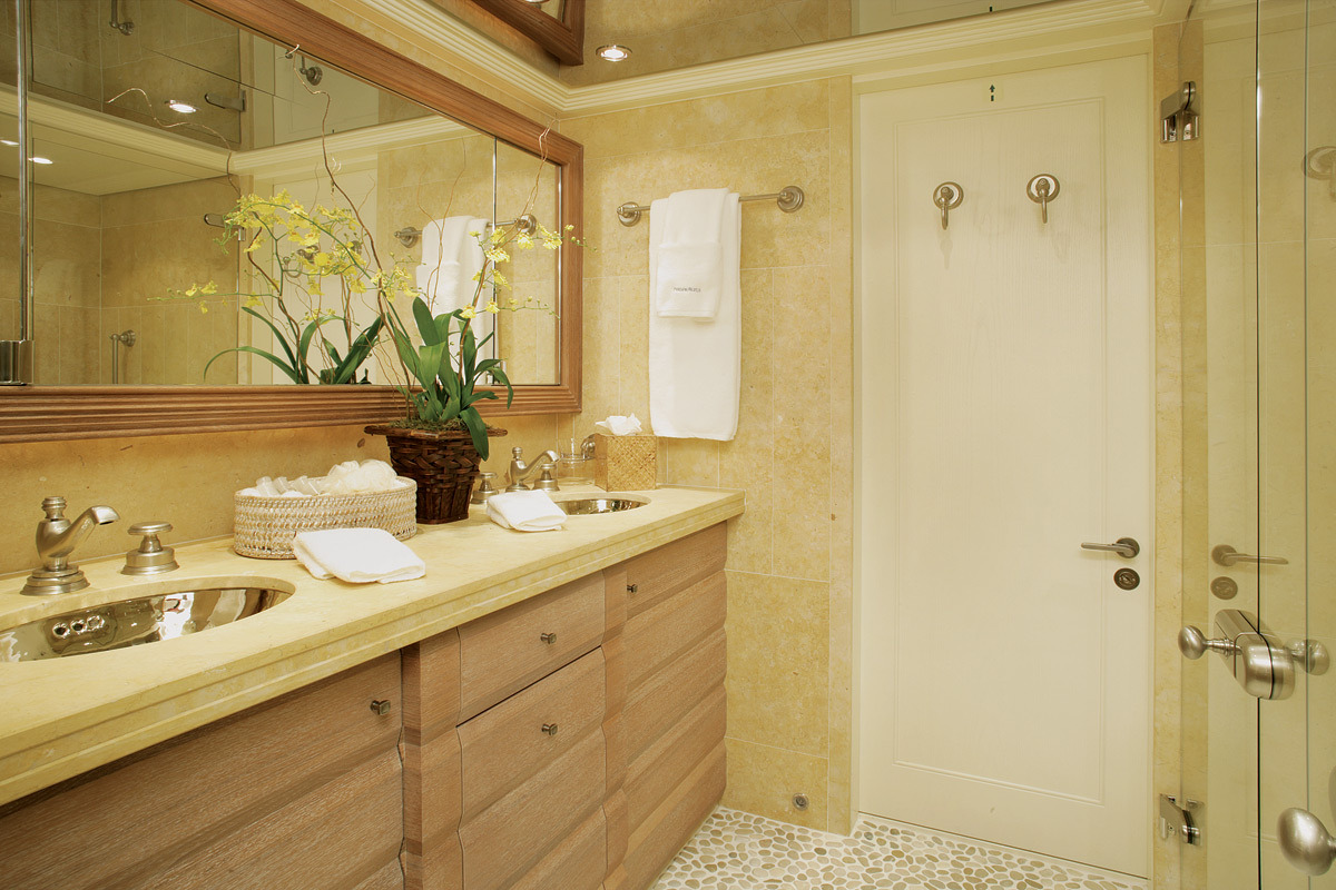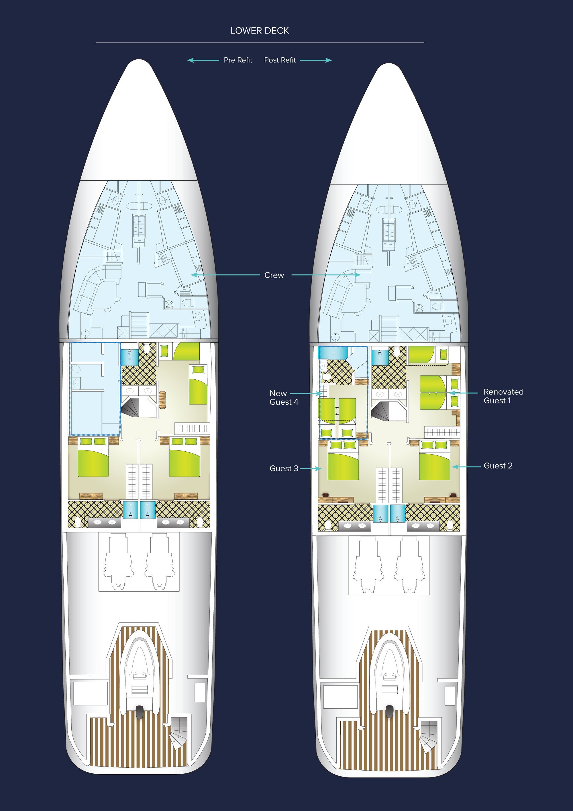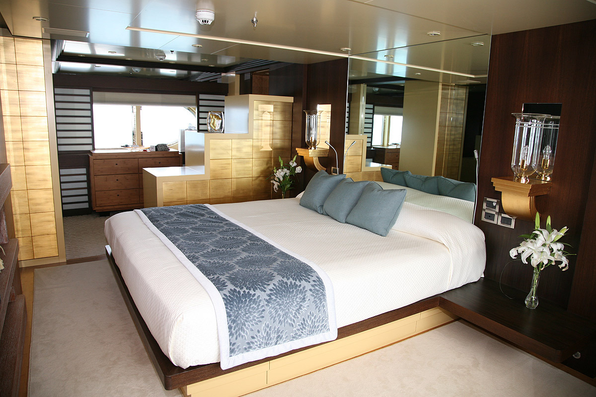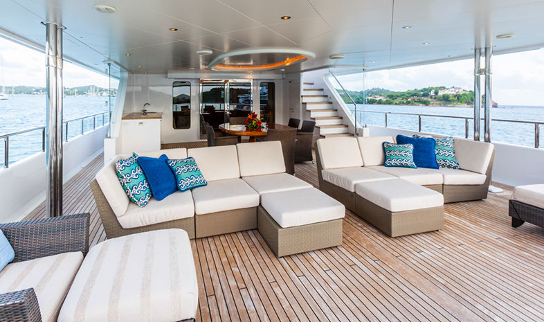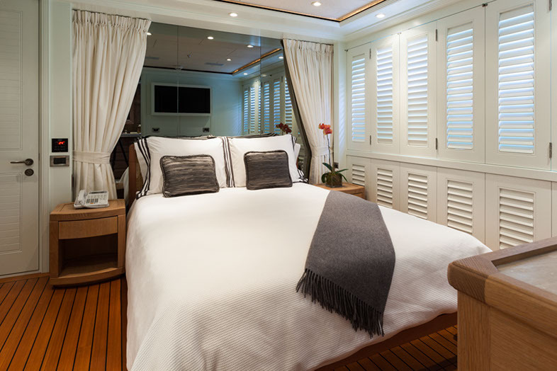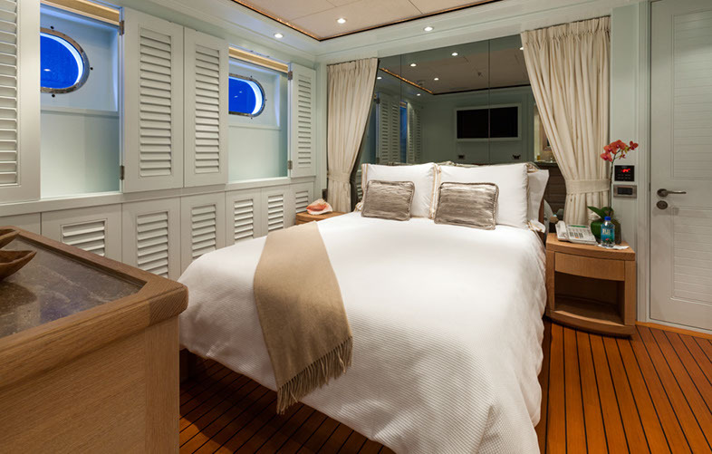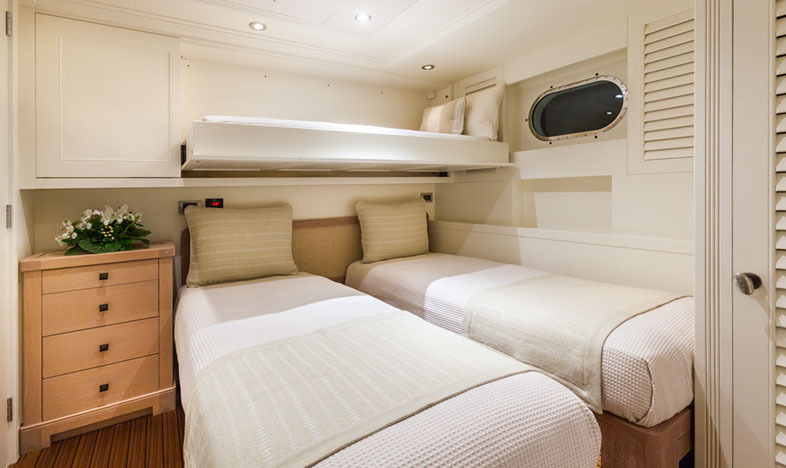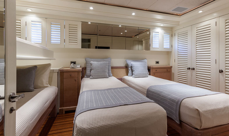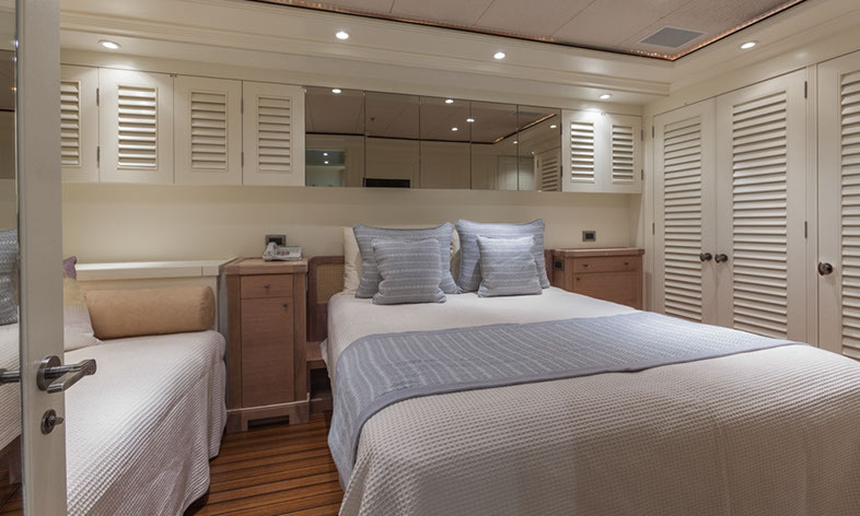 Configured with an on-deck master plus two VIP queen staterooms and two convertible guest cabins, PERLE BLEUE accommodates up to 12. The two convertible guest cabins may be made up with queen/double beds, twins, or three singles. Guests: 10 / 12 using pullmans • Master: 1 King • Guest 1: Queen/Twin, 1 Single (or sofa), 1 pullman • Guest 2: 1 Queen • Guest 3: 1 Queen • Guest 4: 1 Double/Twin, 1 pullman
