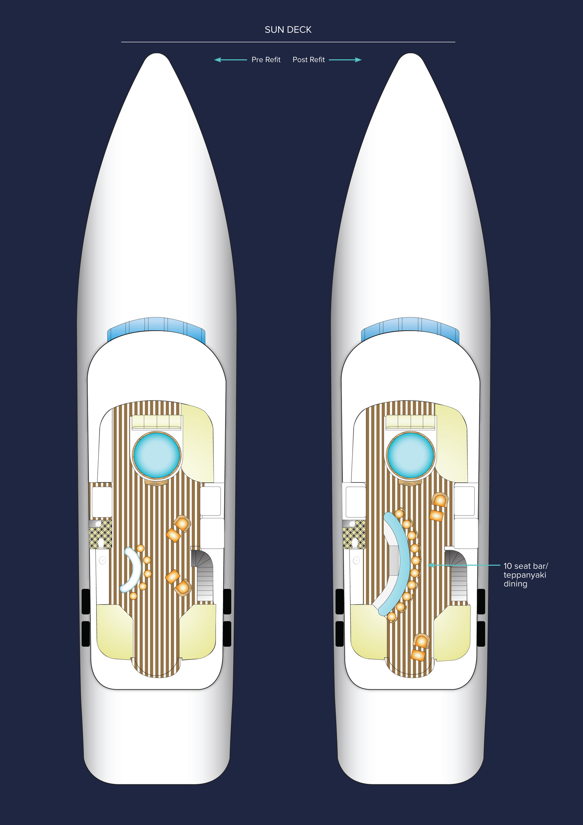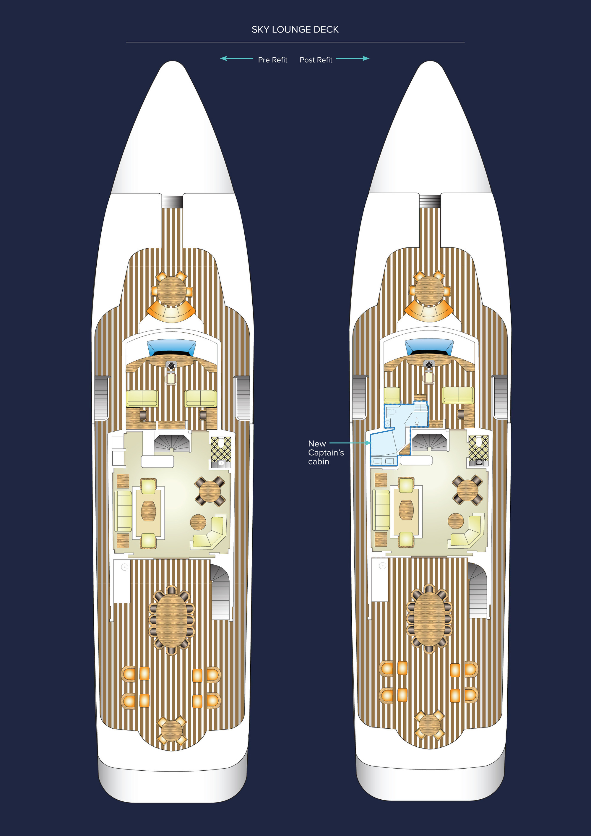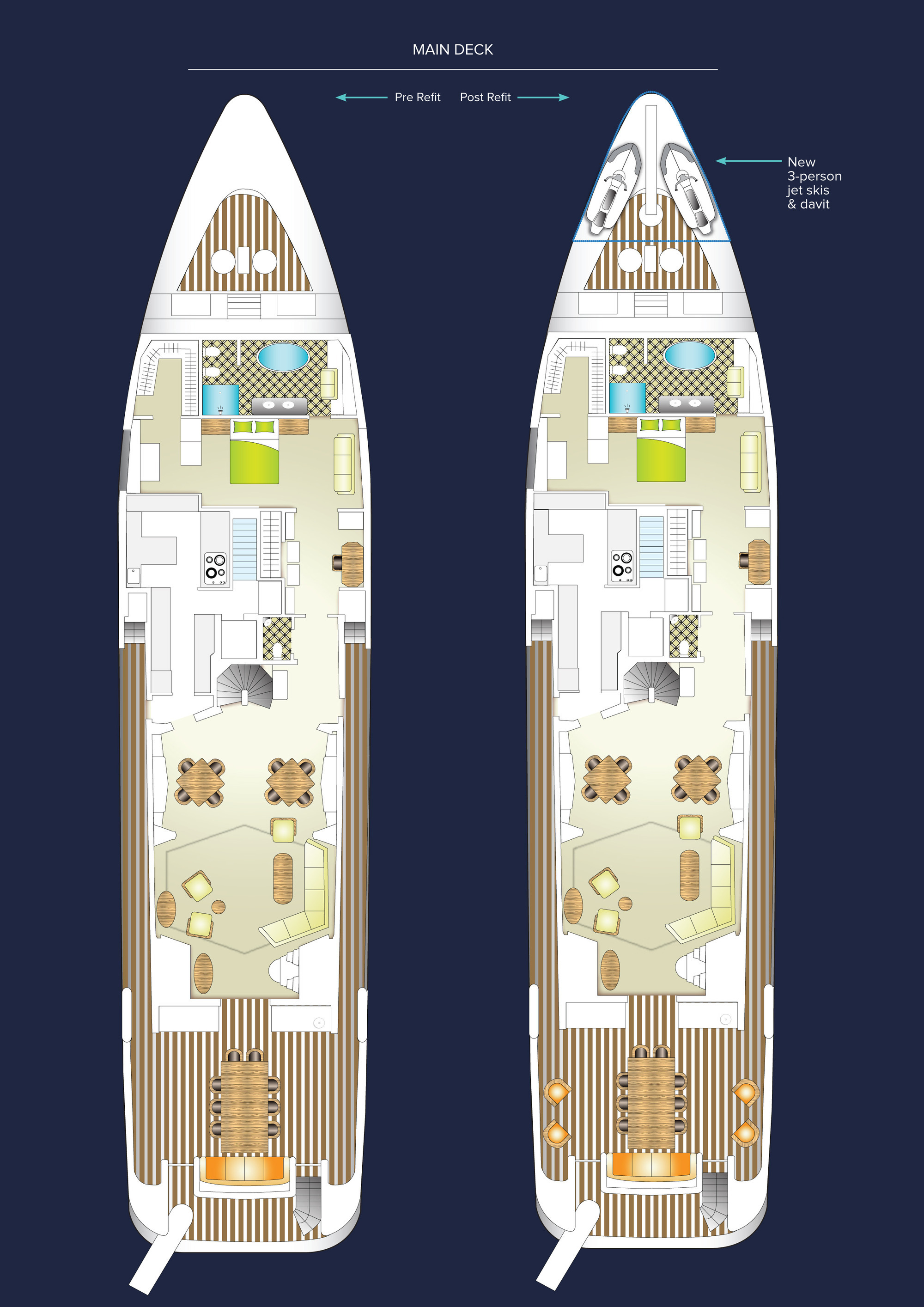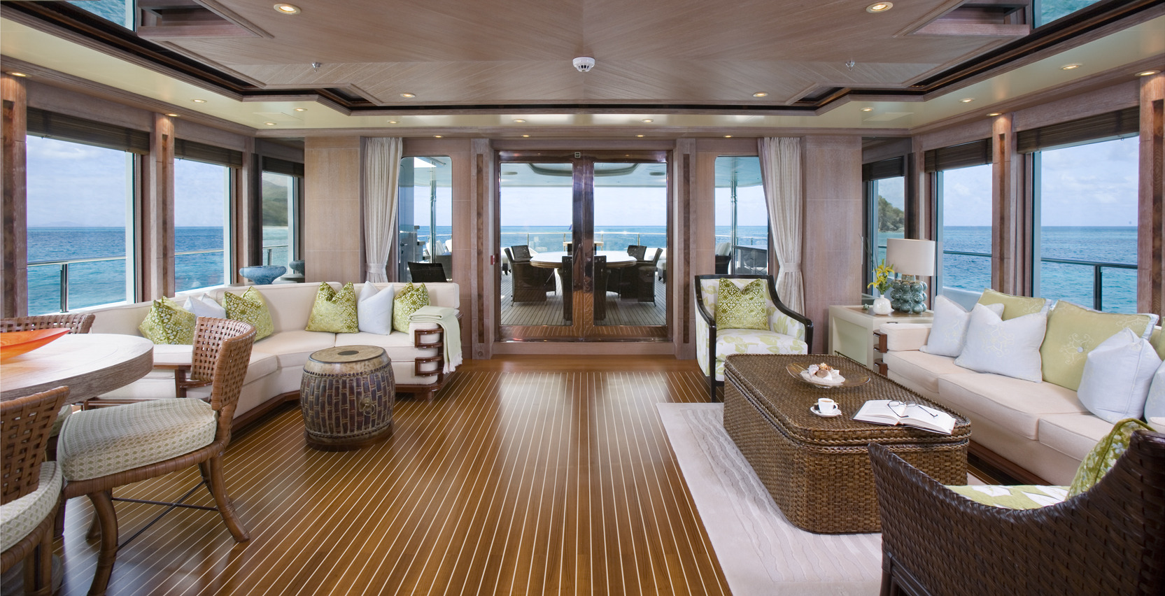 Configured with an on-deck master plus two VIP queen staterooms and two convertible guest cabins, PERLE BLEUE accommodates up to 12. The two convertible guest cabins may be made up with queen/double beds, twins, or three singles. Guests: 10 / 12 using pullmans • Master: 1 King • Guest 1: Queen/Twin, 1 Single (or sofa), 1 pullman • Guest 2: 1 Queen • Guest 3: 1 Queen • Guest 4: 1 Double/Twin, 1 pullman