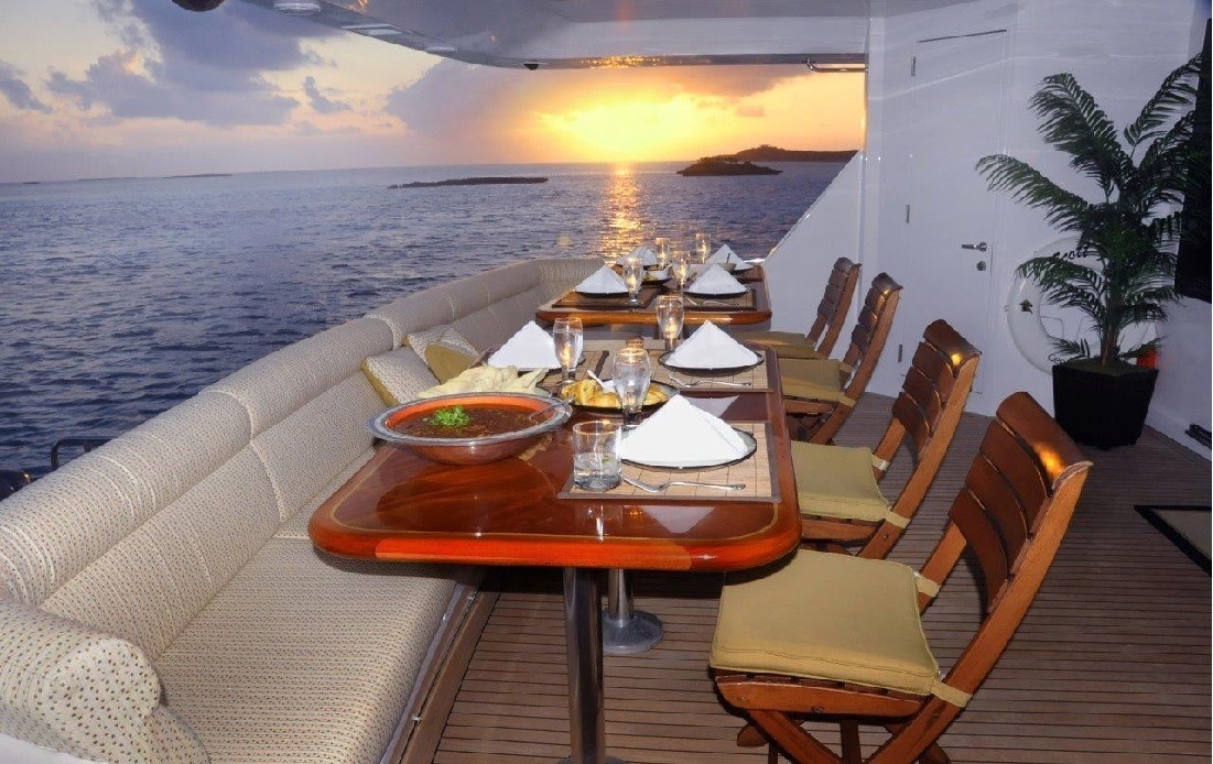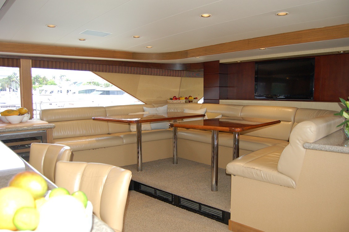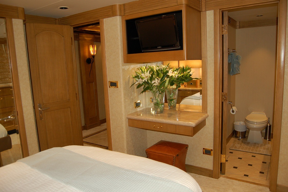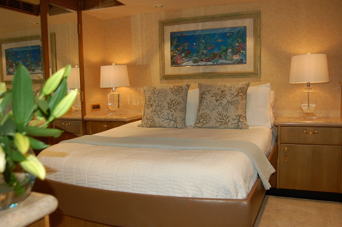 LEGENARDY'S interior layout sleeps up to 8 guests in 4 rooms. The yacht yacht has just completed a $1,000,000 refit and is a must see! LEGENARDY'S impressive leisure and entertainment facilities make her the ideal charter yacht for socializing and entertaining with family and friends. The flybridge has a fiberglass hardtop with retractable sun roof and 62" plasma TV which is recessed in the overhead just above the helm station. There is a 2 1/2' extension on the transom which houses a fully hydraulic set of stairs and underwater platform for scuba and personal watercraft access. Underwater lights located on the swim platform will provide hours of evening underwater viewing.