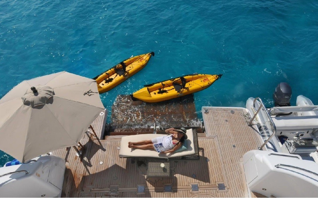 Tenders & Toys: Towed 32' Everglade with auto positioning - 3x300, 19' Zodiac, paddle boards, fishing gear,floating mats,tube, wake board, water skis, snorkel gear, Brownie 3rd Lung Audio Visual Equipment and Deck Facilities: Retractable sunroof Large TV on top deck