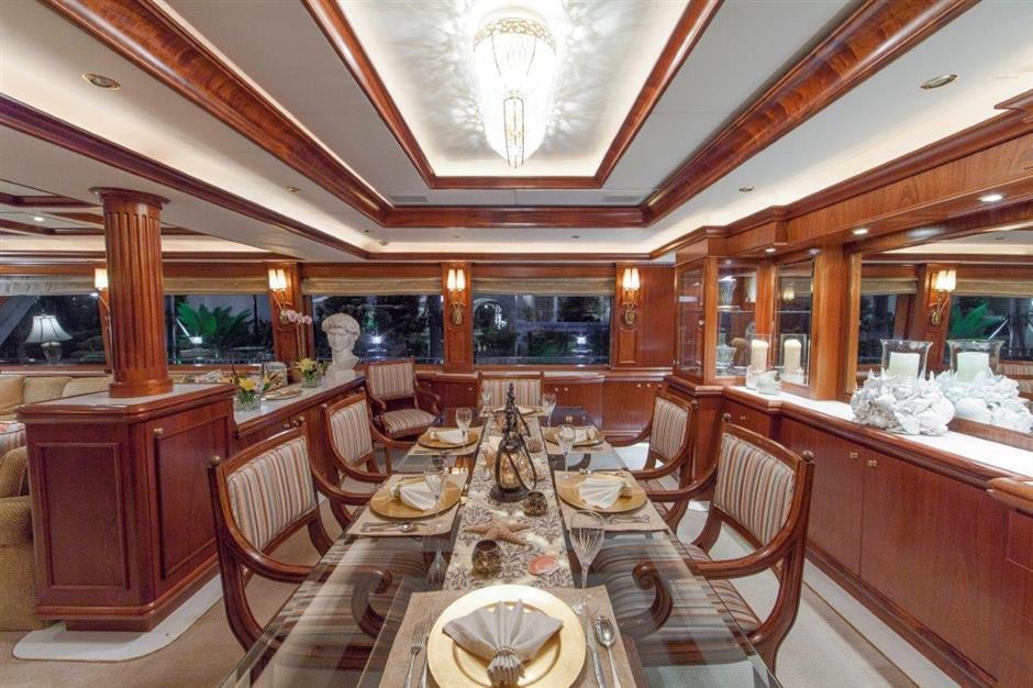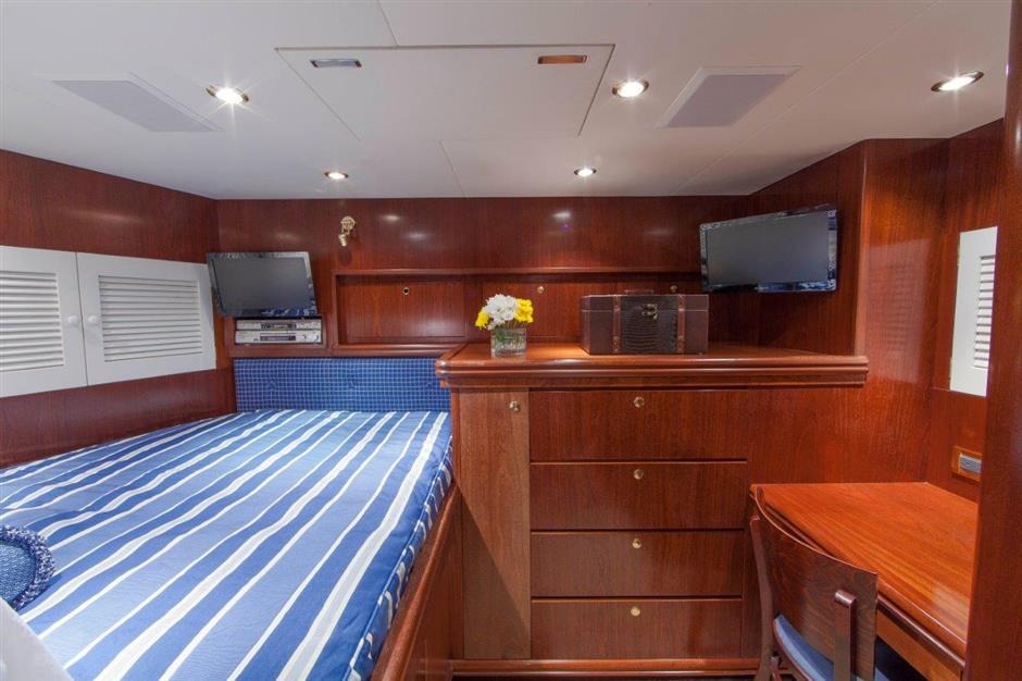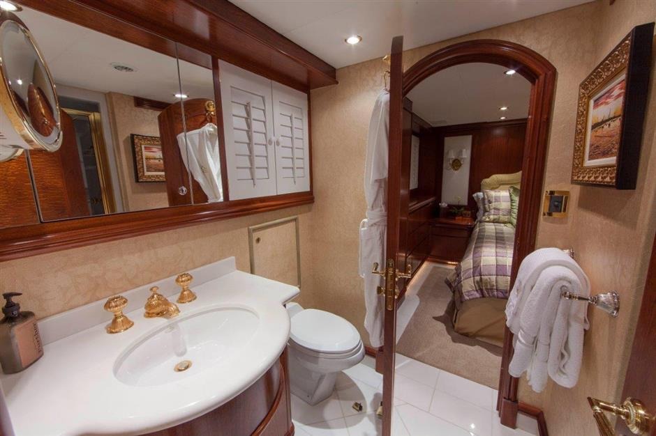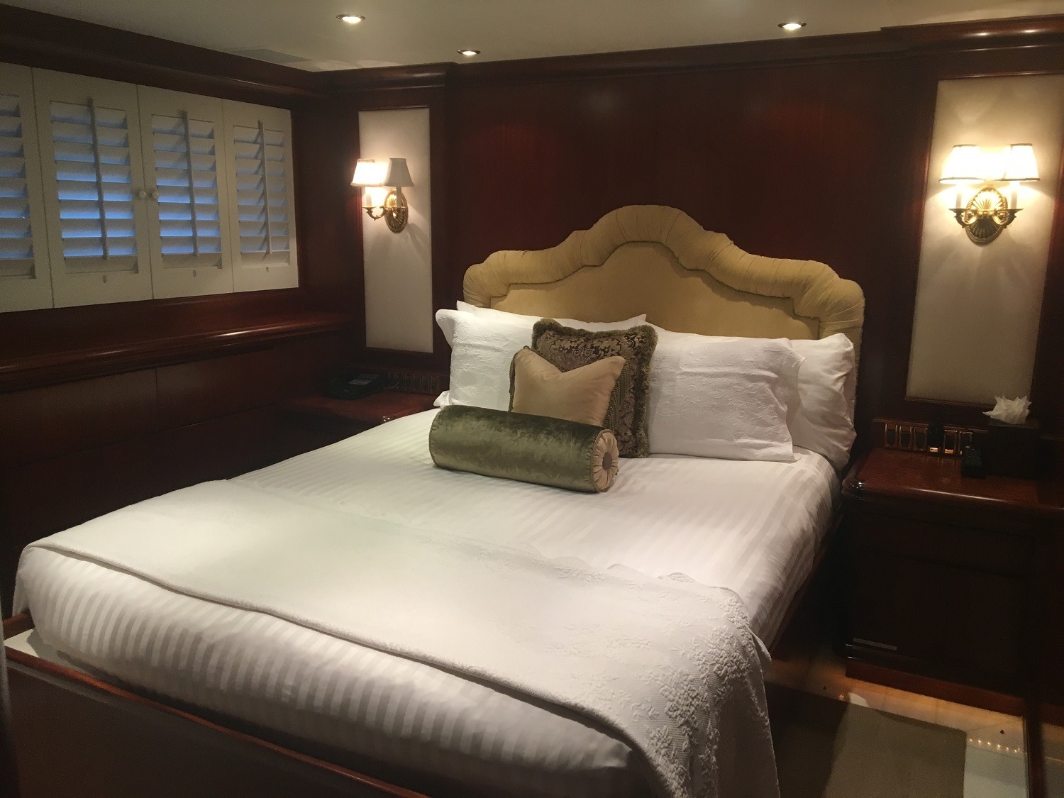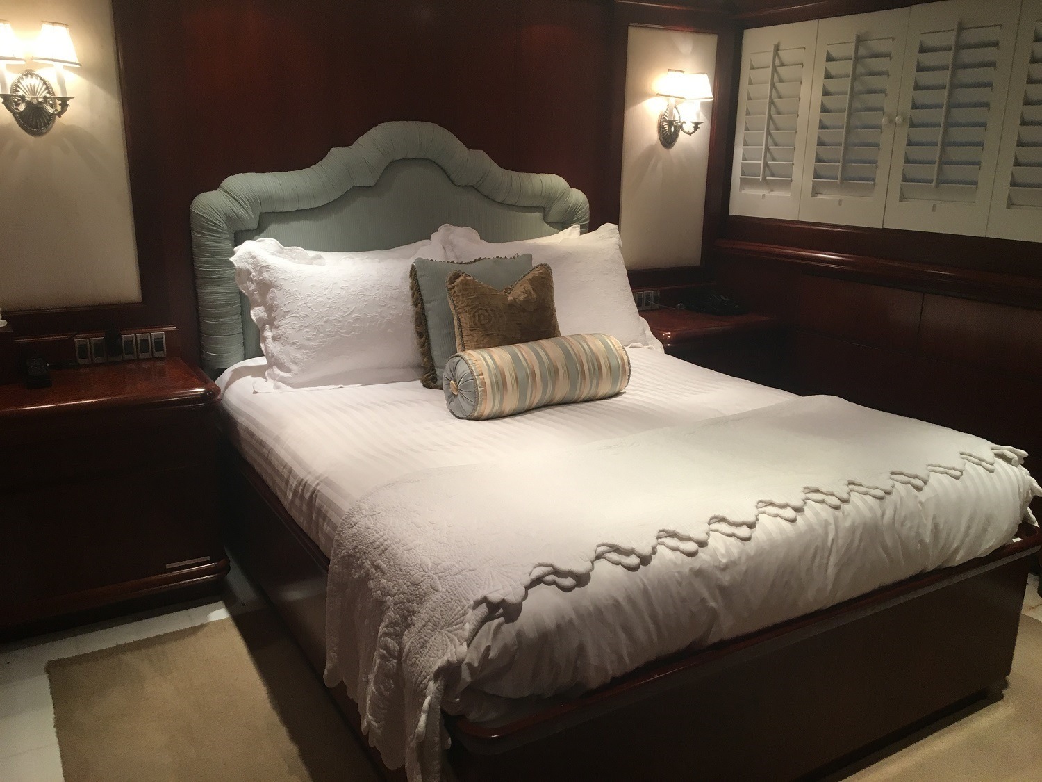 OCEAN CLUB is 120 feet of nautical adventure! She is able to accommodate nine guests in five well outfitted staterooms. There is an abundance of activities to do while onboard the yacht. For fun on the water, there are numerous water toys for your enjoyment. Luxury motor yacht OCEAN CLUB has a beautiful salon with a large sofa and loveseat, ottoman, leather game seat chairs and table and a wet bar with Corian counter top. There is a full entertainment system with a Fujitsu 49”plasma TV, VHS, DVD Panasonic audio/video/CD changer home theatre system. The master stateroom is complete with a king size bed, dresser, a full entertainment center, 2 walk in closets, his and her bath, and a 2 person steam shower and vanity. Two of the guest staterooms have queen beds with drawers underneath, entertainment centers, and en suites with shower. The fourth stateroom has a double bed, entertainment center, and en suite with shower. The fifth cabin is adjacent to the master stateroom and shares a head with a queen room.The Pullman can accommodate an adult and is a great space for a nanny, body guard or child! The office area located forward on the main deck is sound-proofed for privacy and features a couch, built-in desk, Aquos Sharp 29” plasma TV, DVD and CD changer home theatre