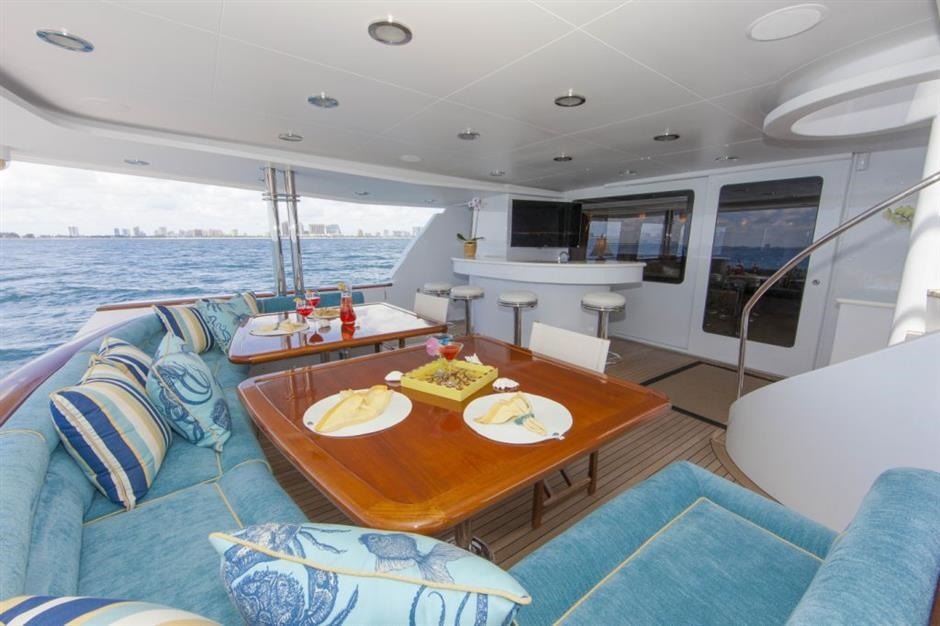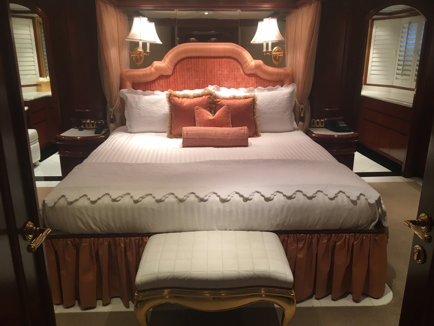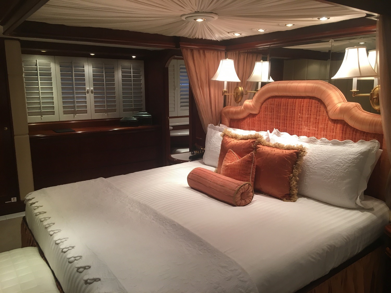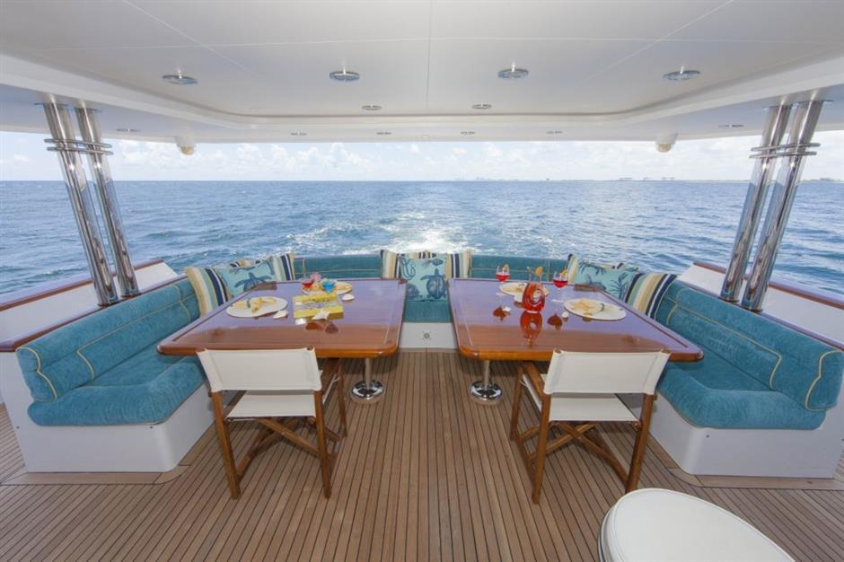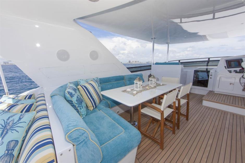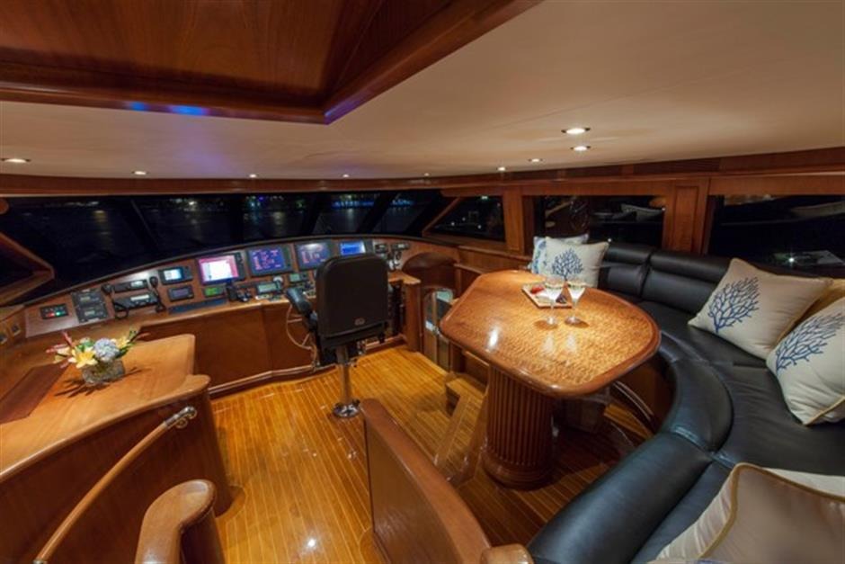 OCEAN CLUB is 120 feet of nautical adventure! She is able to accommodate nine guests in five well outfitted staterooms. There is an abundance of activities to do while onboard the yacht. For fun on the water, there are numerous water toys for your enjoyment. Luxury motor yacht OCEAN CLUB has a beautiful salon with a large sofa and loveseat, ottoman, leather game seat chairs and table and a wet bar with Corian counter top. There is a full entertainment system with a Fujitsu 49”plasma TV, VHS, DVD Panasonic audio/video/CD changer home theatre system. The master stateroom is complete with a king size bed, dresser, a full entertainment center, 2 walk in closets, his and her bath, and a 2 person steam shower and vanity. Two of the guest staterooms have queen beds with drawers underneath, entertainment centers, and en suites with shower. The fourth stateroom has a double bed, entertainment center, and en suite with shower. The fifth cabin is adjacent to the master stateroom and shares a head with a queen room.The Pullman can accommodate an adult and is a great space for a nanny, body guard or child! The office area located forward on the main deck is sound-proofed for privacy and features a couch, built-in desk, Aquos Sharp 29” plasma TV, DVD and CD changer home theatre