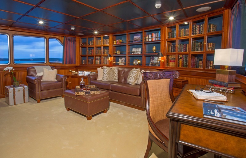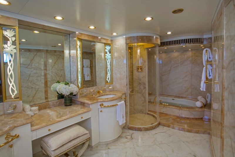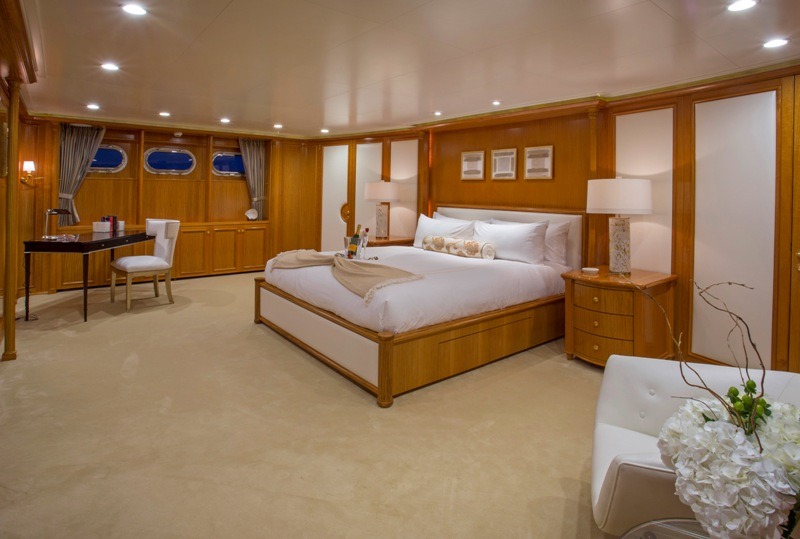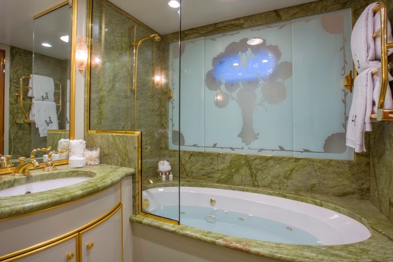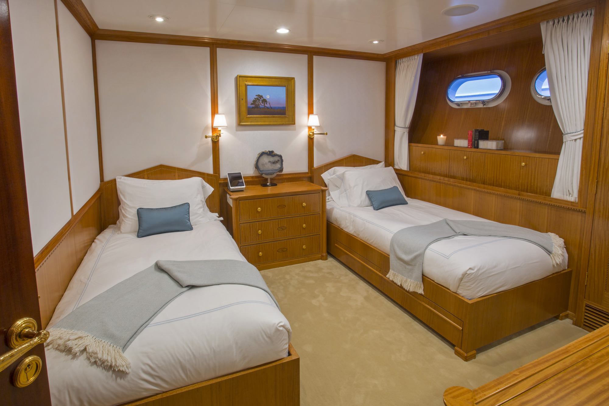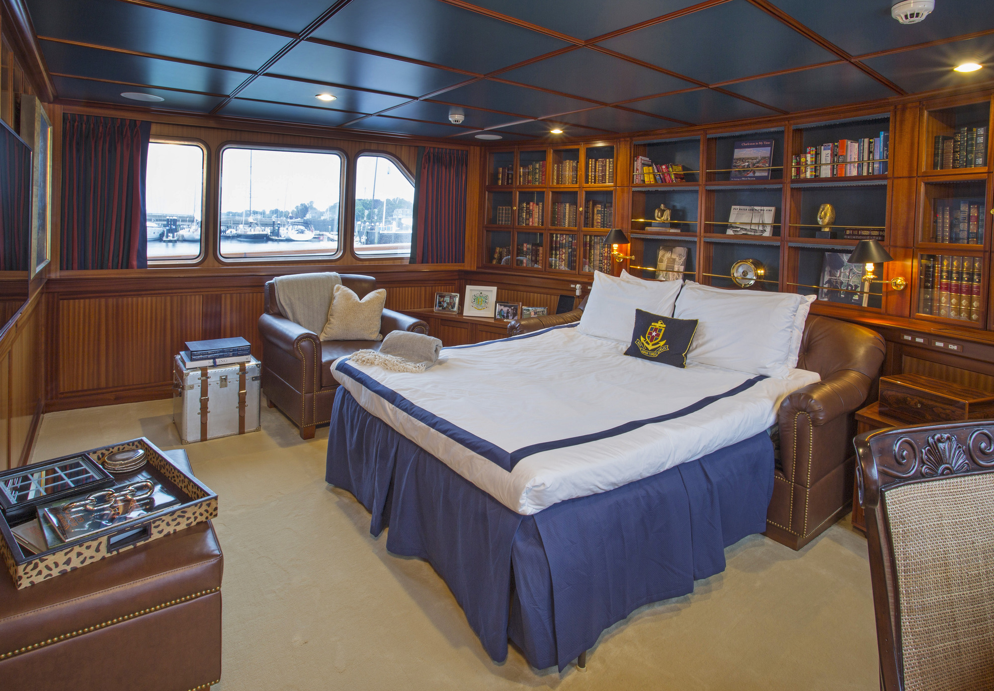 Main Deck forward: Library / den that converts into the 4th guest stateroom featuring a queen bed conversion, flat-screen TV. Adjacent full guest bath with shower. 3 ensuite staterooms are located on lower deck: • Full-width master stateroom with king bed and his-and-hers bathroom with spa tub • Queen stateroom ensuite with spa tub • Twin stateroom with steam shower All staterooms have flat-screen TVs, wardrobes and ensuite bathrooms.