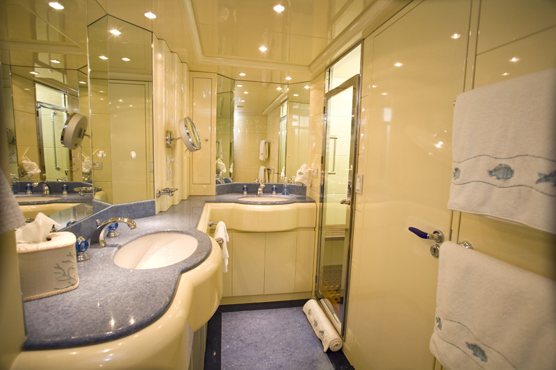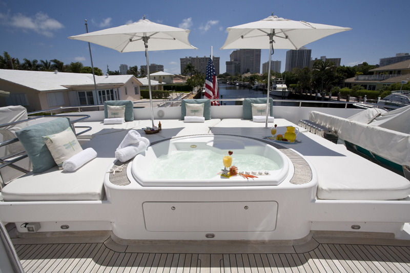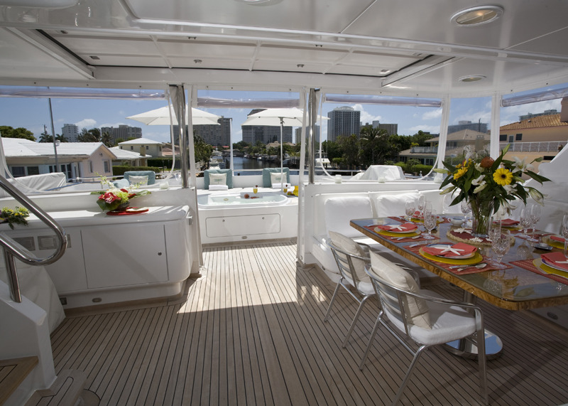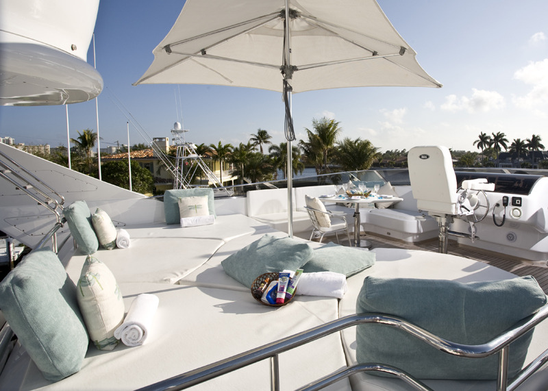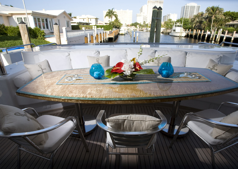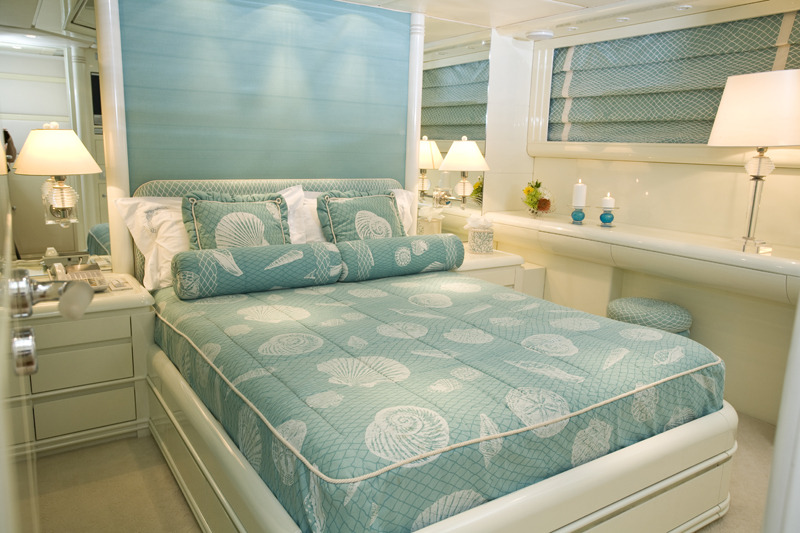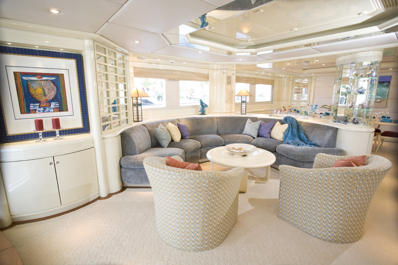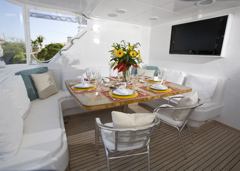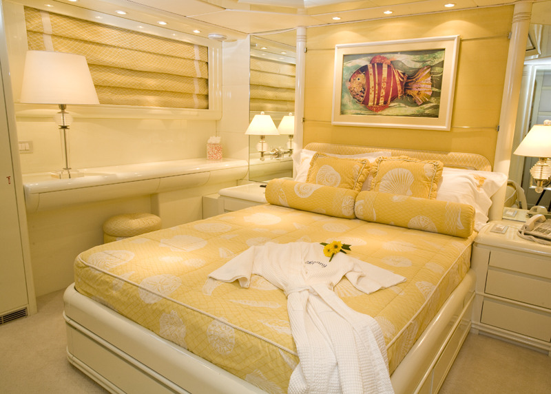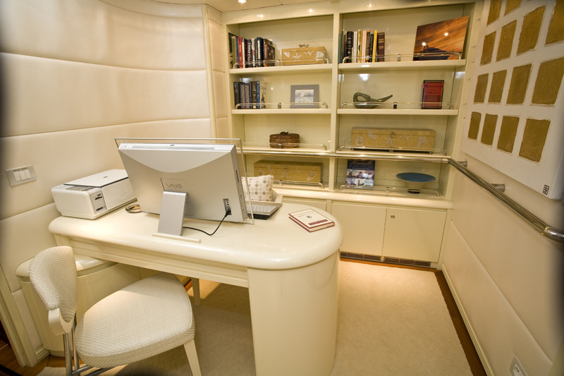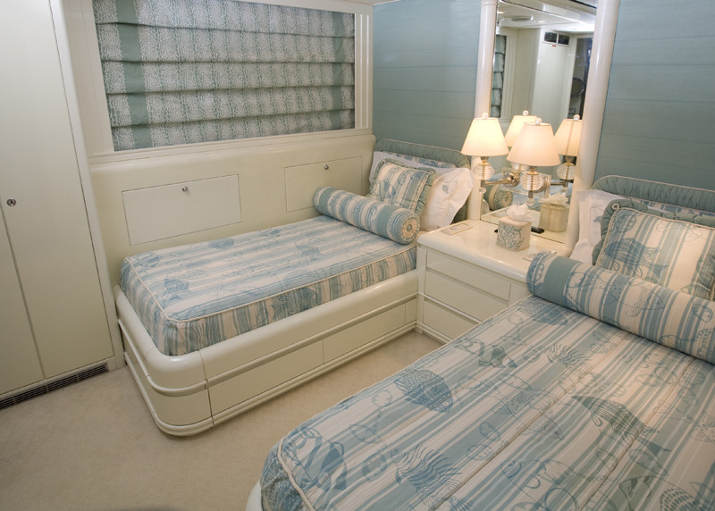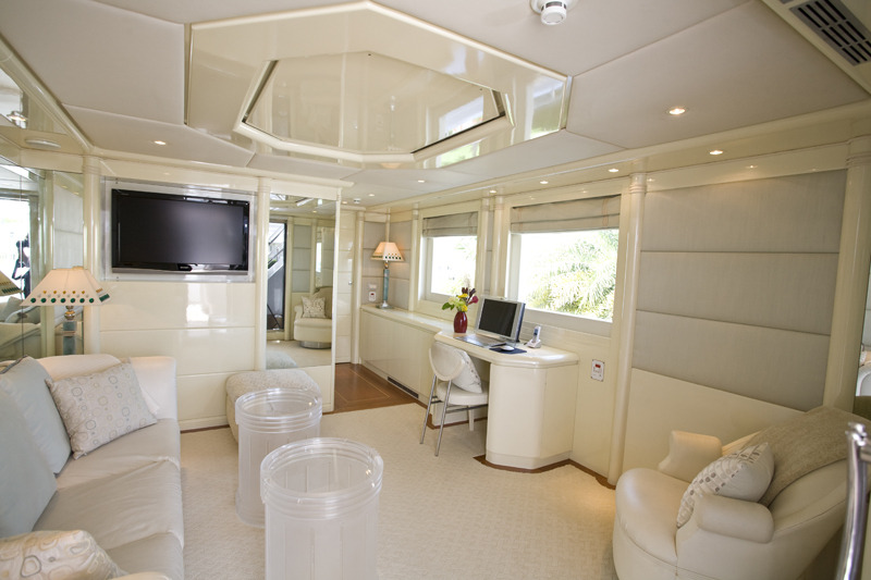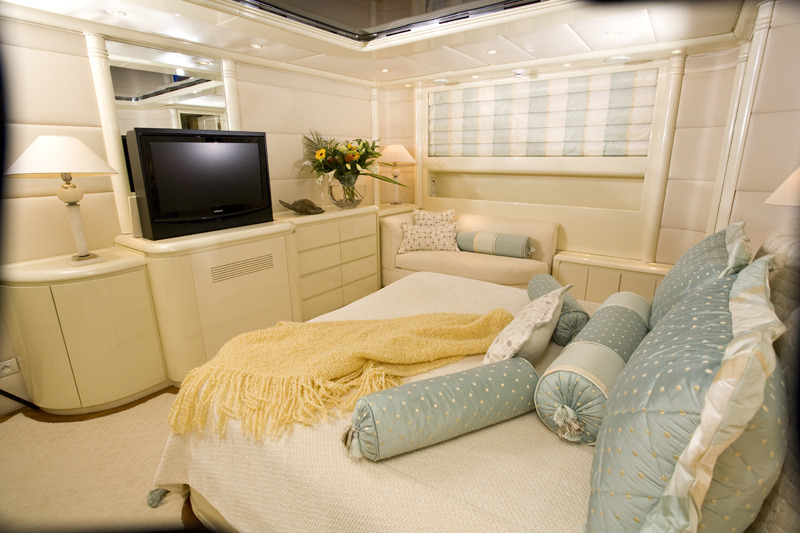 The MASTER STATEROOM is situated forward on the main deck and includes a private study upon entry, a centerline King size bed, vanity to starboard, settee to port, and a walk in dressing area. The entertainment center consists of a 27” pop-up flat screen TV, individual satellite receiver, CD/DVD. En-suite facilities feature his-and-her sinks, rain shower, and separate toilet compartment. The VIP to port is situated below deck aft and features a Queen bed with 20” flat screen TV with individual satellite receiver and CD/DVD. En-suite amenities include a shower, sink and toilet. The VIP to starboard is situated below deck aft and features a Queen bed with 20” flat screen TV with individual satellite receiver and CD/DVD. En-suite amenities include a shower, sink and toilet. The twin guest stateroom is situated below deck forward and to port, and features two twin size beds, en-suite shower, sink and toilet. All staterooms have hairdryers, robes, and individual satellite receivers. Please note: The Chief Stewardess and Chef share a companionway with the guests below decks, and have their own private facilities. The Skylounge features a 37” flat screen TV with CD/DVD, and individual satellite receiver, sofa, 2 coffee tables, and a computer station with air-card for internet access where available.