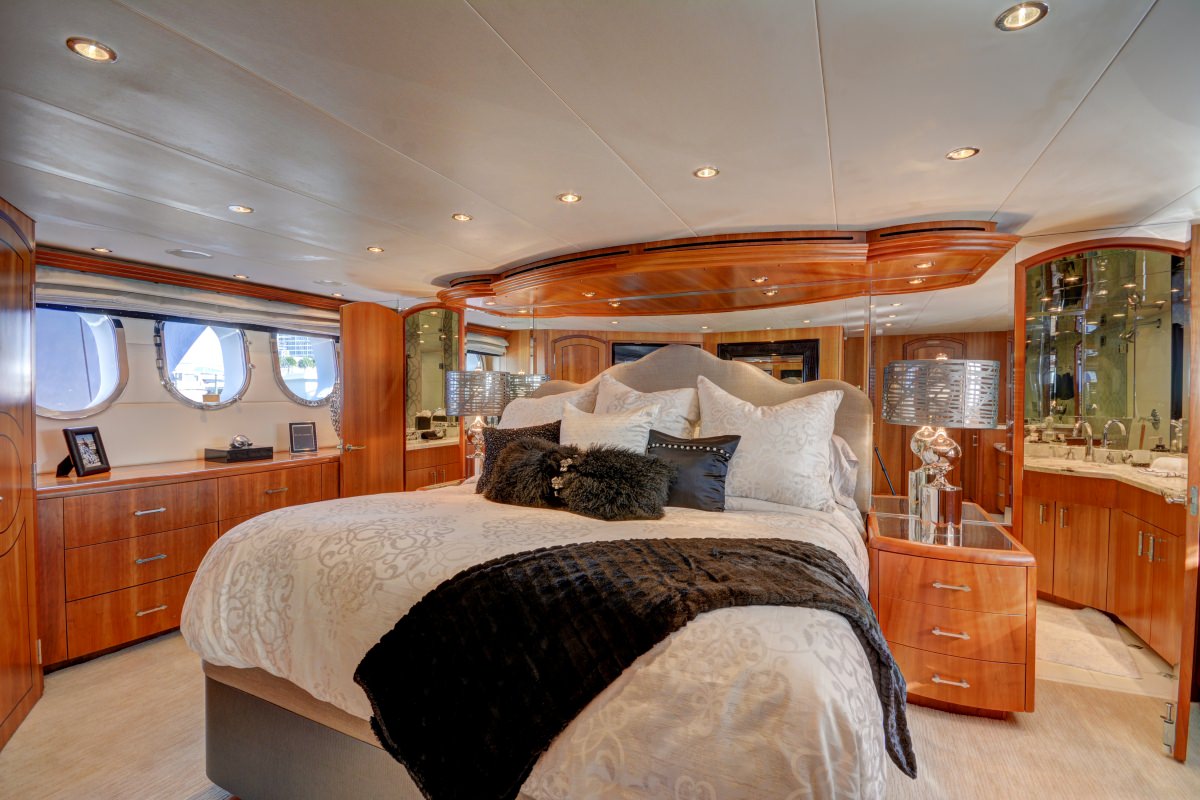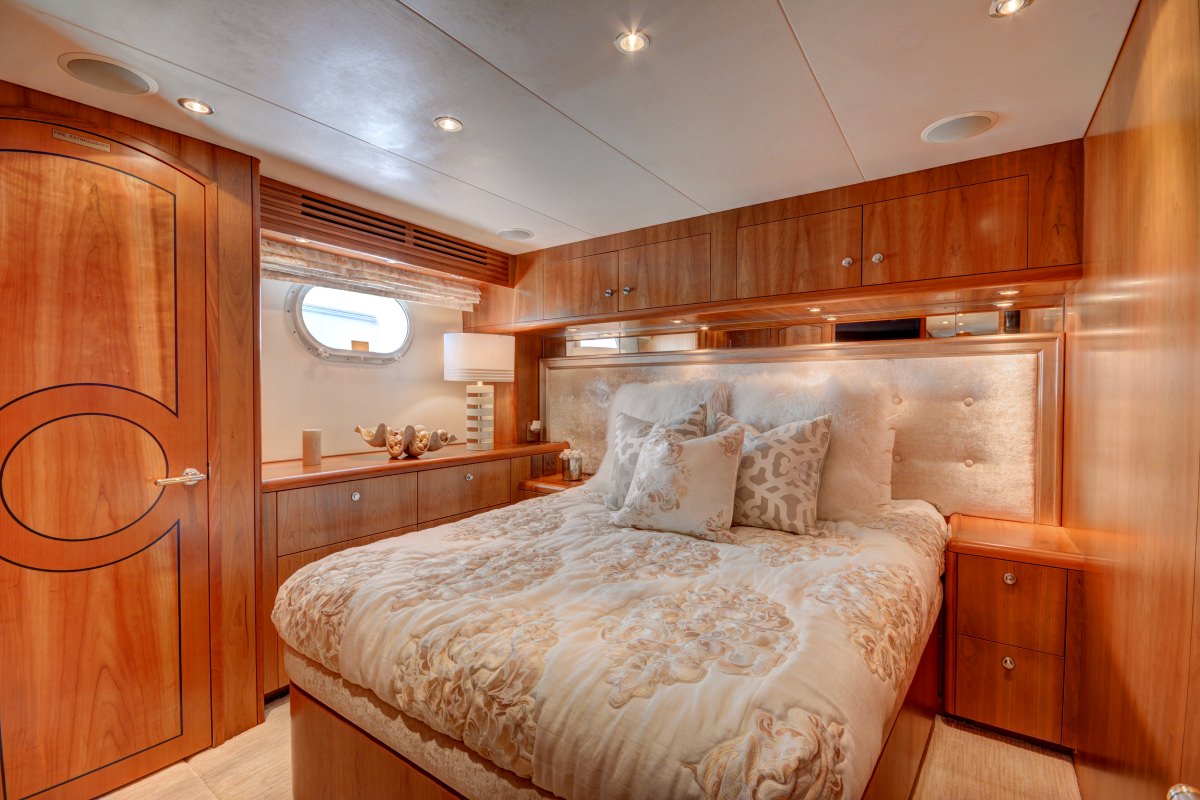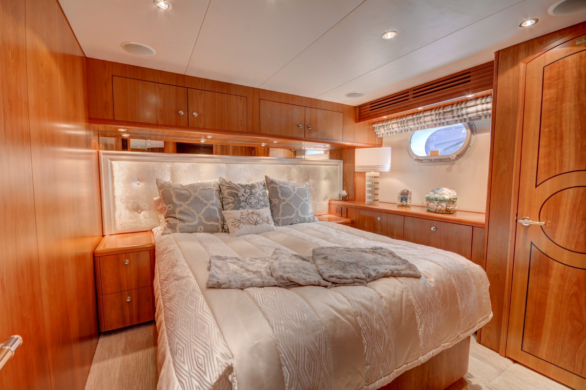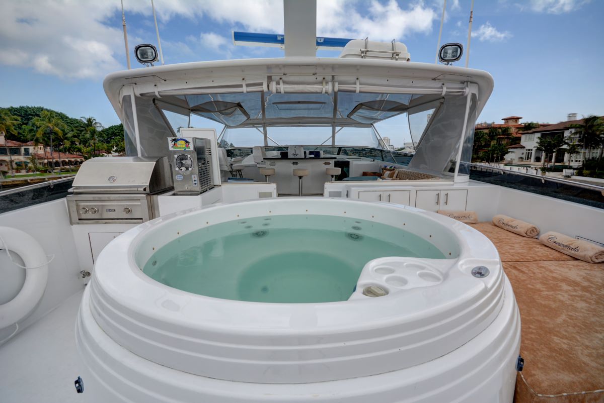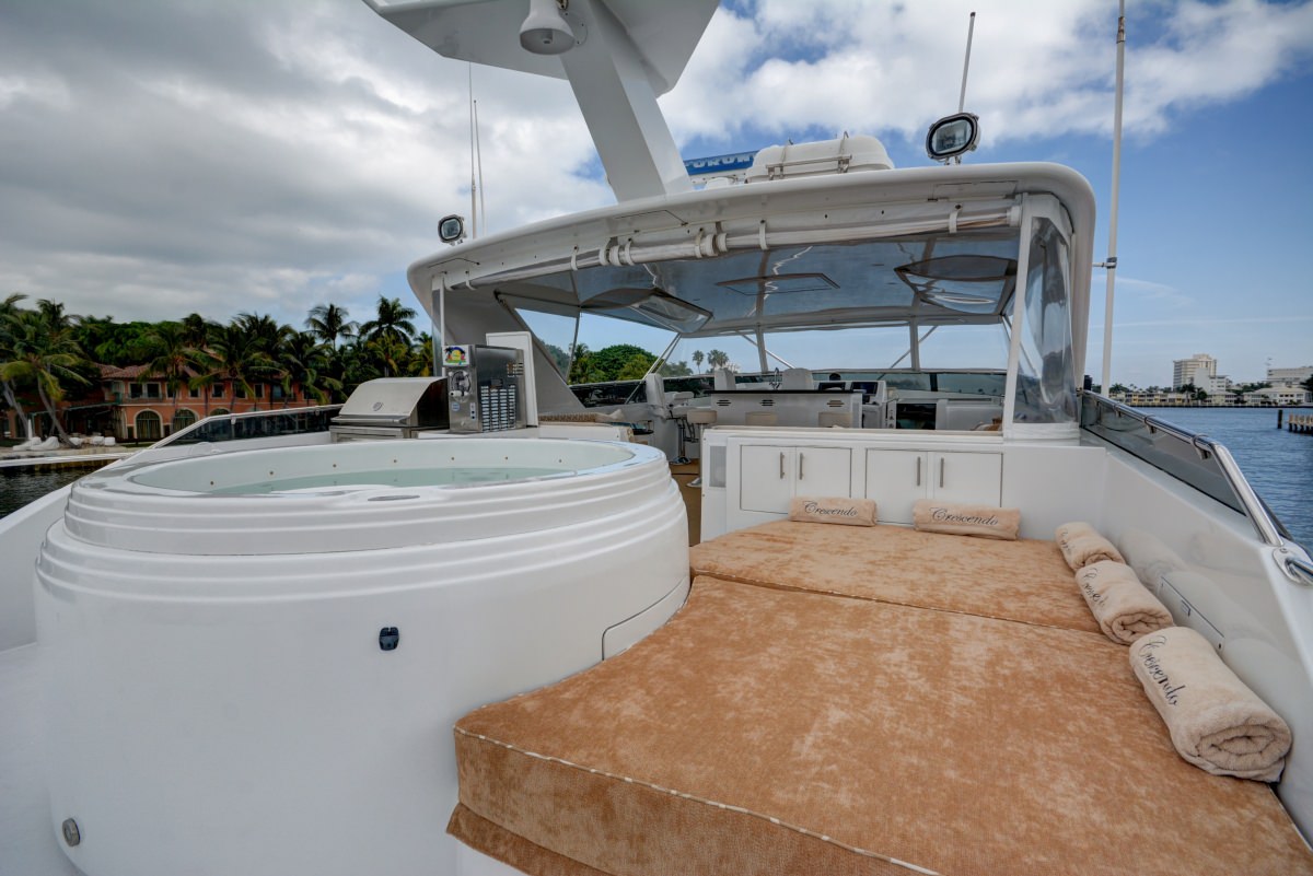 Built in 2005 by Hatteras, she received refits in both 2014 and 2015, bringing her to a like new condition. For the comfort of her guests she offers stabilizers while underway. Five luxurious cabins offer accommodations for up to eight guests. The charming, full beam master suite offers a king size bed, en-suite master bath, expansive vanity/desk, dresser, bookshelves, and plenty of portholes for ample lighting. Additionally there are three guest cabins with queen size beds and one with over and under twin bunks allowing her guests greater flexibility. The term crescendo comes from music and it means to build in loudness or intensity, and building in intensity is just what this yacht does. The main salon offers a long couch, several arm chairs, large windows that flood the room with light, and a mirrored ceiling that makes the entire space seem considerably larger. In addition, the refit in 2014 added a lovely, blue marble top bar. Her aft deck features double tables with lounge across the back providing amazing views and al fresco dining. Up on the fly bridge under the arch is a three stool bar and L shape lounge. We reach the crescendo on the fly bridge deck where we find sun loungers, barbecue, and capacious sun pads surrounding the large Jacuzzi that was added during the 2015 refit. Crescendos swim platform allows easy access to the water and water sports. She has a 42 foot Mystic tender added in 2016, two wave runners added in 2015, tubes, two paddleboards, fishing gear, spear fishing gear, snorkeling gear, and diving equipment for rendezvous diving. For more information about the motor yacht Crescendo or to find available booking dates, please contact one of our yacht charter professionals.