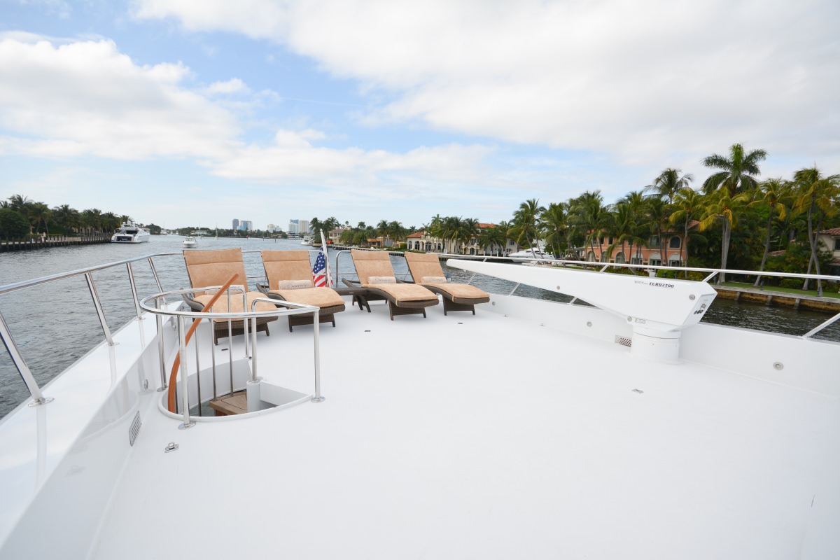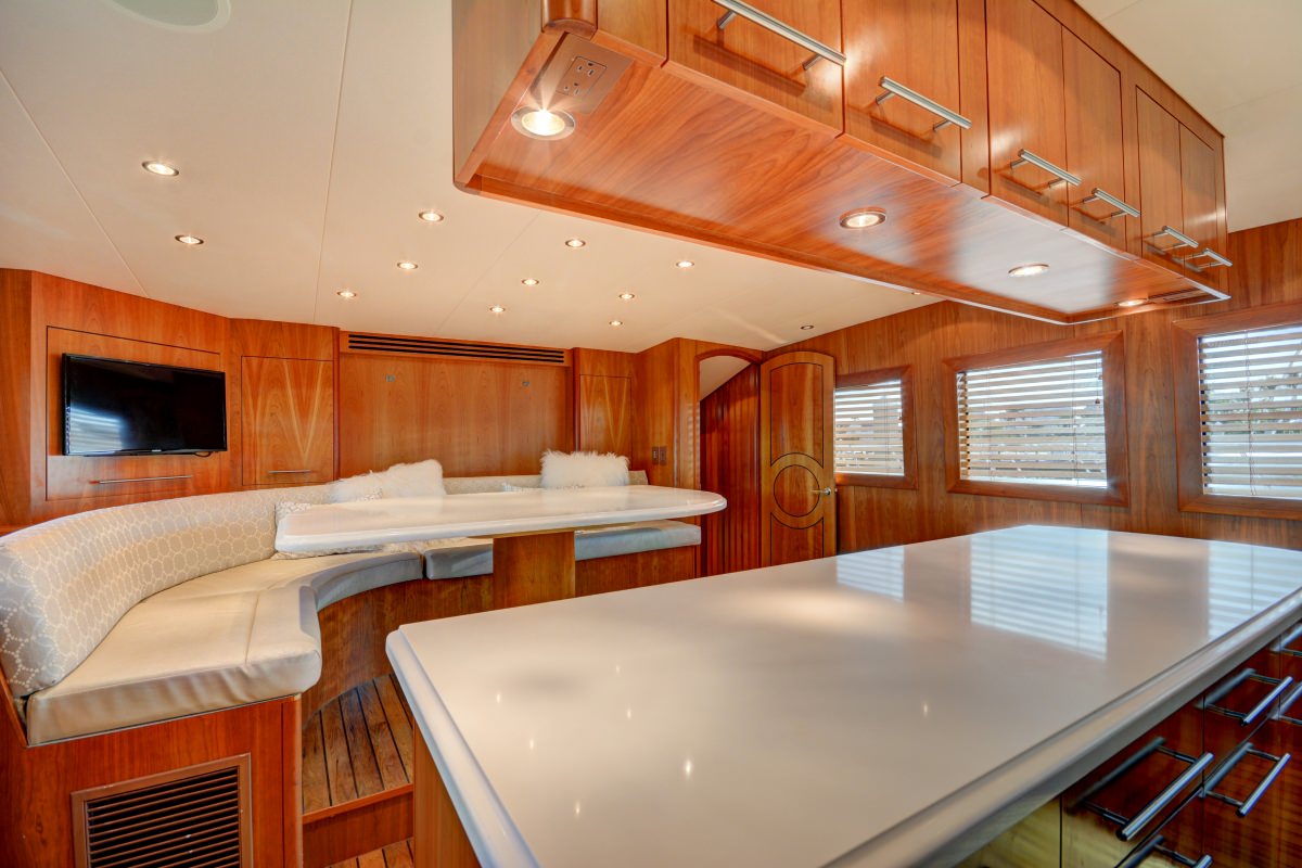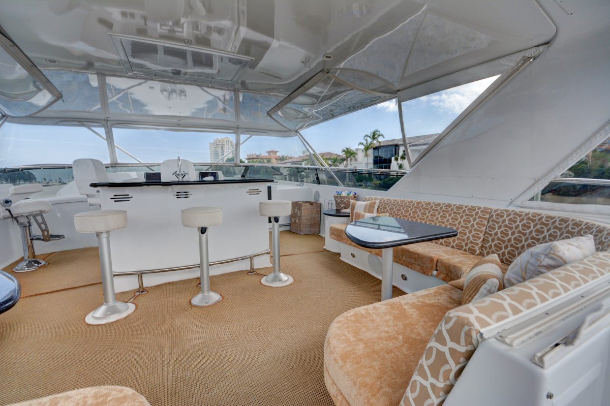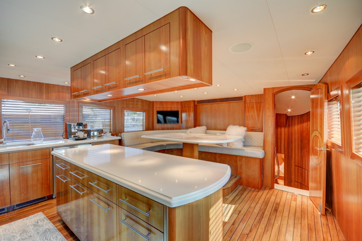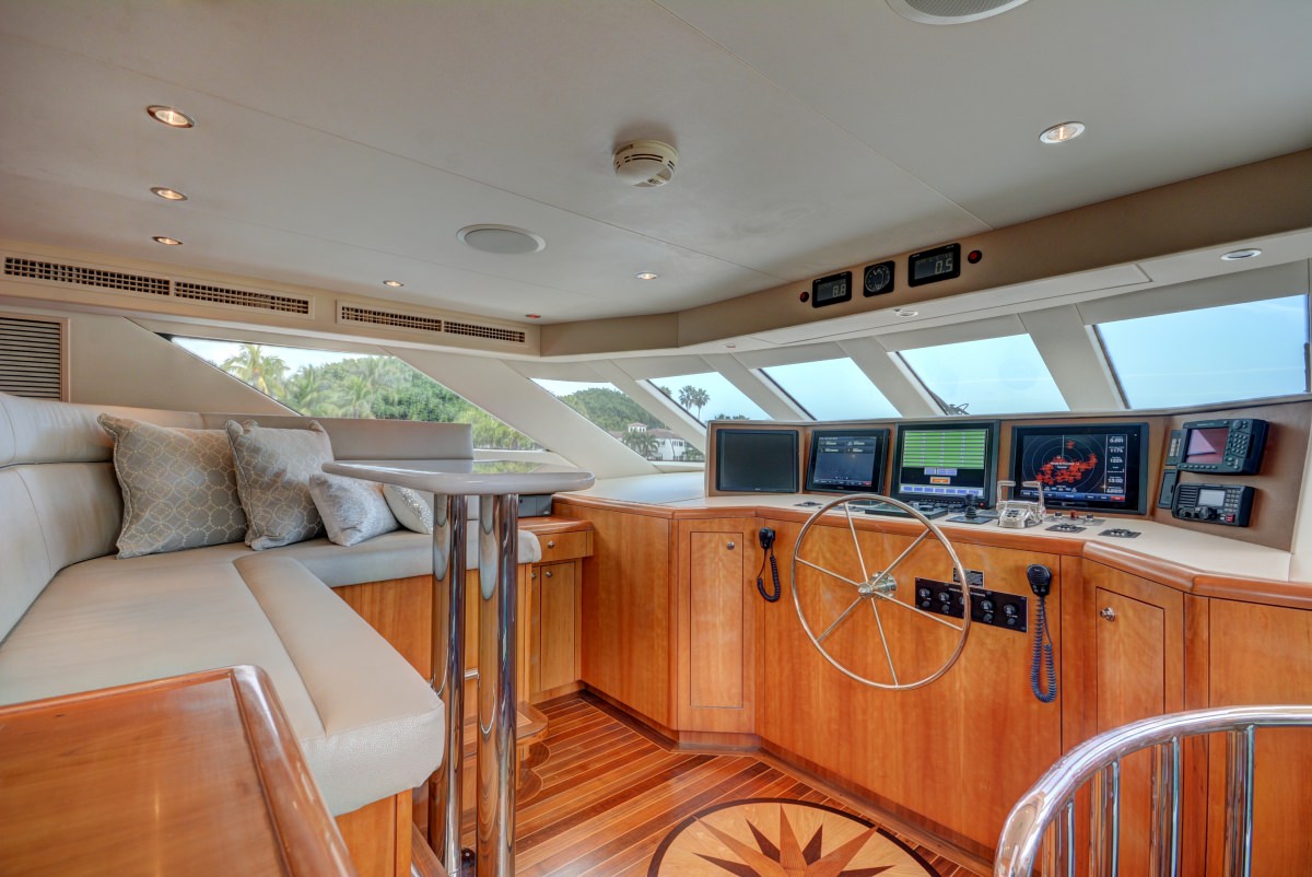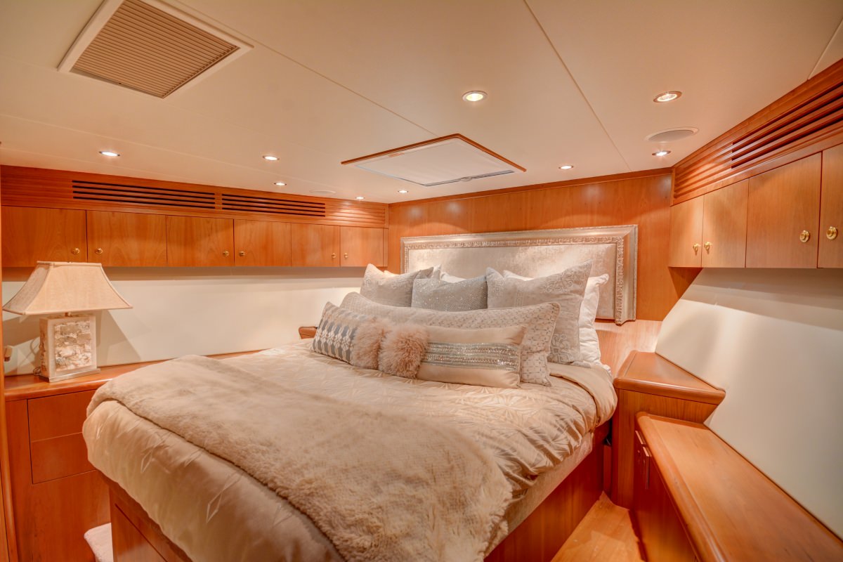 Built in 2005 by Hatteras, she received refits in both 2014 and 2015, bringing her to a like new condition. For the comfort of her guests she offers stabilizers while underway. Five luxurious cabins offer accommodations for up to eight guests. The charming, full beam master suite offers a king size bed, en-suite master bath, expansive vanity/desk, dresser, bookshelves, and plenty of portholes for ample lighting. Additionally there are three guest cabins with queen size beds and one with over and under twin bunks allowing her guests greater flexibility. The term crescendo comes from music and it means to build in loudness or intensity, and building in intensity is just what this yacht does. The main salon offers a long couch, several arm chairs, large windows that flood the room with light, and a mirrored ceiling that makes the entire space seem considerably larger. In addition, the refit in 2014 added a lovely, blue marble top bar. Her aft deck features double tables with lounge across the back providing amazing views and al fresco dining. Up on the fly bridge under the arch is a three stool bar and L shape lounge. We reach the crescendo on the fly bridge deck where we find sun loungers, barbecue, and capacious sun pads surrounding the large Jacuzzi that was added during the 2015 refit. Crescendos swim platform allows easy access to the water and water sports. She has a 42 foot Mystic tender added in 2016, two wave runners added in 2015, tubes, two paddleboards, fishing gear, spear fishing gear, snorkeling gear, and diving equipment for rendezvous diving. For more information about the motor yacht Crescendo or to find available booking dates, please contact one of our yacht charter professionals.