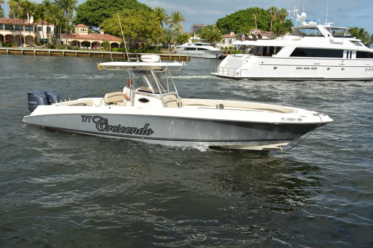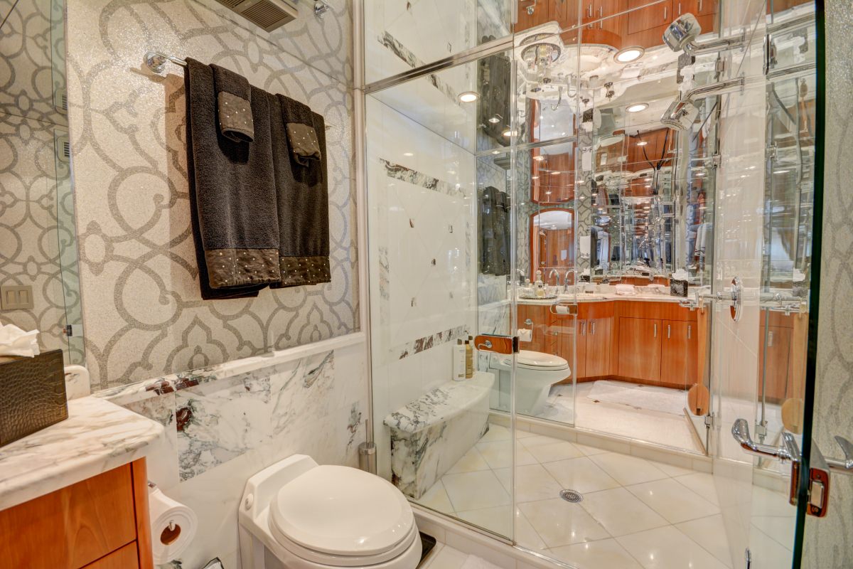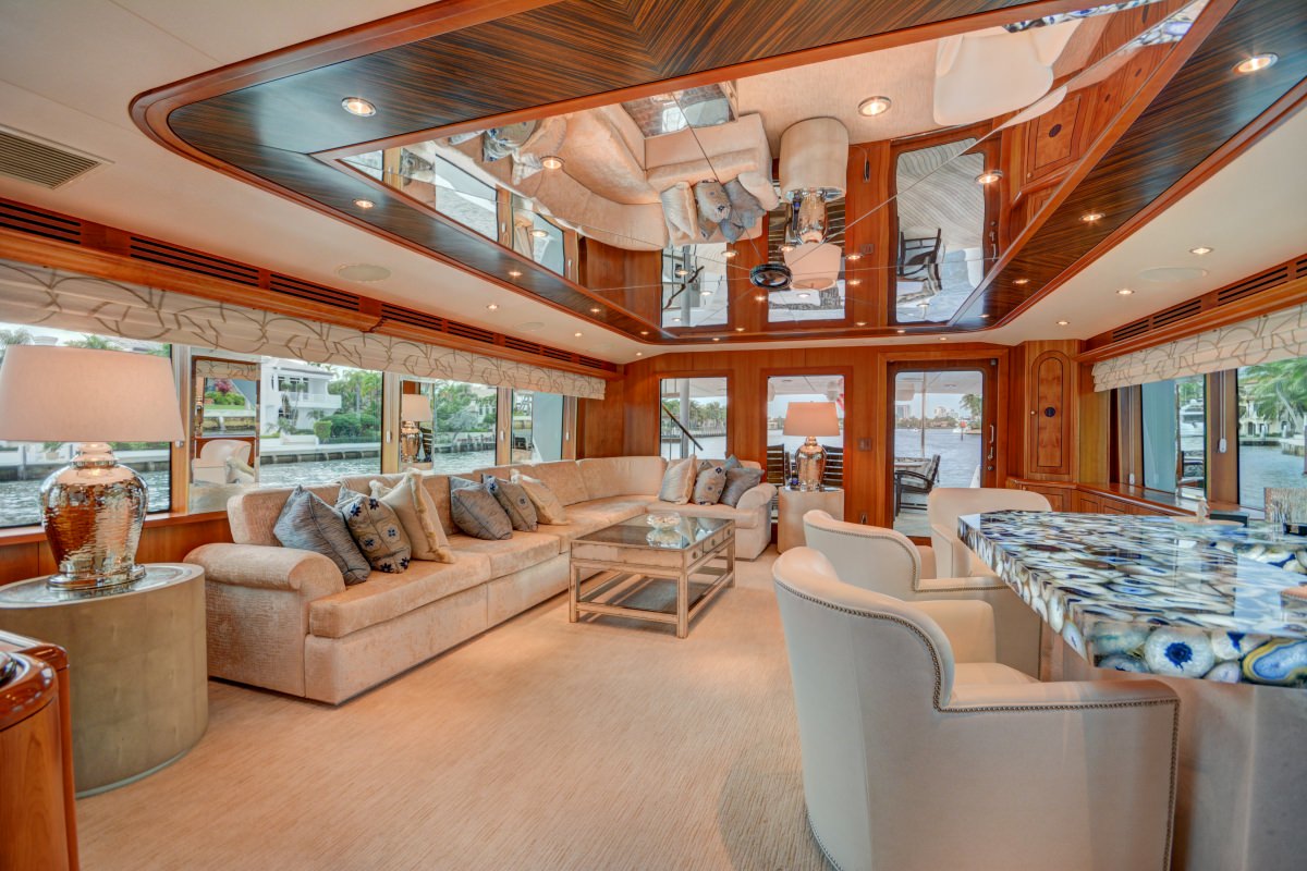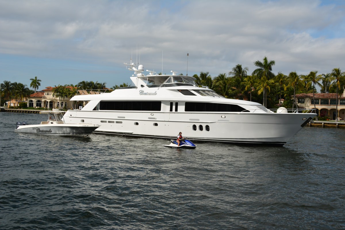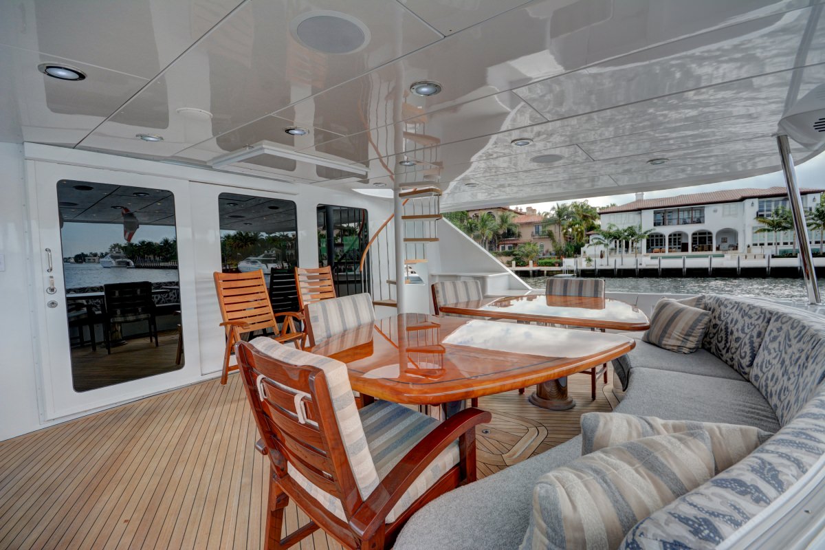 Built in 2005 by Hatteras, she received refits in both 2014 and 2015, bringing her to a like new condition. For the comfort of her guests she offers stabilizers while underway. Five luxurious cabins offer accommodations for up to eight guests. The charming, full beam master suite offers a king size bed, en-suite master bath, expansive vanity/desk, dresser, bookshelves, and plenty of portholes for ample lighting. Additionally there are three guest cabins with queen size beds and one with over and under twin bunks allowing her guests greater flexibility. The term crescendo comes from music and it means to build in loudness or intensity, and building in intensity is just what this yacht does. The main salon offers a long couch, several arm chairs, large windows that flood the room with light, and a mirrored ceiling that makes the entire space seem considerably larger. In addition, the refit in 2014 added a lovely, blue marble top bar. Her aft deck features double tables with lounge across the back providing amazing views and al fresco dining. Up on the fly bridge under the arch is a three stool bar and L shape lounge. We reach the crescendo on the fly bridge deck where we find sun loungers, barbecue, and capacious sun pads surrounding the large Jacuzzi that was added during the 2015 refit. Crescendos swim platform allows easy access to the water and water sports. She has a 42 foot Mystic tender added in 2016, two wave runners added in 2015, tubes, two paddleboards, fishing gear, spear fishing gear, snorkeling gear, and diving equipment for rendezvous diving. For more information about the motor yacht Crescendo or to find available booking dates, please contact one of our yacht charter professionals.