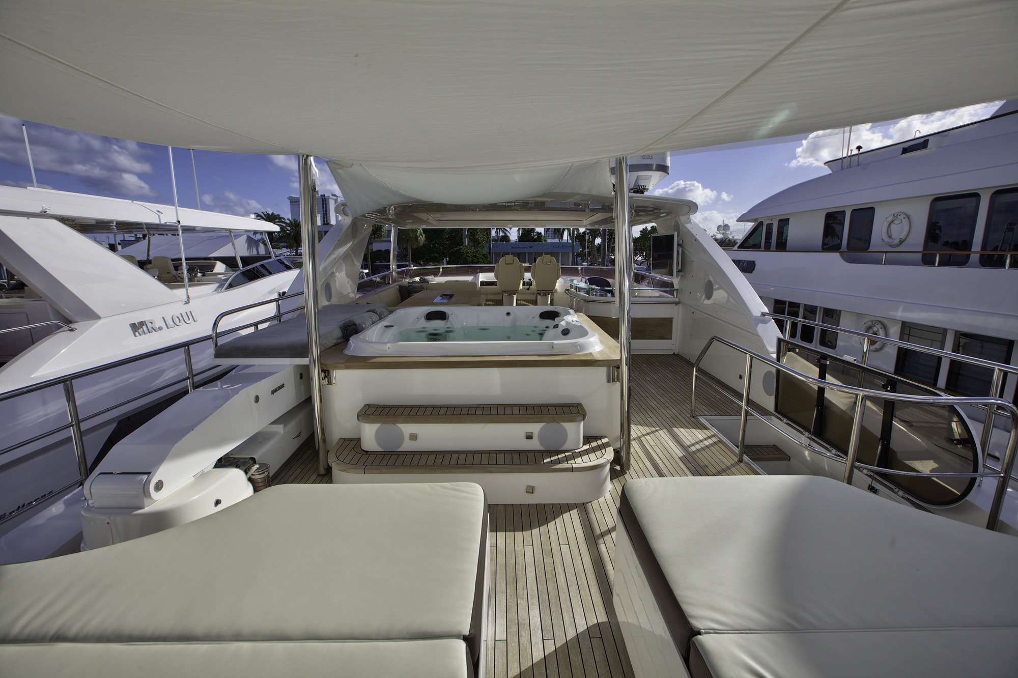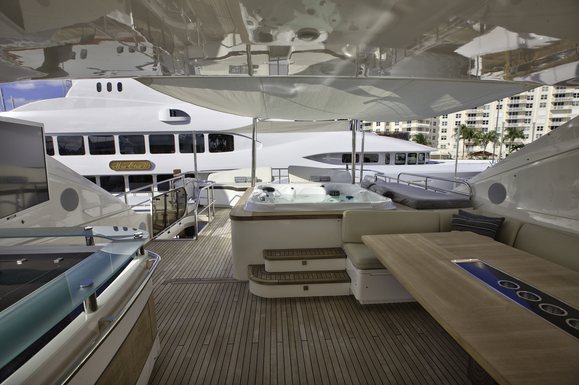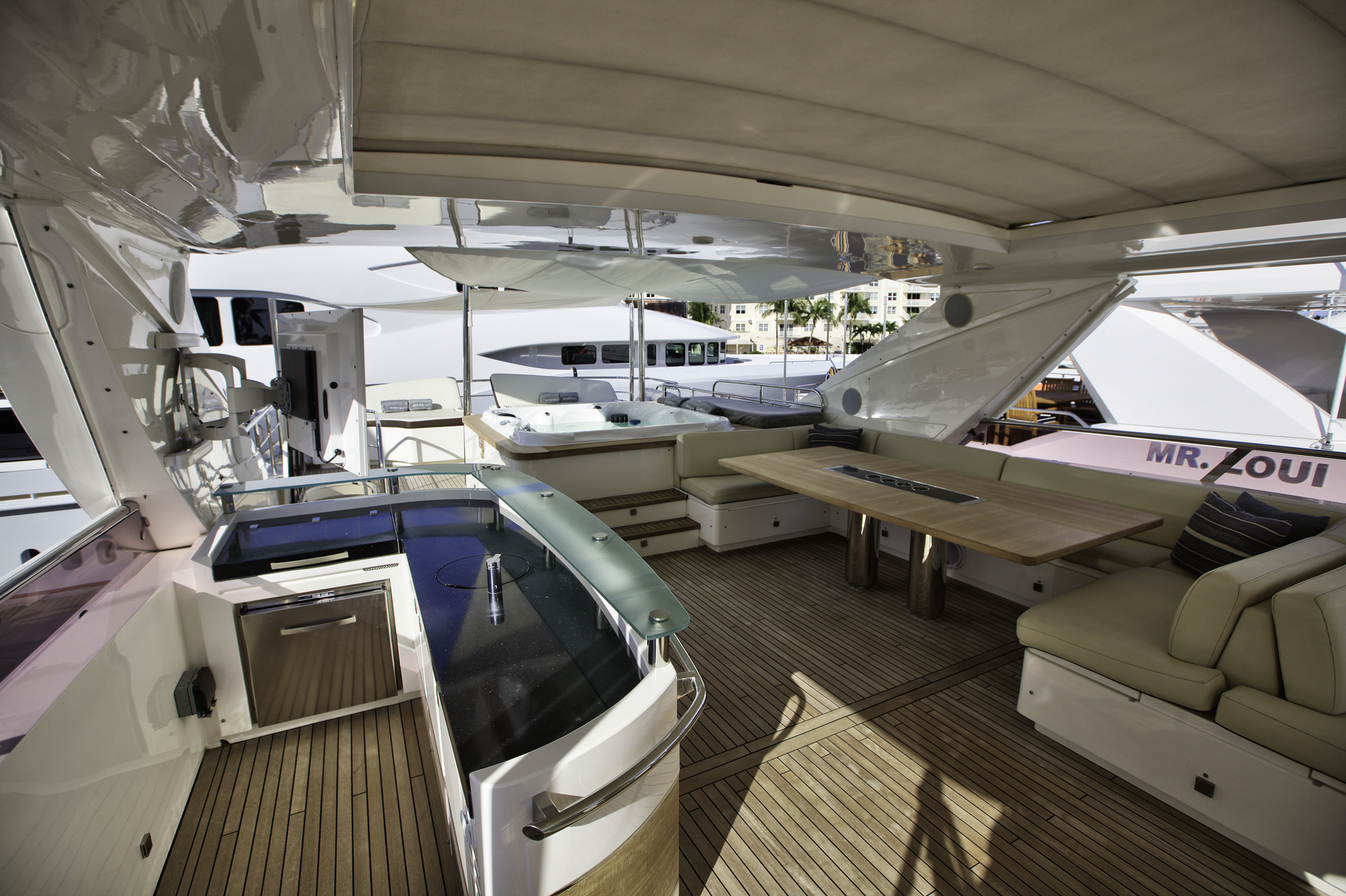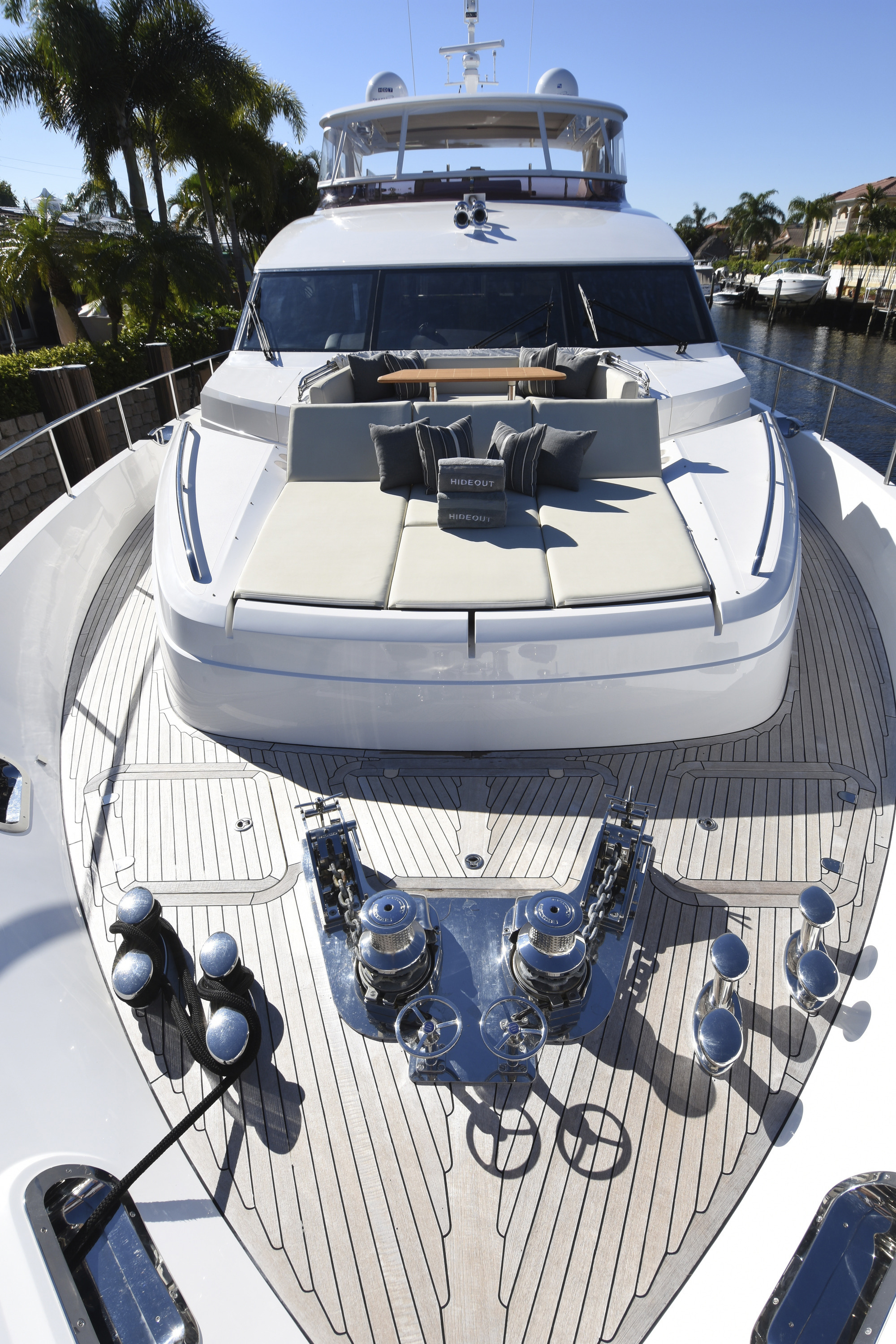Lady Cope is a 98 foot motor yacht built in 2012 by Princess UK. She has received a refit in 2016 to keep her guest comfortable. Twin MTU engines give her a cruising speed of 12 knots and a top speed of 24. She will be available for charter in the Bahamas starting in November of 2017. Four cabins offer accommodations for as many as eight guests. Her master cabin features a queen size bed, desk, sitting area with occasional table under windows for exceptional views, and large screen TV. The generous V.I.P. cabin offers a queen bed and settee. There is also a guest cabin with queen bed and a guest cabin with twin bed. Her main salon features three couches arranged in a U shape with center ottoman/coffee table. Forward of the main salon is dining for eight. Out on the aft deck is a set in table with U shaped lounge and deck chairs for al fresco dining with outstanding views. Up on the sundeck there are ample places to enjoy the sun or to find shade under one of the biminis. There is also an on deck Jacuzzi on the sundeck. A full beam swim platform offers guests effortless access to the water. For watersports Lady Cope features a 30 foot Everglades center console tender setup up with fishing gear, a three person Yamaha wave runner, a three person Sea Doo wave runner, two wakeboard, two paddleboards, water skis, tube, slide, snorkeling gear, and rendezvous diving.