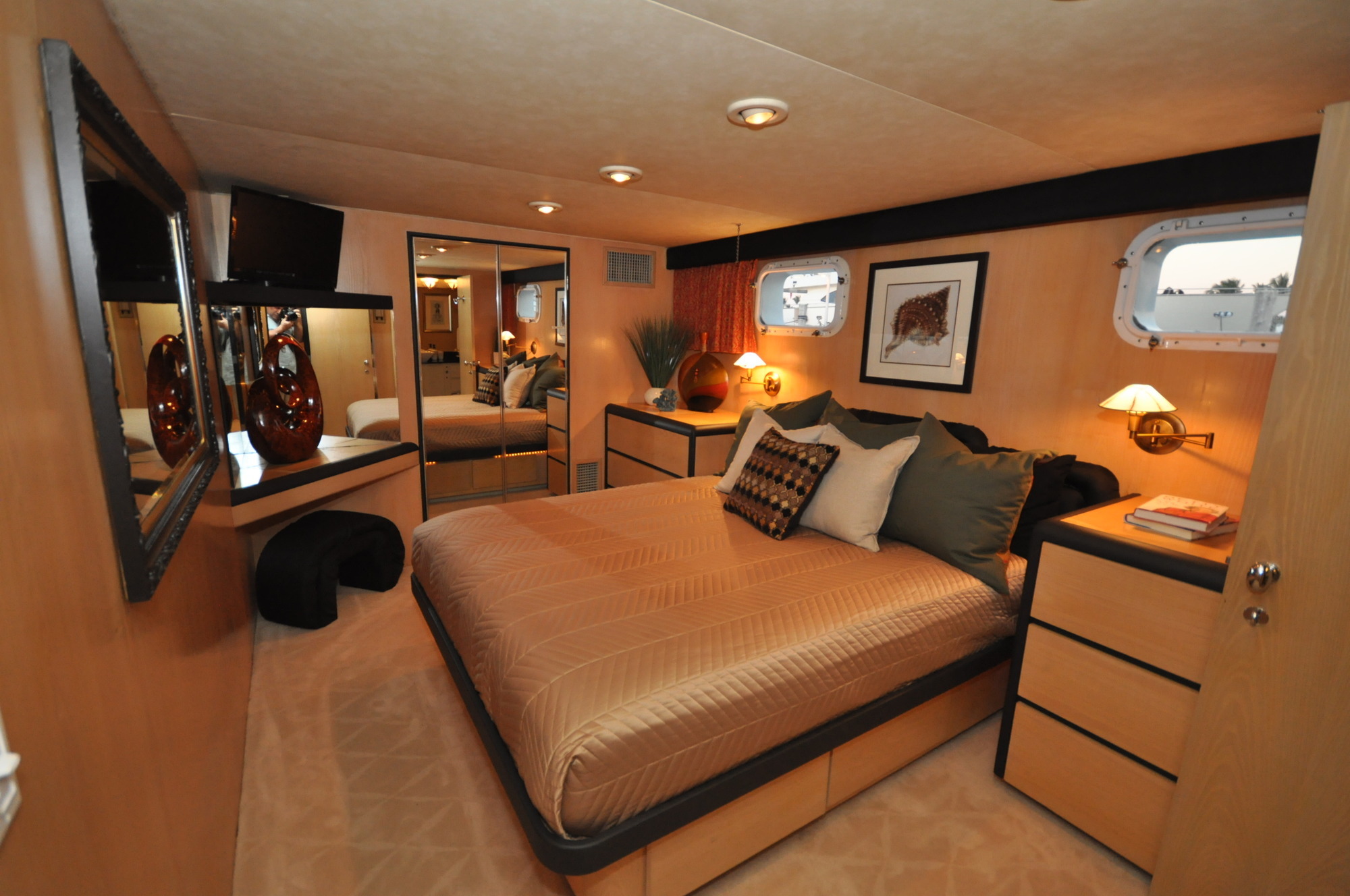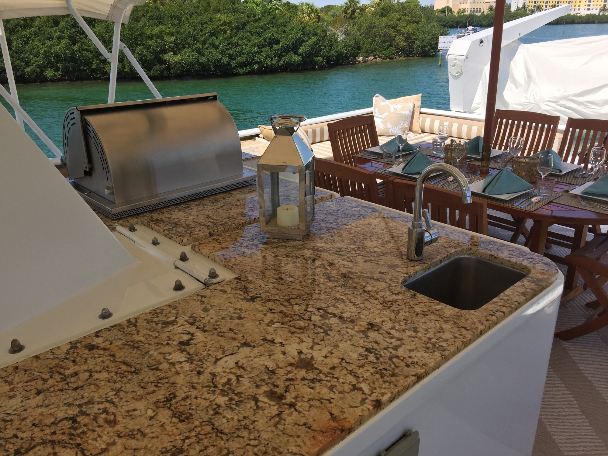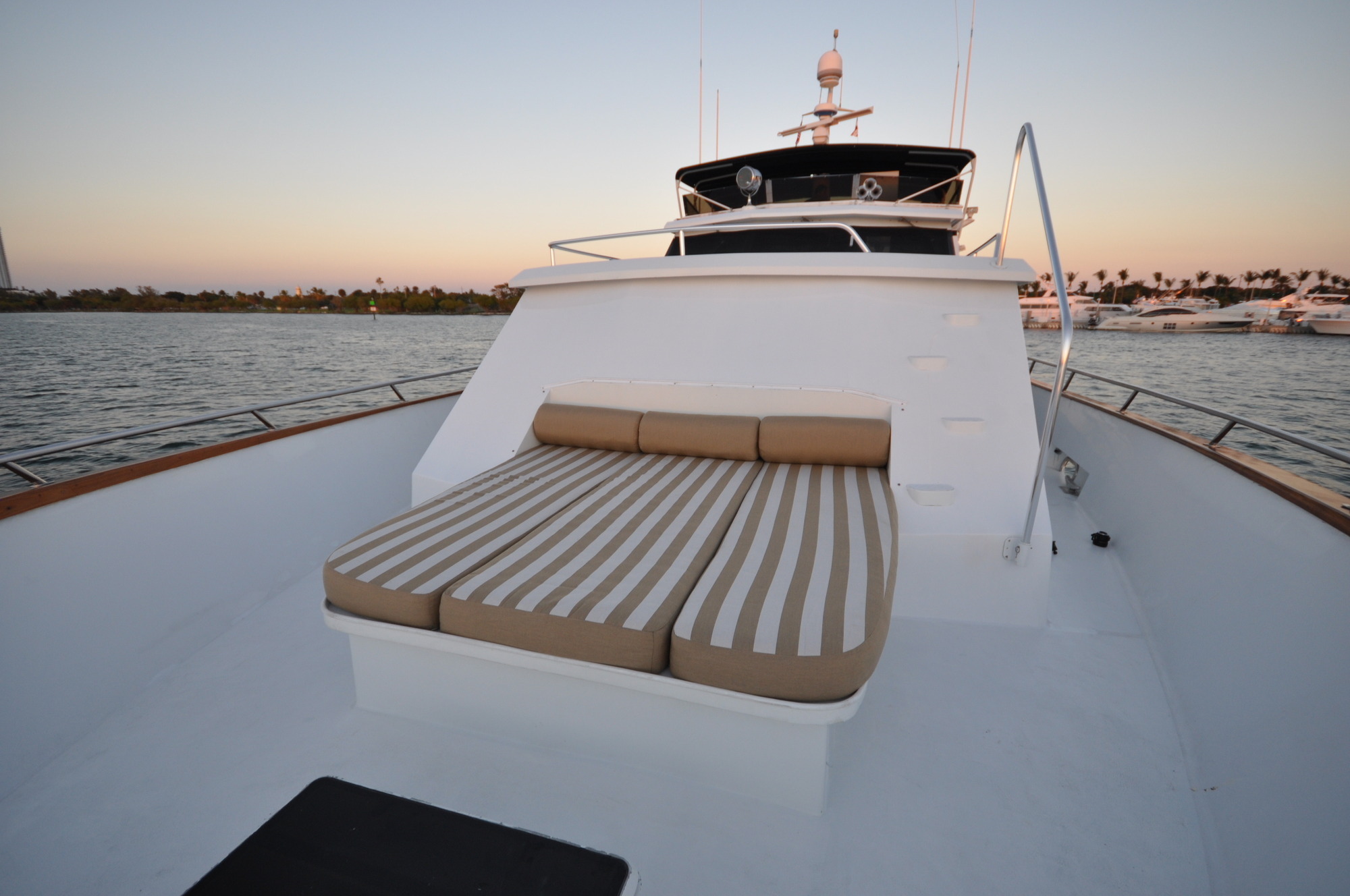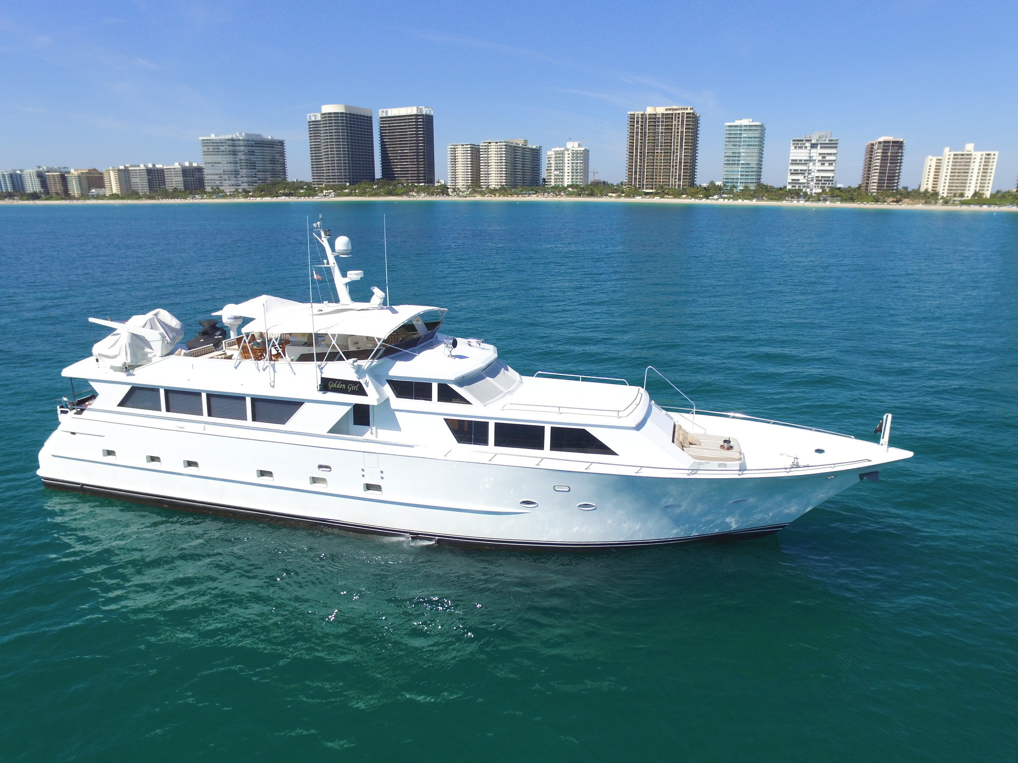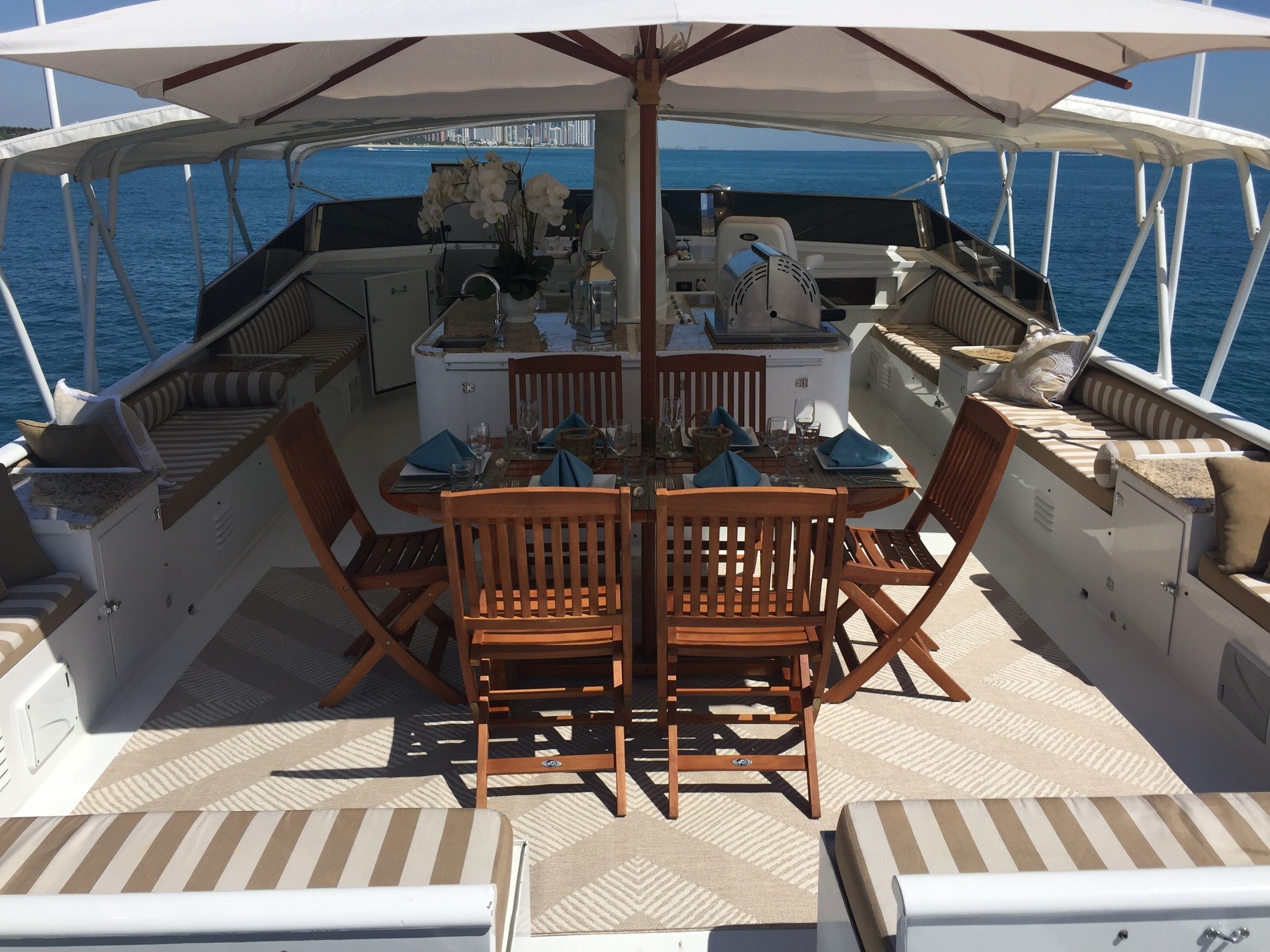 Crewed charter yacht GOLDEN GIRL offers ample exterior living. The aft deck is adjacent to the salon and has an alfresco dining option, shade and additional seating. Wrap around decks make access to the double sunpad on the foredeck, easy for all. The jewel of the outdoor living spaces aboard the motor yacht GOLDEN GIRL, is the upper deck. The upper deck is perfect for entertaining for any occasion and offers wrap around seating, an island wet bar and alfresco dining option. Removable large umbrellas provide ample shade if requested. The Broward Marine yacht GOLDEN GIRL has a beam of 6.1m (20ft) and a draft of 1.8m (5.11ft), she is powered by 2 GM 875hp engines, capable of 10 – 17 knots. Motor yacht GOLDEN GIRL boasts stabilizers for optimum comfort.