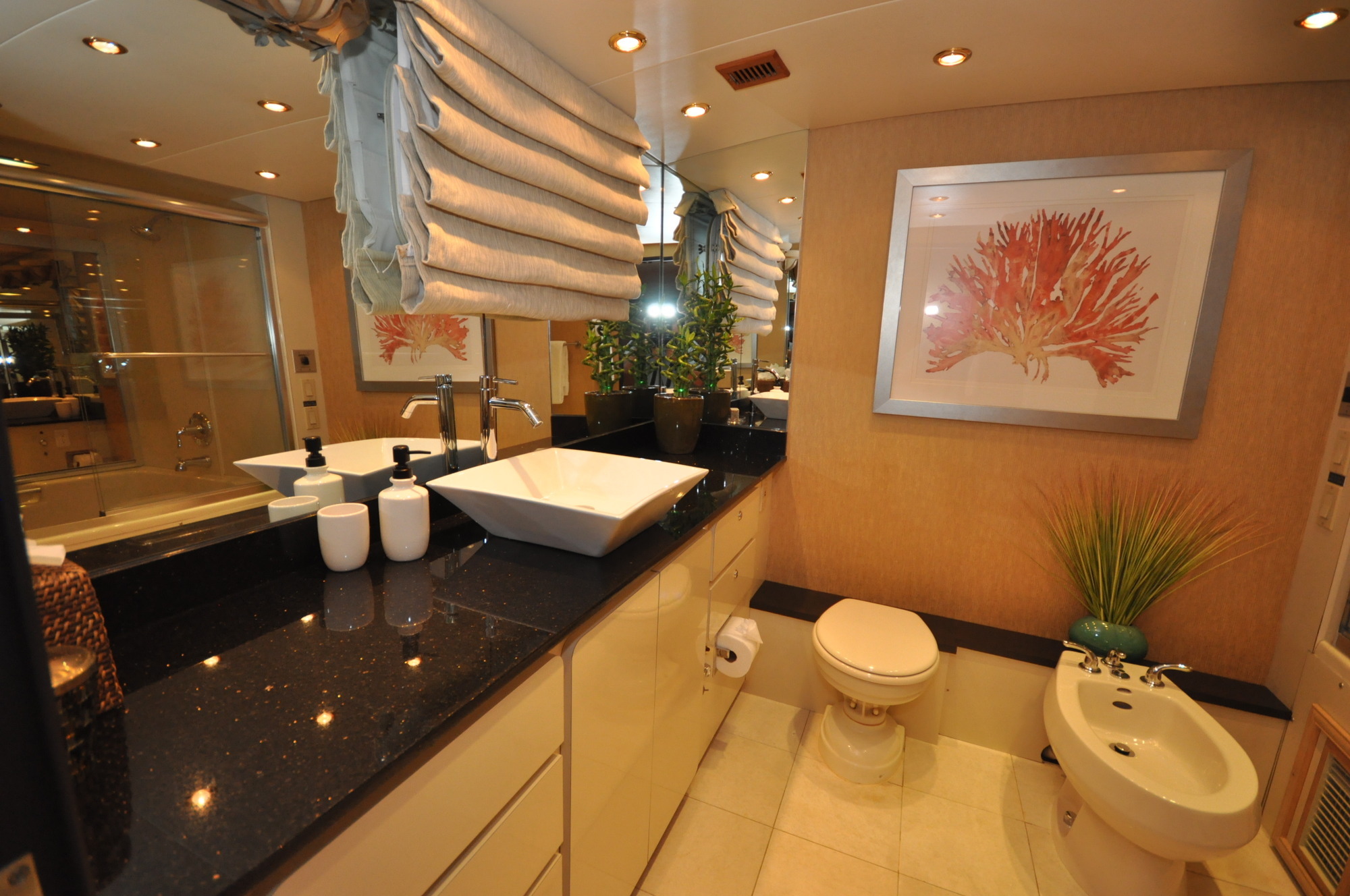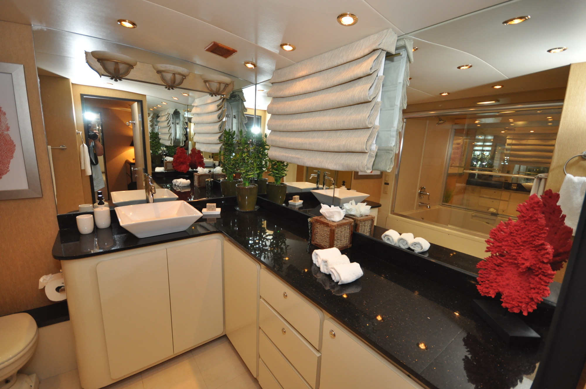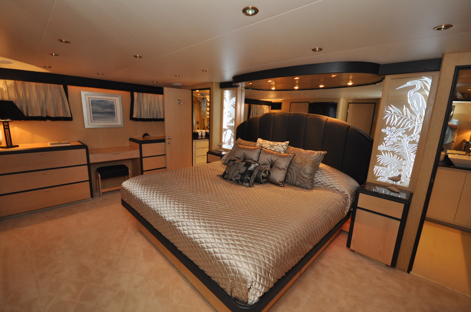 The GOLDEN GIRL yacht accommodates up to 7 charter guests, in 3 en-suite cabins. The master stateroom is full beam of the yacht and offers a king size bed, sofa, vanity and full beam en-suite with Spa Pool tub. A guest double has a queen size bed and vanity, while the twin cabin offers 2 side by side single beds and one upper Pullman berth. All 3 cabins are spacious and feature a contemporary neutral décor.