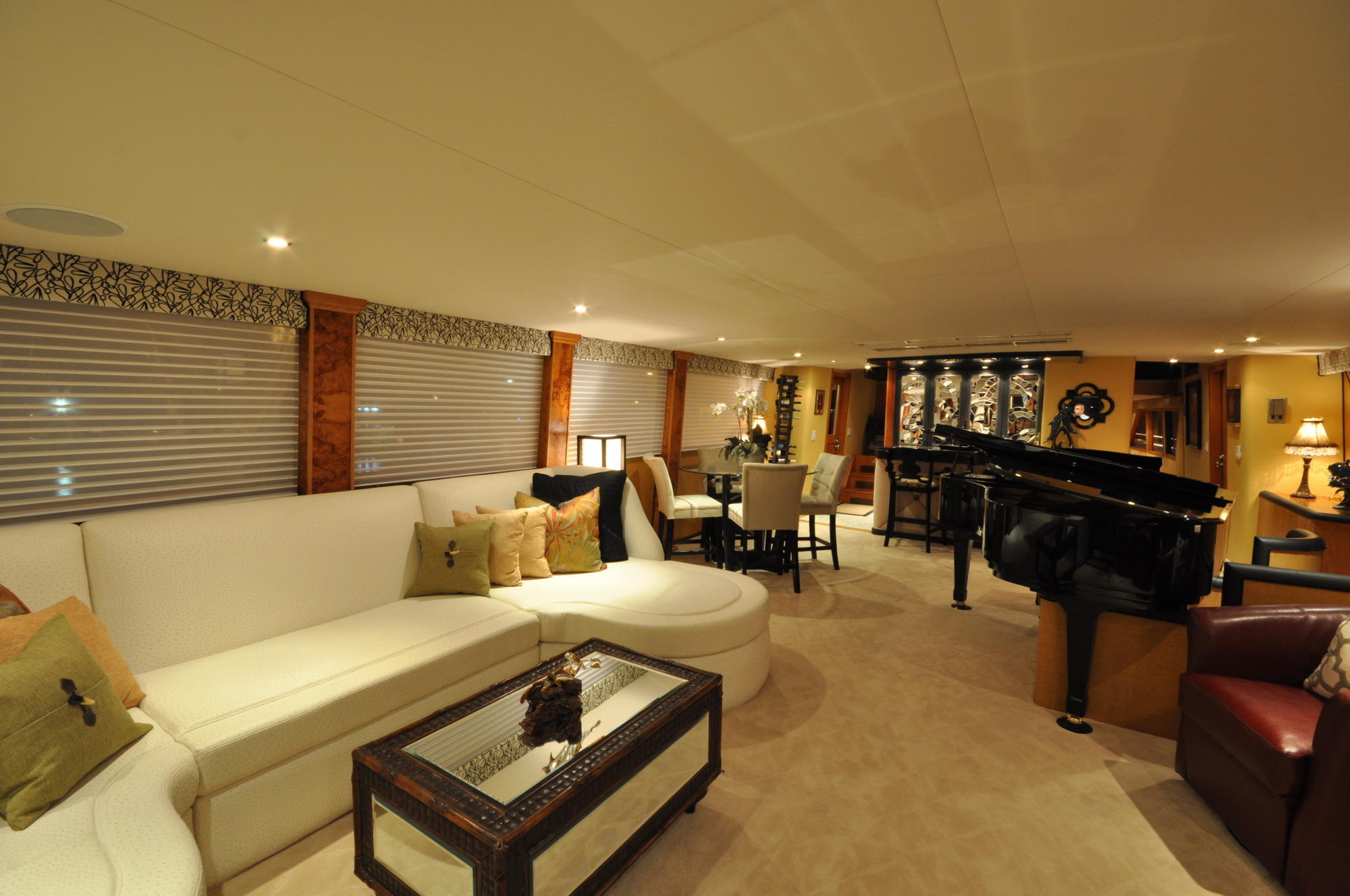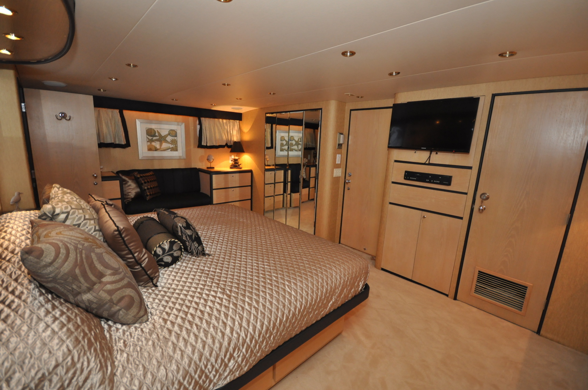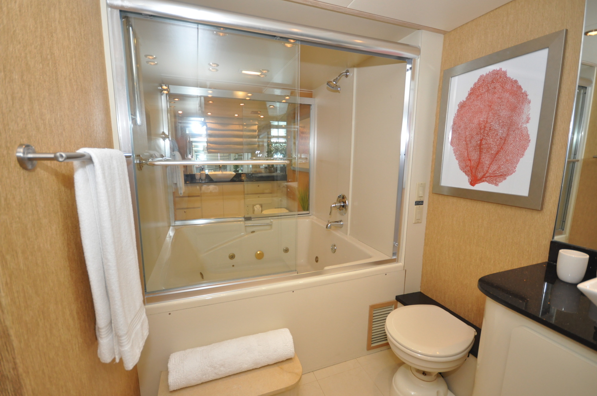The GOLDEN GIRL yacht accommodates up to 7 charter guests, in 3 en-suite cabins. The master stateroom is full beam of the yacht and offers a king size bed, sofa, vanity and full beam en-suite with Spa Pool tub. A guest double has a queen size bed and vanity, while the twin cabin offers 2 side by side single beds and one upper Pullman berth. All 3 cabins are spacious and feature a contemporary neutral décor.