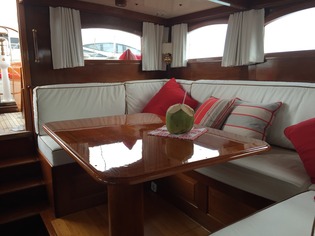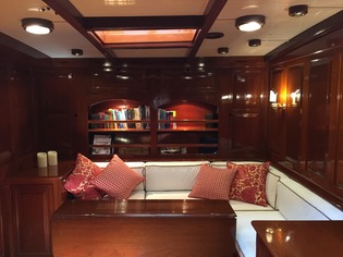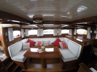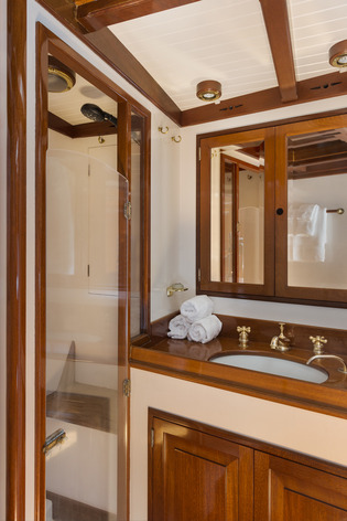 NORTHERN STAR accommodates 6 guests, 4 adults and 2 children, in 3 cabins. The interior is fully air-conditioned and headroom is 8’ 6” throughout The spacious Master Suite is forward with a queen v-berth, hanging locker and private head with a separate stall shower. There is also a comfortable seat and a writing desk on the starboard side. A center hallway runs aft to the salon. Aft and to port of the master stateroom is an elegant VIP Suite that was originally planned for the King and Queen of Norway who frequented the yacht. This cabin is an intimate oasis featuring his and her twins, ample storage and a private head with hand-shower. Also aft of the master on the port side is a common head with shower (shared by crew). On the starboard side are two well-appointed guest cabins (one of which are used by the crew), each with over and under single berths, a bureau and hanging locker. These two cabins share the common head and hand-shower.