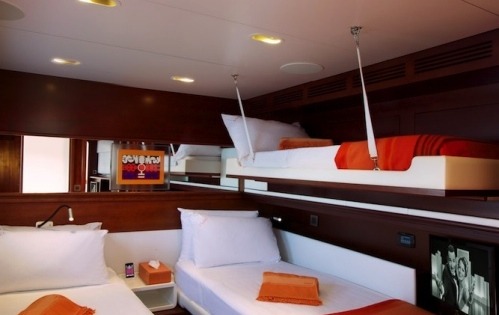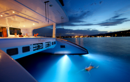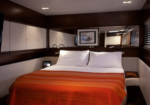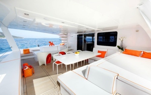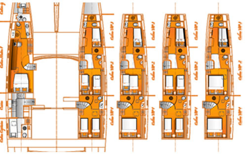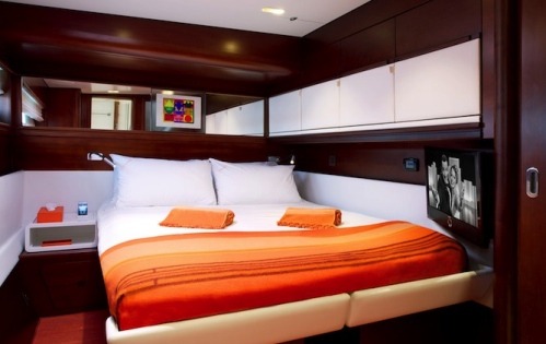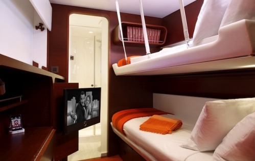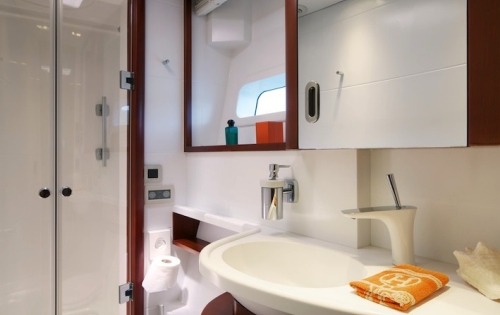She can easily accommodate up to 6 adults and 2 teens in 4 cabins with ensuite showers & heads – including an outstanding master cabin located in the portside hull. 9 guests can be sleeping with an additional child in a pullman. The starboard hull offers multiple combinations; 2 double cabins easily split into twins if needed for teenagers or singles, one offers a triple accommodation with an additional 1,40 cm long pullman (child only) and a further cabin which has upper & lower berths (size is on both beds 185x75 m). To insure total privacy during a charter, the crew has a separate companionway, as well as their own bathrooms & shower.