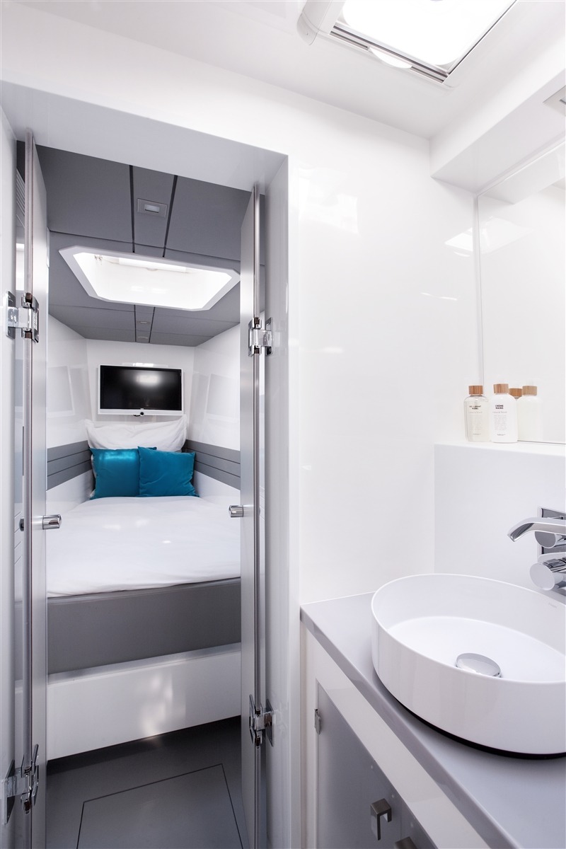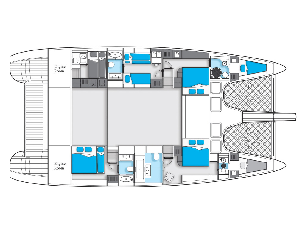 Number of cabins: 4 +1* Cabin configuration: 3 Double, 1 Twin +1 Single* Bed configuration: 2 Pullman, 3 Queen, 2 Single +1* Number of guests: 9 + 2 Cabin Arrangements: VIP Bow 1 - double cabin with king bed VIP Bow 2 - double cabin with king bed VIP Aft - double cabin with king bed with lower slide out Pullman (ideal for a baby up to 5 years old) Twin cabin with 2 single beds and 1 Pullman *Optional – single port forepeak cabin for 1 adult (entrance only from the outside, no bathroom)