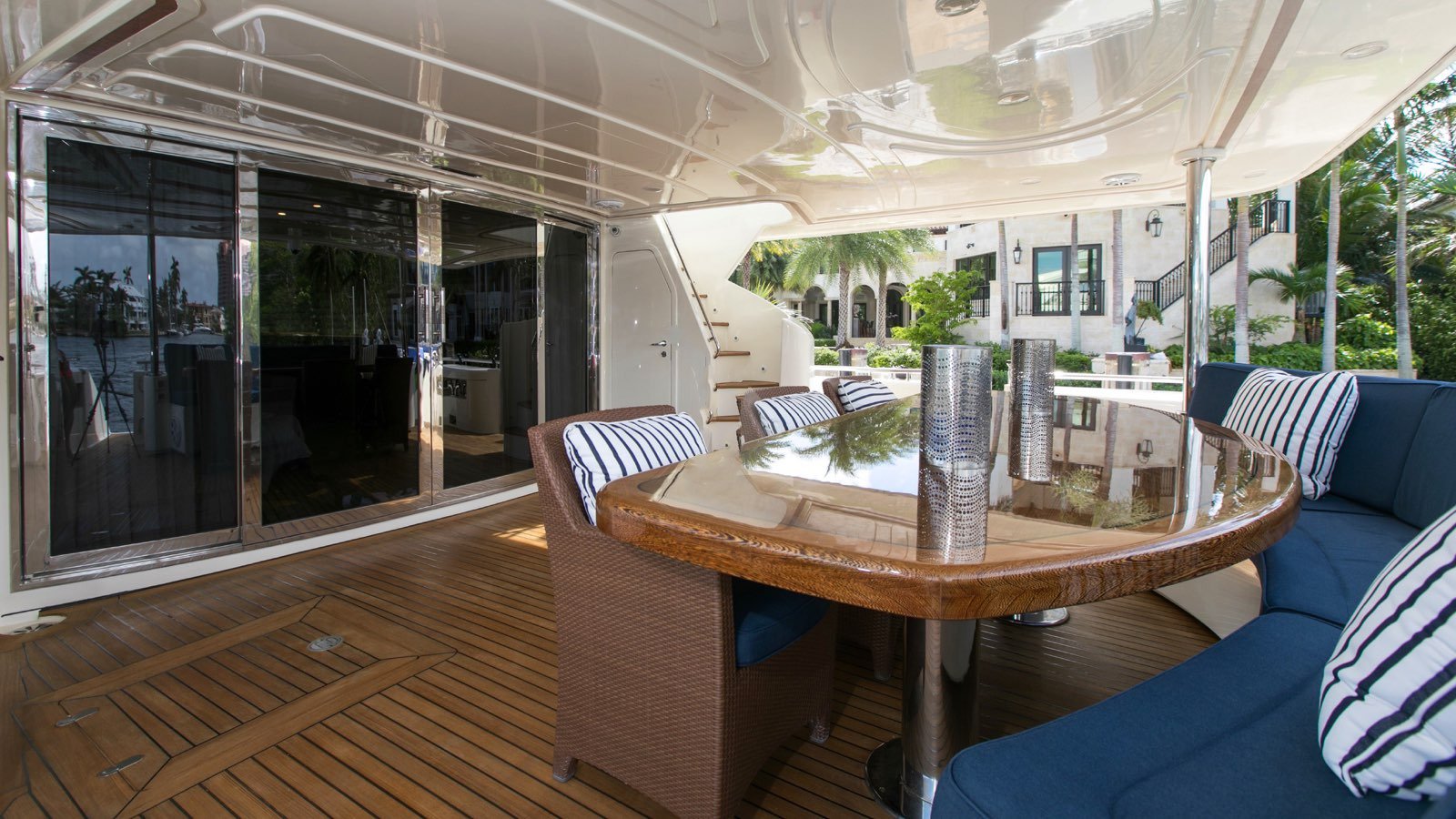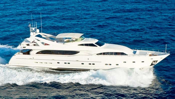 Welcome to MAMBO! Delivered in 2006 with a 2015 refit, MAMBO has been completely updated and customized by her owner. MAMBO is an all fiberglass constructed 112'/34.14m raised pilothouse motor yacht, designed by Gianni Zuccon and built by Ferretti Yachts Custom Line Division in Ancona, Italy. MAMBO is a brand new addition to the charter market running with an experienced and dynamic crew, who have all been onboard for over 2 years. With a spacious interior layout and exceptional flybridge, MAMBO is an excellent option for charter in the Bahamas. The main salon’s custom furnishings, coupled with fine woodwork provide a relaxed and refined environment for any occasion. An open and spacious dining salon forward of the main salon features built in cabinetry and easy serving capabilities for crew. With a private and convenient on-deck, full-beam master stateroom, MAMBO is designed to comfortably accommodate up to 8 guests in 4 staterooms. Perfect for 4 couples or two families alike. Below deck you will find a full-beam, VIP stateroom aft and 2 forward mirrored double staterooms. All staterooms are appointed with personal entertainment systems and ensuite bathrooms. Guests can enjoy MAMBO’s open flybridge with plenty of seating, sunpads around a jacuzzi, bar area, and alfresco dining all under optional shade. A few steps down from the main aft deck, an open garage door creates the perfect swim platform for easy access into the ocean.