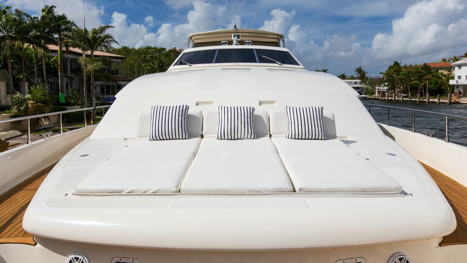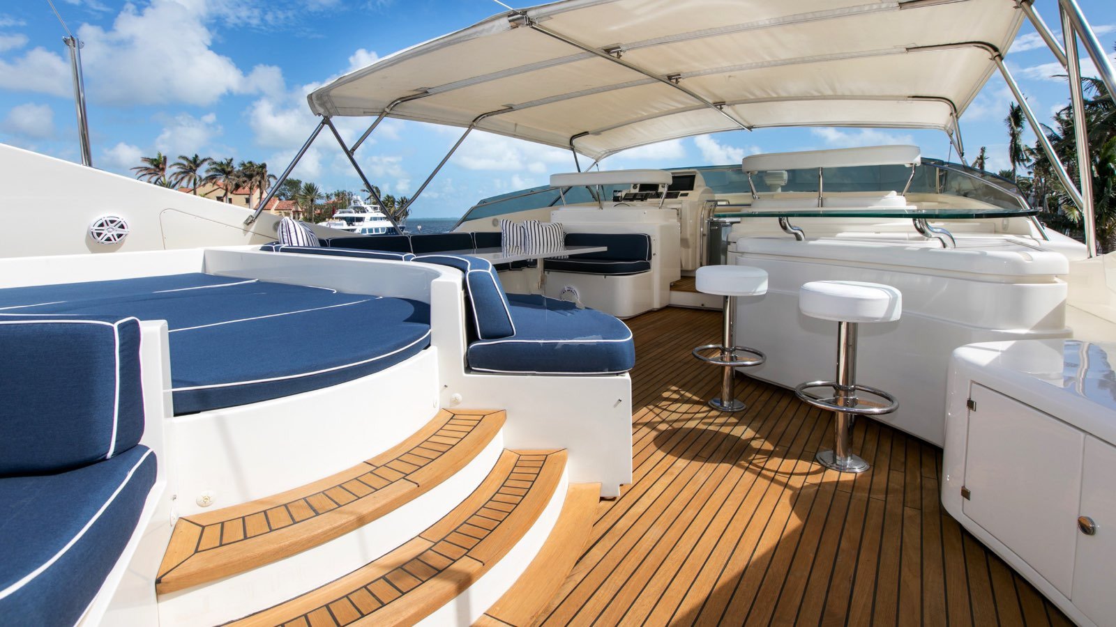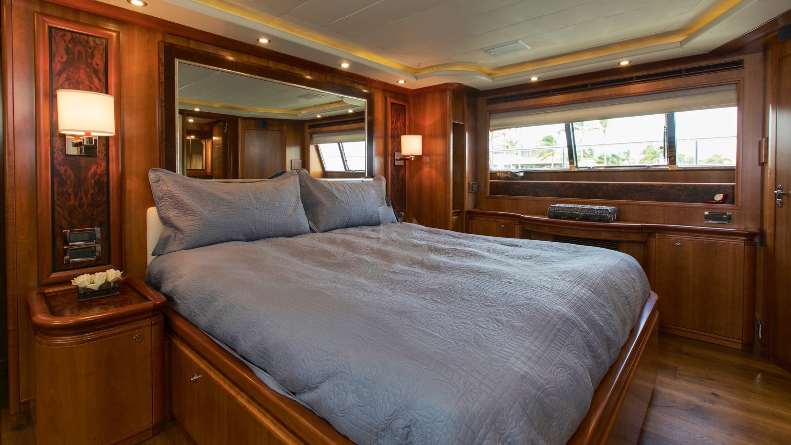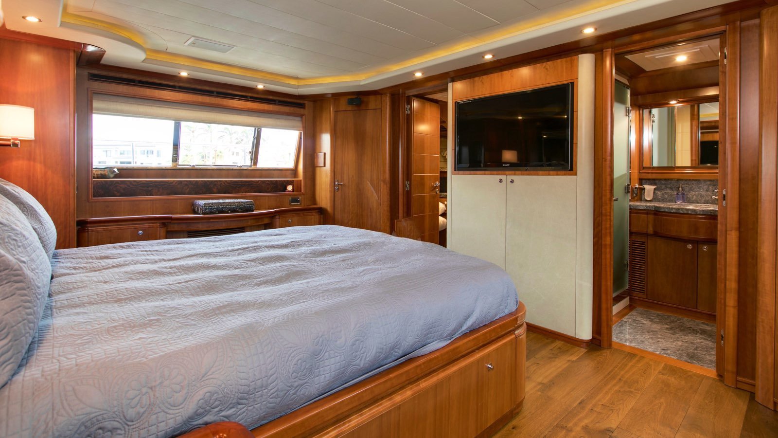 All guests staterooms feature the following: HDTV's (w/Direct TV), individual climate control, blackout shades, reading lights, and Wi-Fi access. 77 bottle wine cellar located below deck, mid ships Crew access to below staterooms Master Stateroom: Full-beam Master stateroom located fwd/stbd side Main Deck. King bed. Electric/adjustable, which raises and lowers to your comfort level. Nightstands and reading lamps. His and hers identical ensuite, marble countertops, mirrored medicine cabinet Connecting marble shower w/privacy glass Double door full height closet at main entry, plus 2x his/hers closets. Settee and vanity port side w/storage cabinets 40" HD TV. VIP Stateroom: Full-beam, located aft below deck. King bed. 2x full height walk-in closets. Sit down vanity, stbd side w/lift up mirrored vanity top. His and hers ensuite: port side his w/ shower, stbd side hers w/ Jacuzzi tub 40" HD TV. Guest Stateroom: Below deck, port side Queen bed. Small sit down vanity port side w/ lift up mirror Ensuite, full height stand up shower w/ smoked curved glass door entry 18" HD TV Guest Stateroom: Below deck, stbd side Queen bed. Small sit down vanity stbd side w/ lift up mirror Ensuite, full height stand up shower w/ smoked curved glass door entry 18" HD TV