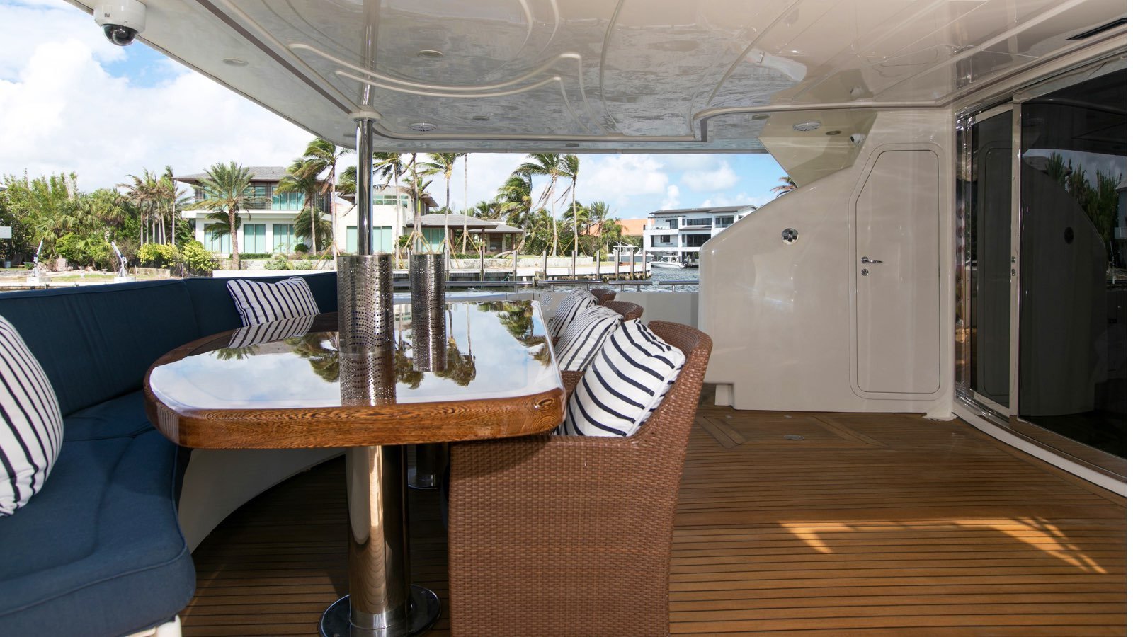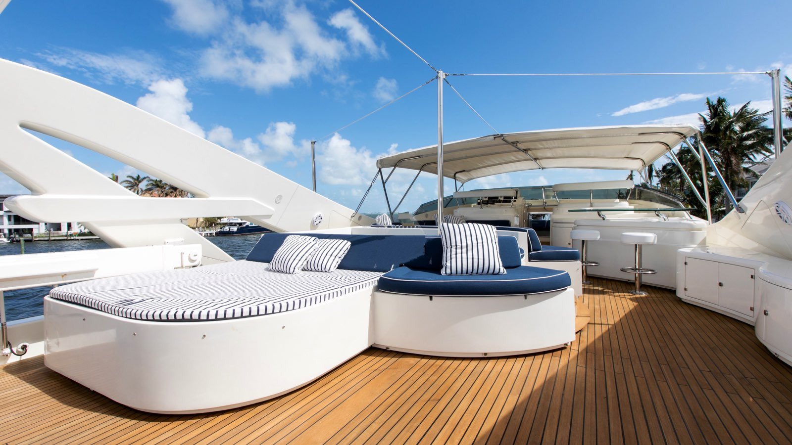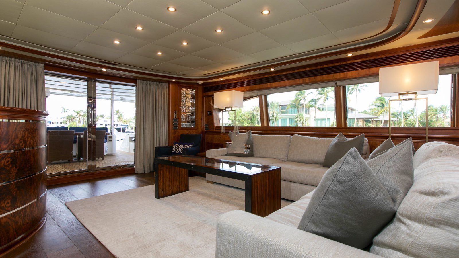All guests staterooms feature the following: HDTV's (w/Direct TV), individual climate control, blackout shades, reading lights, and Wi-Fi access. 77 bottle wine cellar located below deck, mid ships Crew access to below staterooms Master Stateroom: Full-beam Master stateroom located fwd/stbd side Main Deck. King bed. Electric/adjustable, which raises and lowers to your comfort level. Nightstands and reading lamps. His and hers identical ensuite, marble countertops, mirrored medicine cabinet Connecting marble shower w/privacy glass Double door full height closet at main entry, plus 2x his/hers closets. Settee and vanity port side w/storage cabinets 40" HD TV. VIP Stateroom: Full-beam, located aft below deck. King bed. 2x full height walk-in closets. Sit down vanity, stbd side w/lift up mirrored vanity top. His and hers ensuite: port side his w/ shower, stbd side hers w/ Jacuzzi tub 40" HD TV. Guest Stateroom: Below deck, port side Queen bed. Small sit down vanity port side w/ lift up mirror Ensuite, full height stand up shower w/ smoked curved glass door entry 18" HD TV Guest Stateroom: Below deck, stbd side Queen bed. Small sit down vanity stbd side w/ lift up mirror Ensuite, full height stand up shower w/ smoked curved glass door entry 18" HD TV
