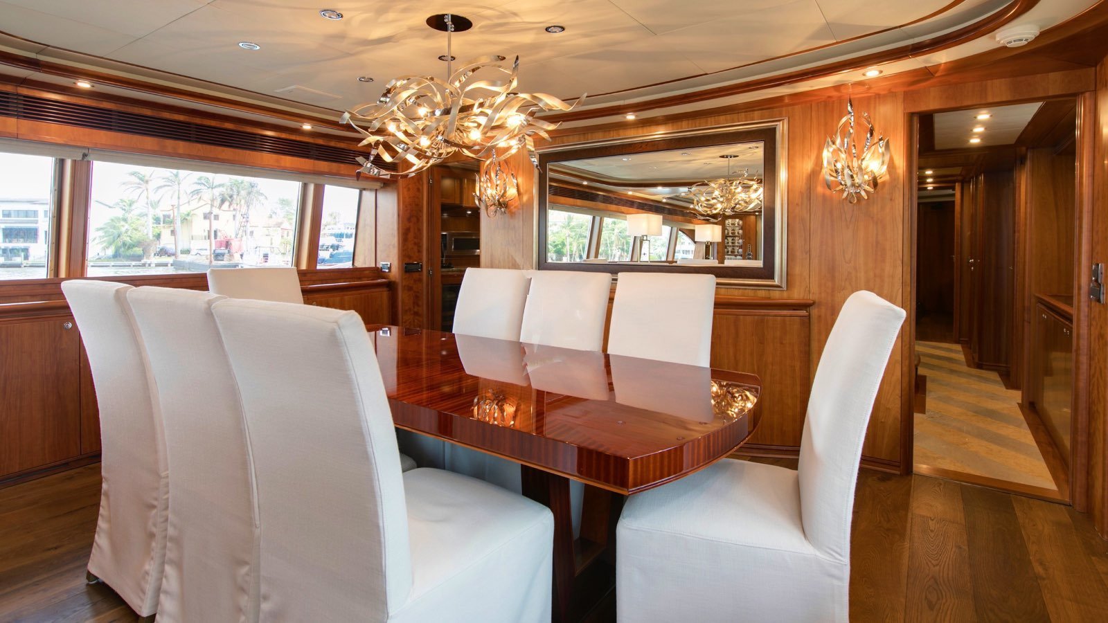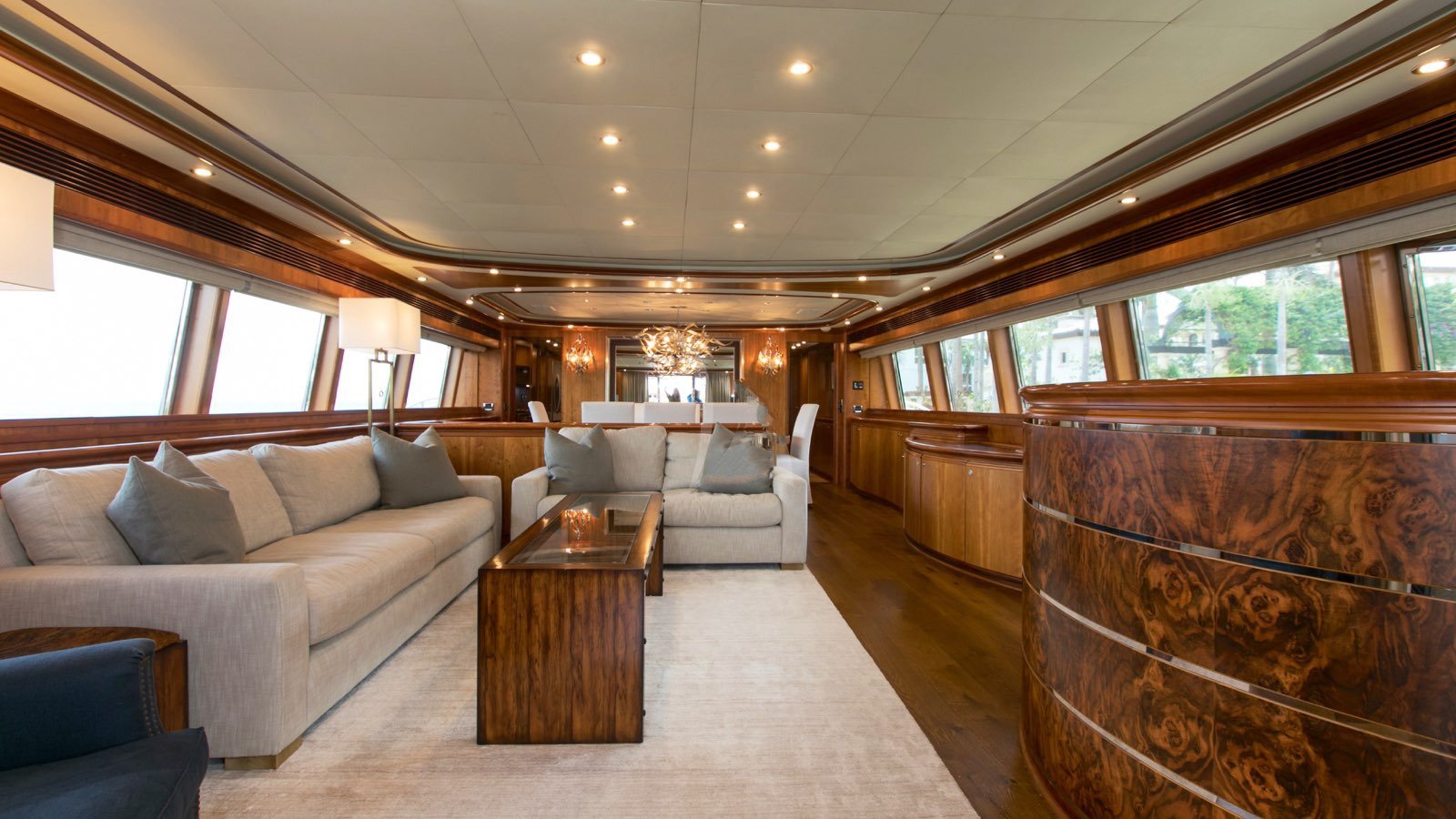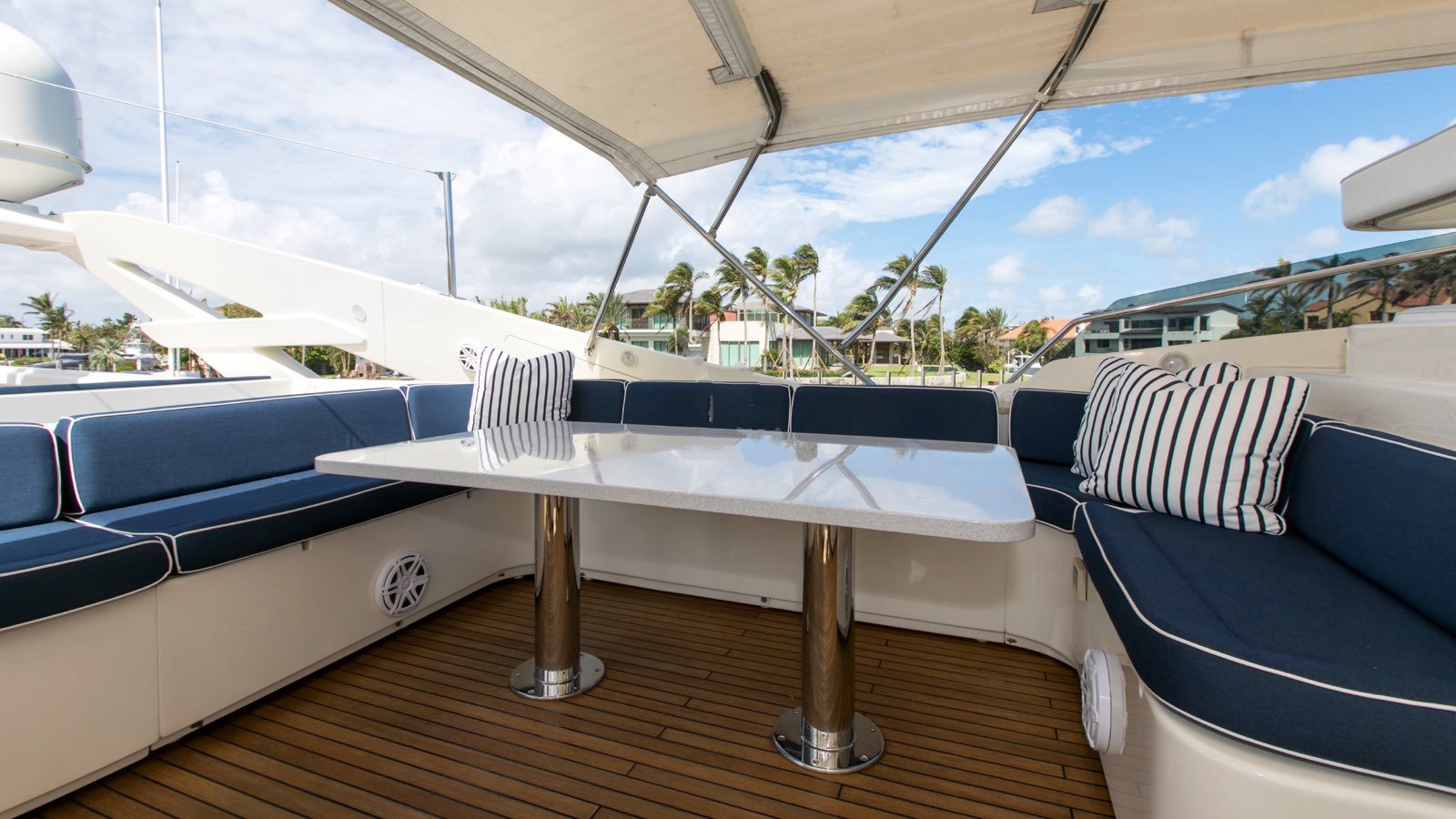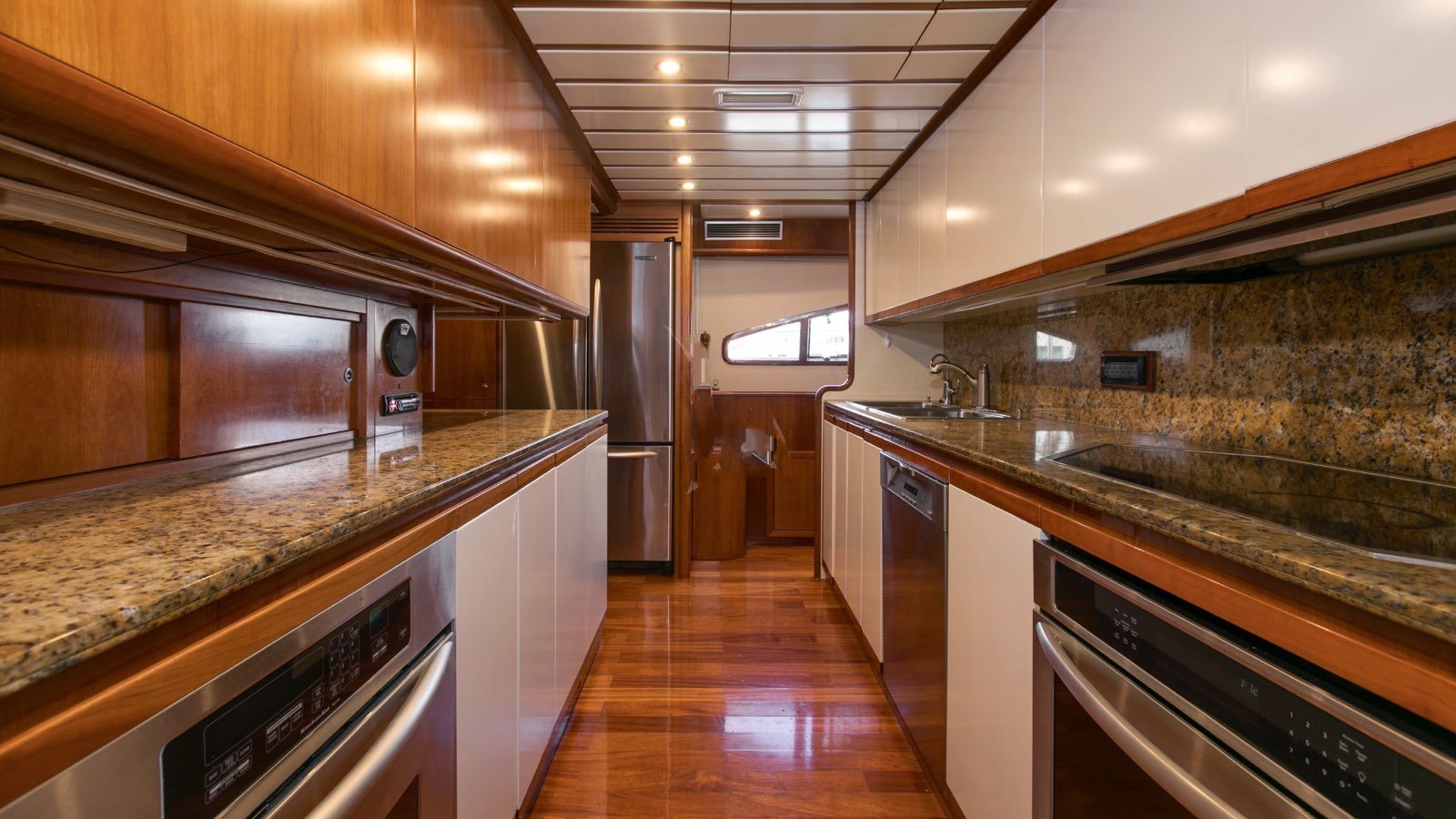 All guests staterooms feature the following: HDTV's (w/Direct TV), individual climate control, blackout shades, reading lights, and Wi-Fi access. 77 bottle wine cellar located below deck, mid ships Crew access to below staterooms Master Stateroom: Full-beam Master stateroom located fwd/stbd side Main Deck. King bed. Electric/adjustable, which raises and lowers to your comfort level. Nightstands and reading lamps. His and hers identical ensuite, marble countertops, mirrored medicine cabinet Connecting marble shower w/privacy glass Double door full height closet at main entry, plus 2x his/hers closets. Settee and vanity port side w/storage cabinets 40" HD TV. VIP Stateroom: Full-beam, located aft below deck. King bed. 2x full height walk-in closets. Sit down vanity, stbd side w/lift up mirrored vanity top. His and hers ensuite: port side his w/ shower, stbd side hers w/ Jacuzzi tub 40" HD TV. Guest Stateroom: Below deck, port side Queen bed. Small sit down vanity port side w/ lift up mirror Ensuite, full height stand up shower w/ smoked curved glass door entry 18" HD TV Guest Stateroom: Below deck, stbd side Queen bed. Small sit down vanity stbd side w/ lift up mirror Ensuite, full height stand up shower w/ smoked curved glass door entry 18" HD TV