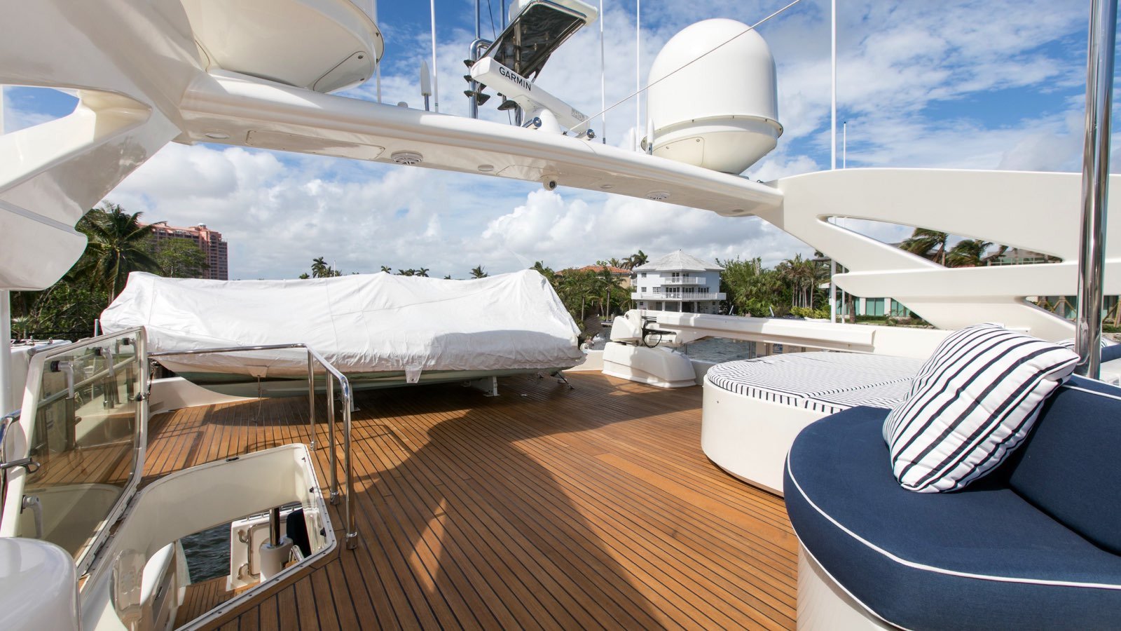 Tenders & Toys: 35'/10.7m Scout towed tender w/3x 300hp engines (2017 model, side dive door, mini cabin w/AC, outriggers) 13.5'/4.11m Novurania w/ 50 hp engine 2x Rigid stand-up paddle boards 2x Waverunners (2-person) 1x Wakeskate Selection of towable toys Snorkeling gear Extensive variety of fishing gear __________ Variety of board gamesAudio Visual Equipment and Deck Facilities: HD11 Direct TV Satellite Sirius Radio throughout Communications: 4G WiFi connectivity throughout Marina WiFi Gym equipment: Treadmill in garage 2x folding bicycles Large selection of videos for children
